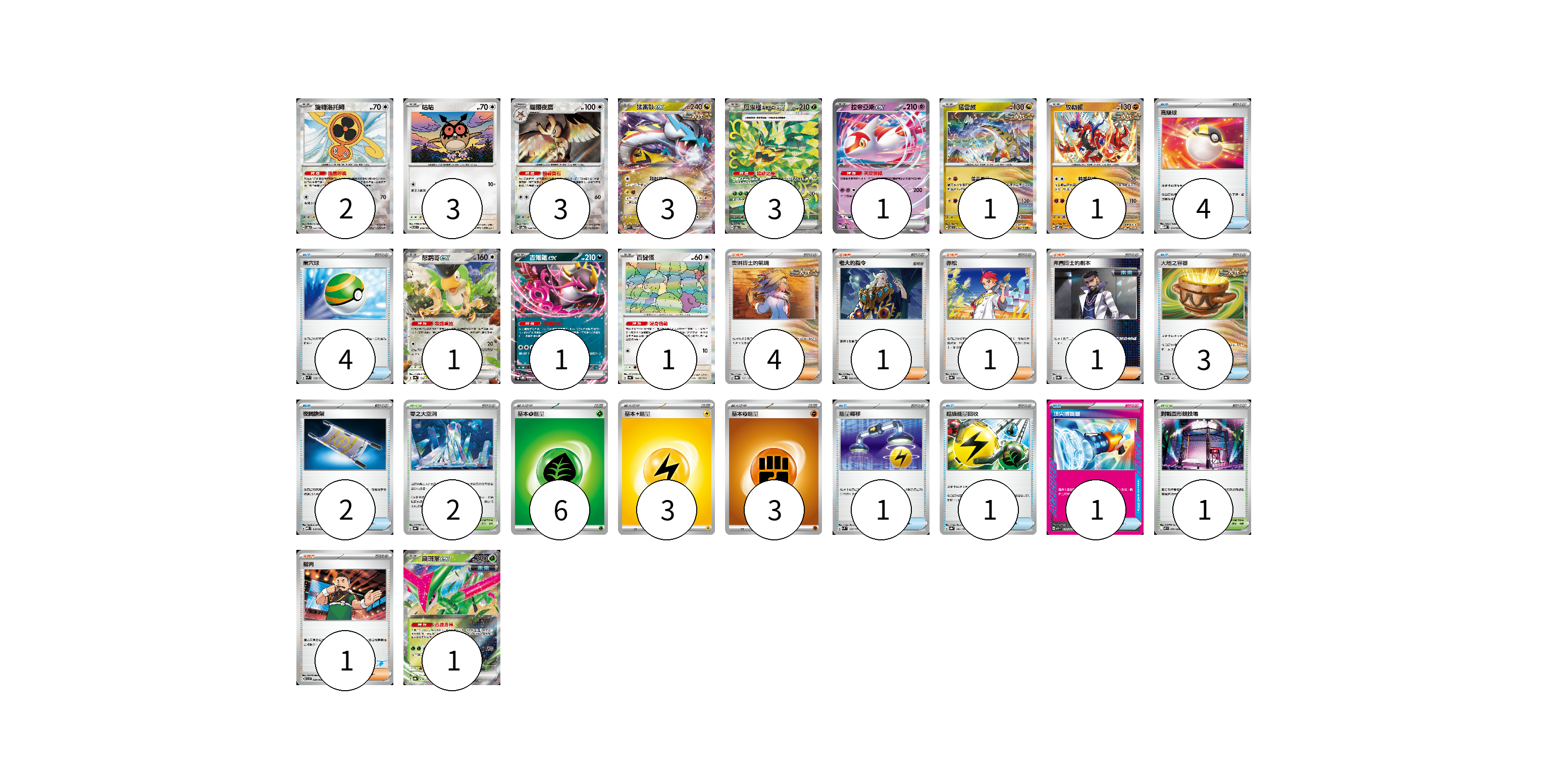 牌組構築方案 以此牌組為基礎新構築牌組 顯示卡面 顯示列表 寶可夢卡(21) 2 3 3 3 3 1 1 1 1 1 1 1 物品卡(16) 4 4 3 2 1 1 1 支援者卡(8) 4 1 1 1 1 競技場卡(3) 2 1 能量卡(12) 6 3 3 寶可夢卡(21) 卡牌名稱 張數 卡牌名稱 張數 旋轉洛托姆 SV8a 131/187 02 咕咕 SV7 076/102 03 貓頭夜鷹 SV8a 128/187 03 猛雷鼓ex SV5K 053/071 03 厄鬼椪 碧草面具ex SV6 125/101 03 拉帝亞斯ex MBD 003/022 01 猛雷鼓 SV7 075/102 01 故勒頓 SV8 069/106 01 怒鸚哥ex SV4a 154/190 01 吉雉雞ex SVOD 004/020 01 百變怪 SV4a 144/190 01 鐵斑葉ex SV8a 016/187 01 物品卡(16) 卡牌名稱 張數 卡牌名稱 張數 高級球 MBD 014/022 04 巢穴球 SVM 133/175 04 大地之容器 SV8a 143/187 03 夜間擔架 MBD 016/022 02 能量轉移 SVM 127/175 01 超級能量回收 SV8a 141/187 01 頂尖捕捉器 MBG 014/022 01 支援者卡(8) 卡牌名稱 張數 卡牌名稱 張數 奧琳博士的氣魄 SV8a 167/187 04 老大的指令 MBD 020/022 01 赤松 SV8a 163/187 01 弗圖博士的劇本 SV8a 175/187 01 裁判 SVI 059/066 01 競技場卡(3) 卡牌名稱 張數 卡牌名稱 張數 零之大空洞 SV8a 182/187 02 對戰圓形競技場 M2 079/080 01 能量卡(12) 卡牌名稱 張數 卡牌名稱 張數 基本草能量 sv-p GRA 06 基本雷能量 sv-p LIG 03 基本鬥能量 sv-p FIG 03 以此牌組為基礎新構築牌組 牌組編碼 xnrnfL-CWtHHT-asGuKR copy 列印牌組單 牌組編碼已複製 分享至SNS