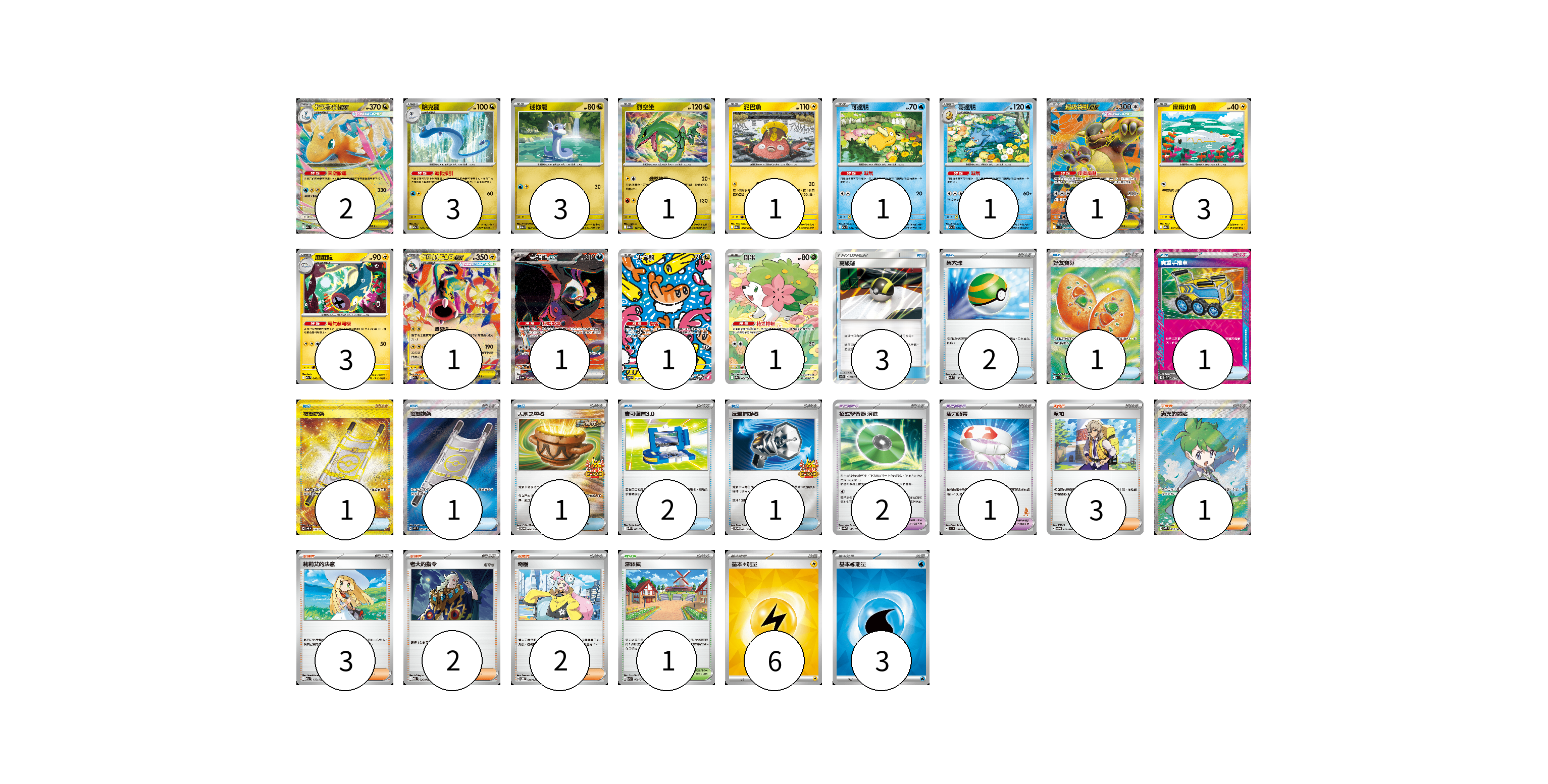 牌組構築方案 以此牌組為基礎新構築牌組 顯示卡面 顯示列表 寶可夢卡(23) 2 3 3 1 1 1 1 1 3 3 1 1 1 1 寶可夢道具(3) 2 1 物品卡(13) 3 2 1 1 1 1 1 2 1 支援者卡(11) 3 1 3 2 2 競技場卡(1) 1 能量卡(9) 6 3 寶可夢卡(23) 卡牌名稱 張數 卡牌名稱 張數 超級快龍ex M2a 126/193 02 哈克龍 M2a 125/193 03 迷你龍 M2a 124/193 03 烈空坐 M2a 127/193 01 泥巴魚 M2a 050/193 01 可達鴨 M2a 032/193 01 哥達鴨 M2a 033/193 01 超級袋獸ex M1S 080/063 01 麻麻小魚 M2a 047/193 03 麻麻鰻 M2a 048/193 03 超級麻麻鰻魚王ex M2a 049/193 01 吉雉雞ex SV6a 089/064 01 米立龍 SV6 112/101 01 謝米 SV9a 066/063 01 寶可夢道具(3) 卡牌名稱 張數 卡牌名稱 張數 招式學習器 演進 SV8a 160/187 02 活力頭帶 SVI 057/066 01 物品卡(13) 卡牌名稱 張數 卡牌名稱 張數 高級球 AS5b 178/186 03 巢穴球 SVM 133/175 02 好友寶芬 M1S 081/063 01 貴重手推車 SVK 020/042 01 夜間擔架 SV8 137/106 01 夜間擔架 M1L 083/063 01 大地之容器 SV-P 084/SV-P 01 寶可裝置3.0 SV11B 081/086 02 反擊捕捉器 SV-P 083/SV-P 01 支援者卡(11) 卡牌名稱 張數 卡牌名稱 張數 派帕 SVOD 018/020 03 滿充的體貼 M1S 085/063 01 莉莉艾的決意 M2a 175/193 03 老大的指令 MBD 020/022 02 奇樹 SVOD 016/020 02 競技場卡(1) 卡牌名稱 張數 卡牌名稱 張數 深缽鎮 SVK 039/042 01 能量卡(9) 卡牌名稱 張數 卡牌名稱 張數 基本【雷】能量 SVQP LIG 06 基本【水】能量 SVK WAT 03 以此牌組為基礎新構築牌組 牌組編碼 xqzJco-uYeexl-vKxQir copy 列印牌組單 牌組編碼已複製 分享至SNS