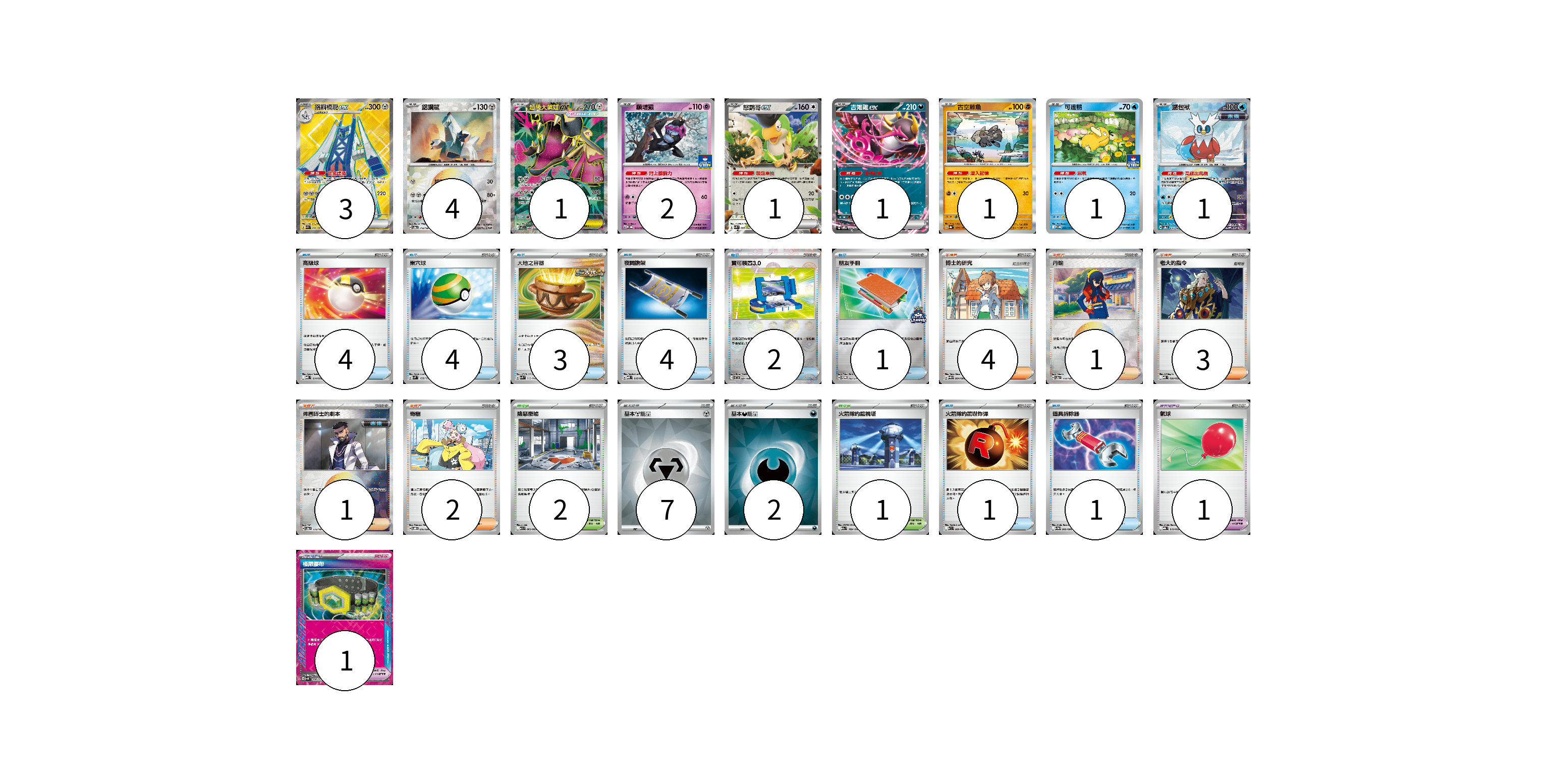 牌組構築方案 以此牌組為基礎新構築牌組 顯示卡面 顯示列表 寶可夢卡(15) 3 4 1 2 1 1 1 1 1 寶可夢道具(2) 1 1 物品卡(20) 4 4 3 4 2 1 1 1 支援者卡(11) 4 1 3 1 2 競技場卡(3) 2 1 能量卡(9) 7 2 寶可夢卡(15) 卡牌名稱 張數 卡牌名稱 張數 鋁鋼橋龍ex SV7a 080/064 03 鋁鋼龍 SV8a 112/187 04 超級大嘴娃ex M1L 080/063 01 願增猿 M-P 014/M-P 02 怒鸚哥ex SVK 006/042 01 吉雉雞ex SVOM 009/021 01 古空棘魚 SV8a 079/187 01 可達鴨 SV-P 220/SV-P 01 鐵包袱 SV8a 047/187 01 寶可夢道具(2) 卡牌名稱 張數 卡牌名稱 張數 氣球 MBG 019/022 01 極限腰帶 SV5K 066/071 01 物品卡(20) 卡牌名稱 張數 卡牌名稱 張數 高級球 MBD 014/022 04 巢穴球 SVM 133/175 04 大地之容器 SVK 012/042 03 夜間擔架 MBD 016/022 04 寶可裝置3.0 SV11B 081/086 02 朋友手冊 SV-P 182/SV-P 01 火箭隊的驚嚇炸彈 SV10 089/098 01 道具拆除器 SV11W 080/086 01 支援者卡(11) 卡牌名稱 張數 卡牌名稱 張數 博士的研究 SV11B 084/086 04 丹瑜 SV8a 170/187 01 老大的指令 MBD 020/022 03 弗圖博士的劇本 SV8a 175/187 01 奇樹 SVOD 016/020 02 競技場卡(3) 卡牌名稱 張數 卡牌名稱 張數 險惡廢墟 M1L 063/063 02 火箭隊的監視塔 M2a 189/193 01 能量卡(9) 卡牌名稱 張數 卡牌名稱 張數 基本【鋼】能量 SVOD MET 07 基本【惡】能量 SVOM DAR 02 以此牌組為基礎新構築牌組 牌組編碼 xrUCJp-ZLPODq-BkwZHK copy 列印牌組單 牌組編碼已複製 分享至SNS