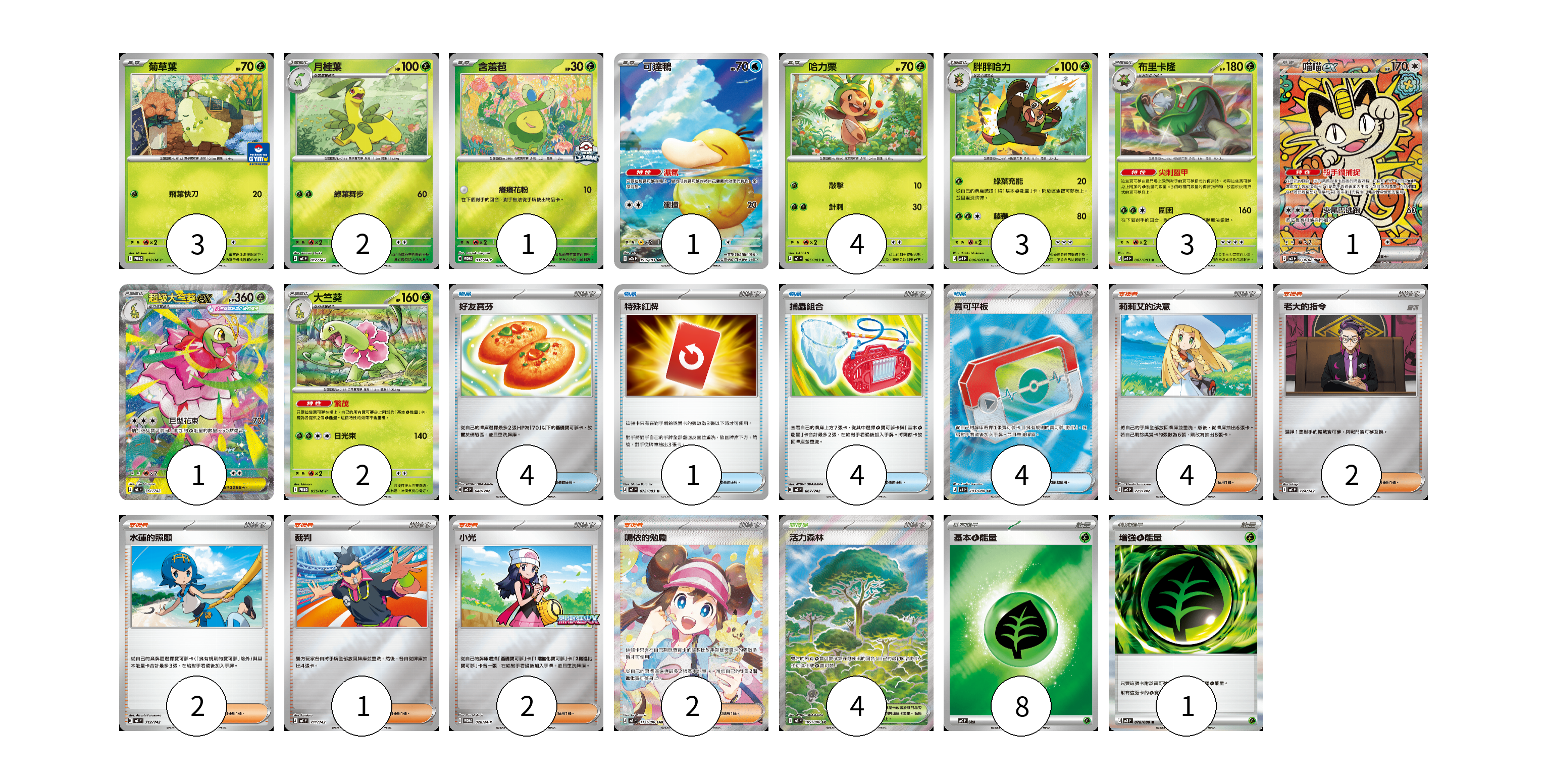 牌組構築方案 以此牌組為基礎新構築牌組 顯示卡面 顯示列表 寶可夢卡(21) 3 2 1 1 4 3 3 1 1 2 物品卡(13) 4 1 4 4 支援者卡(13) 4 2 2 1 2 2 競技場卡(4) 4 能量卡(9) 8 1 寶可夢卡(21) 卡牌名稱 張數 卡牌名稱 張數 菊草葉 M-P 012/M-P 03 月桂葉 MC 017/742 02 含羞苞 M-P 037/M-P 01 可達鴨 M2a 199/193 01 哈力栗 M4 005/083 04 胖胖哈力 M4 006/083 03 布里卡隆 M4 007/083 03 喵喵ex M3 114/080 01 超級大竺葵ex MC 761/742 01 大竺葵 M-P 055/M-P 02 物品卡(13) 卡牌名稱 張數 卡牌名稱 張數 好友寶芬 MC 648/742 04 特殊紅牌 M4 072/083 01 捕蟲組合 MC 667/742 04 寶可平板 M3 103/080 04 支援者卡(13) 卡牌名稱 張數 卡牌名稱 張數 莉莉艾的決意 MC 729/742 04 老大的指令 MC 724/742 02 水蓮的照顧 MC 712/742 02 裁判 MC 711/742 01 小光 M-P 028/M-P 02 鳴依的勉勵 M3 115/080 02 競技場卡(4) 卡牌名稱 張數 卡牌名稱 張數 活力森林 M3 109/080 04 能量卡(9) 卡牌名稱 張數 卡牌名稱 張數 基本【草】能量 MC GRA 08 增強【草】能量 M3 078/080 01 以此牌組為基礎新構築牌組 牌組編碼 xrhcBf-yAcsGf-BjhTef copy 列印牌組單 牌組編碼已複製 分享至SNS