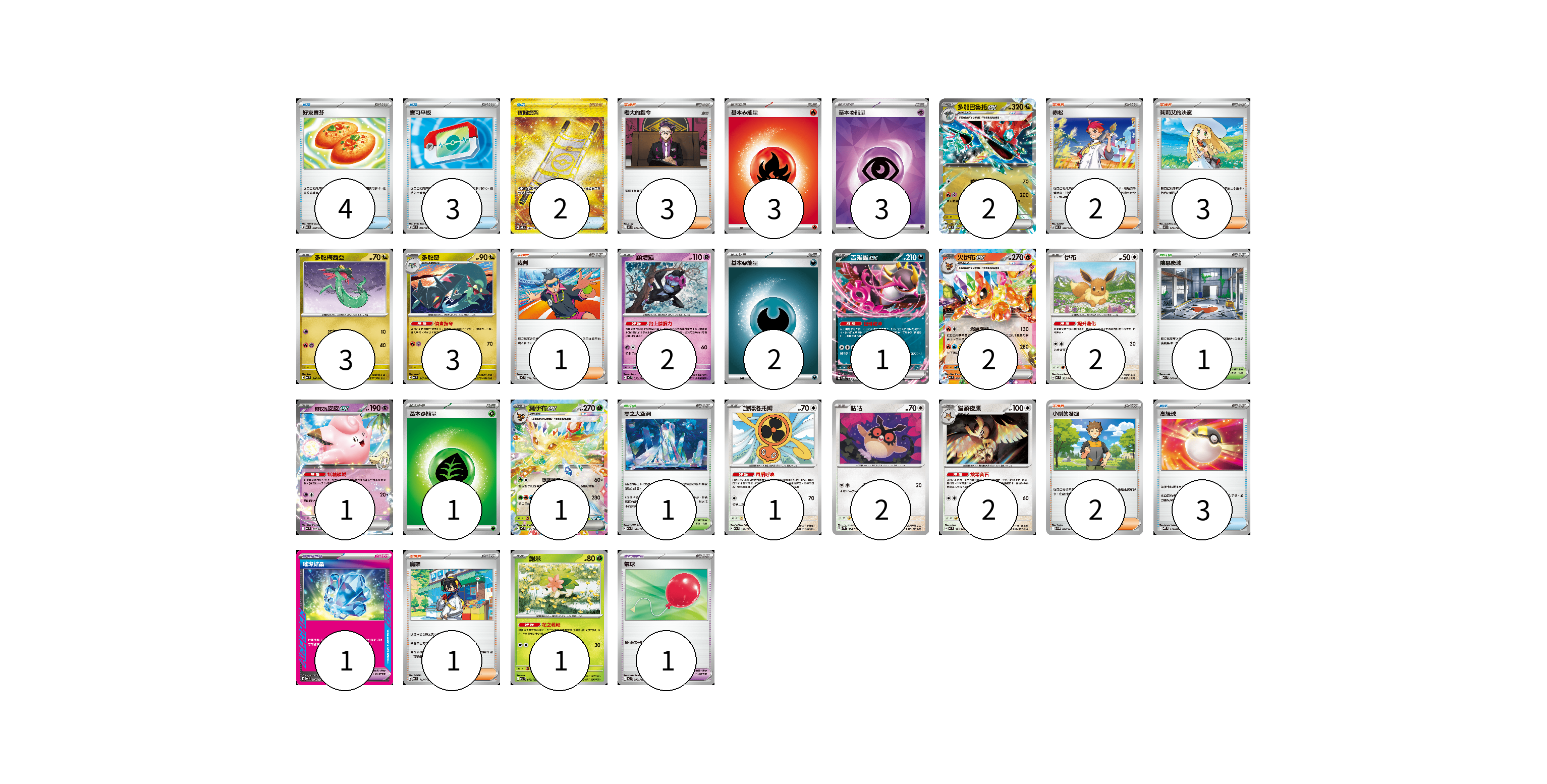 牌組構築方案 以此牌組為基礎新構築牌組 顯示卡面 顯示列表 寶可夢卡(23) 2 3 3 2 1 2 2 1 1 1 2 2 1 寶可夢道具(2) 1 1 物品卡(12) 4 3 2 3 支援者卡(12) 3 2 3 1 2 1 競技場卡(2) 1 1 能量卡(9) 3 3 2 1 寶可夢卡(23) 卡牌名稱 張數 卡牌名稱 張數 多龍巴魯托ex MC 548/742 02 多龍梅西亞 MC 546/742 03 多龍奇 MC 547/742 03 願增猿 MC 358/742 02 吉雉雞ex SVOD 004/020 01 火伊布ex MC 094/742 02 伊布 MC 565/742 02 <莉莉艾的>皮皮ex MC 287/742 01 葉伊布ex MC 038/742 01 旋轉洛托姆 M2a 139/193 01 咕咕 SV5K 054/071 02 貓頭夜鷹 MC 573/742 02 謝米 M2a 012/193 01 寶可夢道具(2) 卡牌名稱 張數 卡牌名稱 張數 璀璨結晶 MC 680/742 01 氣球 MC 688/742 01 物品卡(12) 卡牌名稱 張數 卡牌名稱 張數 好友寶芬 MC 648/742 04 寶可平板 M3 070/080 03 夜間擔架 SV8 137/106 02 高級球 MBD 014/022 03 支援者卡(12) 卡牌名稱 張數 卡牌名稱 張數 老大的指令 MC 724/742 03 赤松 MC 696/742 02 莉莉艾的決意 MC 729/742 03 裁判 MC 711/742 01 小剛的發掘 SV9 096/100 02 烏栗 MC 713/742 01 競技場卡(2) 卡牌名稱 張數 卡牌名稱 張數 險惡廢墟 M1L 063/063 01 零之大空洞 M2a 184/193 01 能量卡(9) 卡牌名稱 張數 卡牌名稱 張數 基本【火】能量 MC FIR 03 基本【超】能量 SVOD PSY 03 基本【惡】能量 MC DAR 02 基本【草】能量 MC GRA 01 以此牌組為基礎新構築牌組 牌組編碼 xtKtby-DSUXyS-tMqakx copy 列印牌組單 牌組編碼已複製 分享至SNS