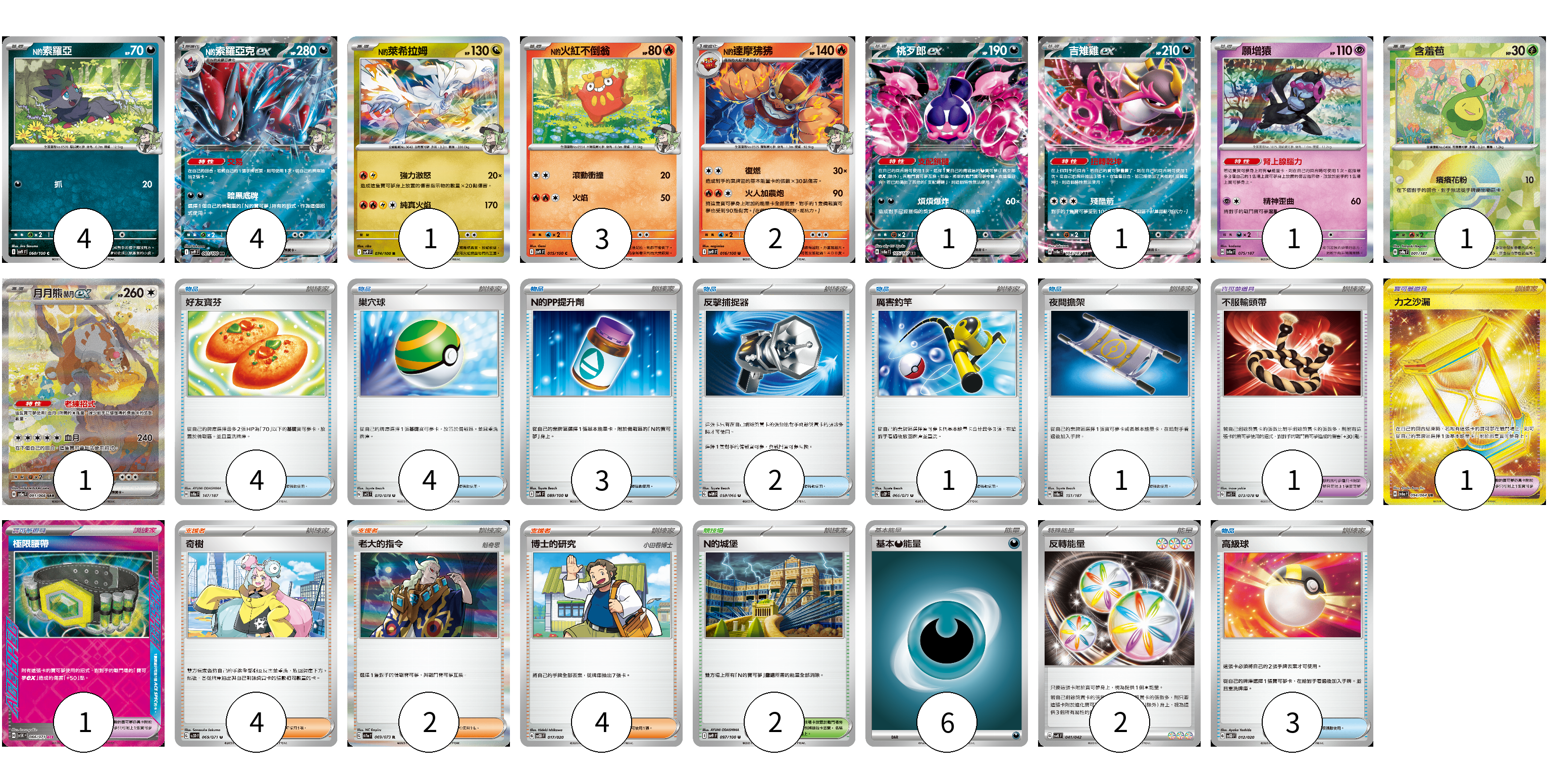 牌組構築方案 以此牌組為基礎新構築牌組 顯示卡面 顯示列表 寶可夢卡(19) 4 4 1 3 2 1 1 1 1 1 寶可夢道具(3) 1 1 1 物品卡(18) 4 4 3 2 1 1 3 支援者卡(10) 4 2 4 競技場卡(2) 2 能量卡(8) 6 2 寶可夢卡(19) 卡牌名稱 張數 卡牌名稱 張數 N的索羅亞 SV9 060/100 04 N的索羅亞克ex SV9 061/100 04 N的萊希拉姆 SV9 074/100 01 N的火紅不倒翁 SV9 015/100 03 N的達摩狒狒 SV9 016/100 02 桃歹郎ex SV8a 105/187 01 吉雉雞ex SV8a 104/187 01 願增猿 SV8a 075/187 01 含羞苞 SV8a 001/187 01 月月熊 赫月 ex SV5a 091/066 01 寶可夢道具(3) 卡牌名稱 張數 卡牌名稱 張數 不服輸頭帶 SV1S 073/078 01 力之沙漏 SV6a 094/064 01 極限腰帶 SV5K 066/071 01 物品卡(18) 卡牌名稱 張數 卡牌名稱 張數 好友寶芬 SV8a 147/187 04 巢穴球 SV1S 070/078 04 N的PP提升劑 SV9 089/100 03 反擊捕捉器 SV4M 059/066 02 厲害釣竿 SV2P 066/071 01 夜間擔架 SV8a 151/187 01 高級球 SVOD 012/020 03 支援者卡(10) 卡牌名稱 張數 卡牌名稱 張數 奇樹 SV2D 069/071 04 老大的指令 SV1a 069/073 02 博士的研究 SVOD 017/020 04 競技場卡(2) 卡牌名稱 張數 卡牌名稱 張數 N的城堡 SV9 097/100 02 能量卡(8) 卡牌名稱 張數 卡牌名稱 張數 基本【惡】能量 SVF DAR 06 反轉能量 SVK 041/042 02 以此牌組為基礎新構築牌組 牌組編碼 xtvVdO-dgOTlD-VEzfYr copy 列印牌組單 牌組編碼已複製 分享至SNS
