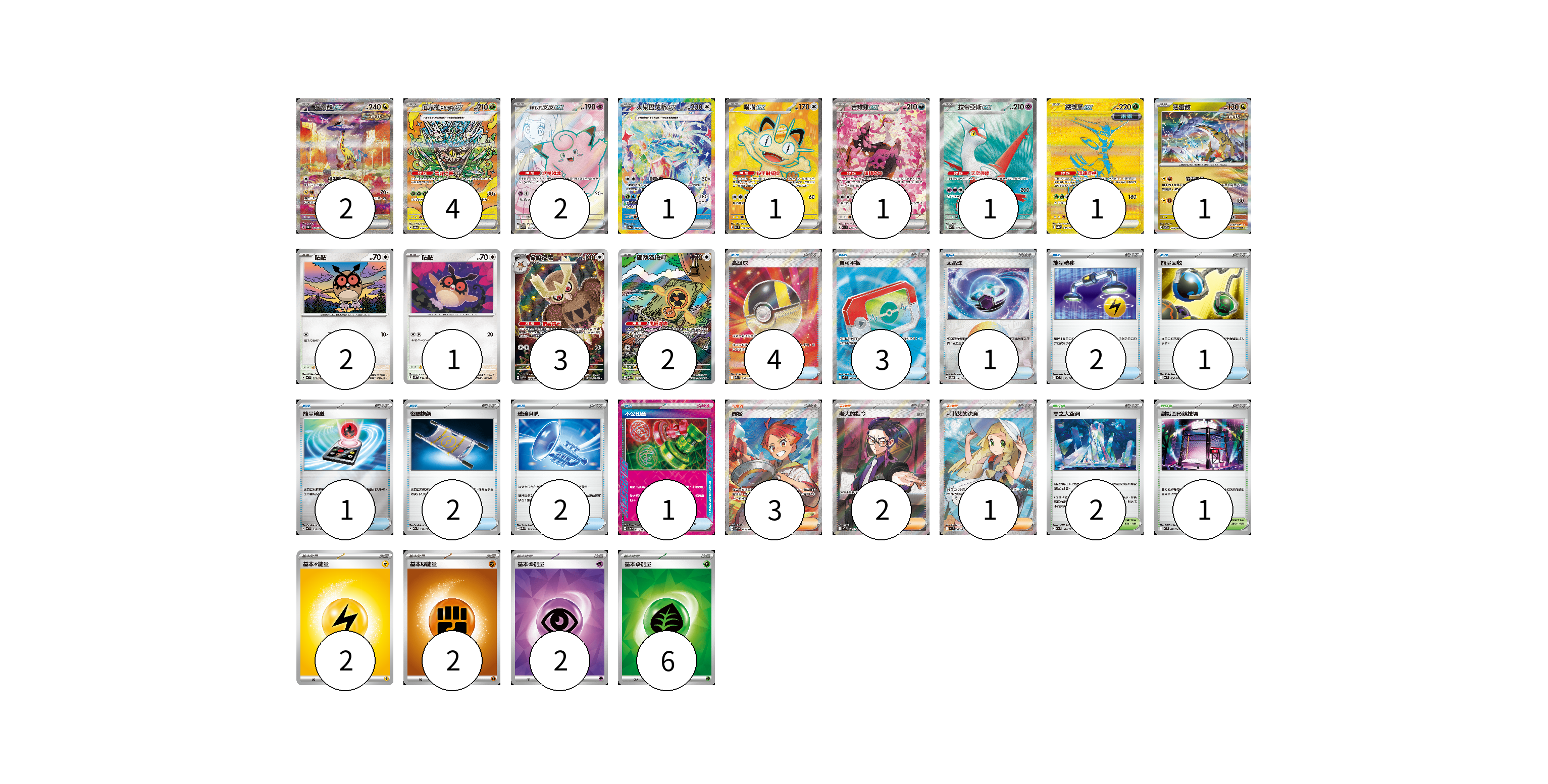 牌組構築方案 以此牌組為基礎新構築牌組 顯示卡面 顯示列表 寶可夢卡(22) 2 4 2 1 1 1 1 1 1 2 1 3 2 物品卡(17) 4 3 1 2 1 1 2 2 1 支援者卡(6) 3 2 1 競技場卡(3) 2 1 能量卡(12) 2 2 2 6 寶可夢卡(22) 卡牌名稱 張數 卡牌名稱 張數 猛雷鼓ex SV5K 095/071 02 厄鬼椪 碧草面具ex SV8a 201/187 04 莉莉艾的皮皮ex SV9 115/100 02 太樂巴戈斯ex SV8a 226/187 01 喵喵ex M3 100/080 01 吉雉雞ex M2a 244/193 01 拉帝亞斯ex SV7a 078/064 01 鐵斑葉ex SV8a 233/187 01 猛雷鼓 SV7 075/102 01 咕咕 MC 572/742 02 咕咕 SV5K 054/071 01 貓頭夜鷹 SV7 114/102 03 旋轉洛托姆 M2a 213/193 02 物品卡(17) 卡牌名稱 張數 卡牌名稱 張數 高級球 M2a 216/193 04 寶可平板 M3 103/080 03 太晶珠 SV8a 145/187 01 能量轉移 MC 638/742 02 能量回收 MC 636/742 01 能量輸送 MC 639/742 01 夜間擔架 M2a 159/193 02 玻璃喇叭 M2a 149/193 02 不公印章 SV5a 053/066 01 支援者卡(6) 卡牌名稱 張數 卡牌名稱 張數 赤松 SV7 123/102 03 老大的指令(烏羽) MC 760/742 02 莉莉艾的決意 M1L 086/063 01 競技場卡(3) 卡牌名稱 張數 卡牌名稱 張數 零之大空洞 M2a 184/193 02 對戰圓形競技場 M2 079/080 01 能量卡(12) 卡牌名稱 張數 卡牌名稱 張數 基本【雷】能量 MJ LIG 02 基本【鬥】能量 MC FIG 02 基本【超】能量 SVM PSY 02 基本【草】能量 SVM GRA 06 以此牌組為基礎新構築牌組 牌組編碼 xvAZvT-mcjyrf-dWxIAz copy 列印牌組單 牌組編碼已複製 分享至SNS
