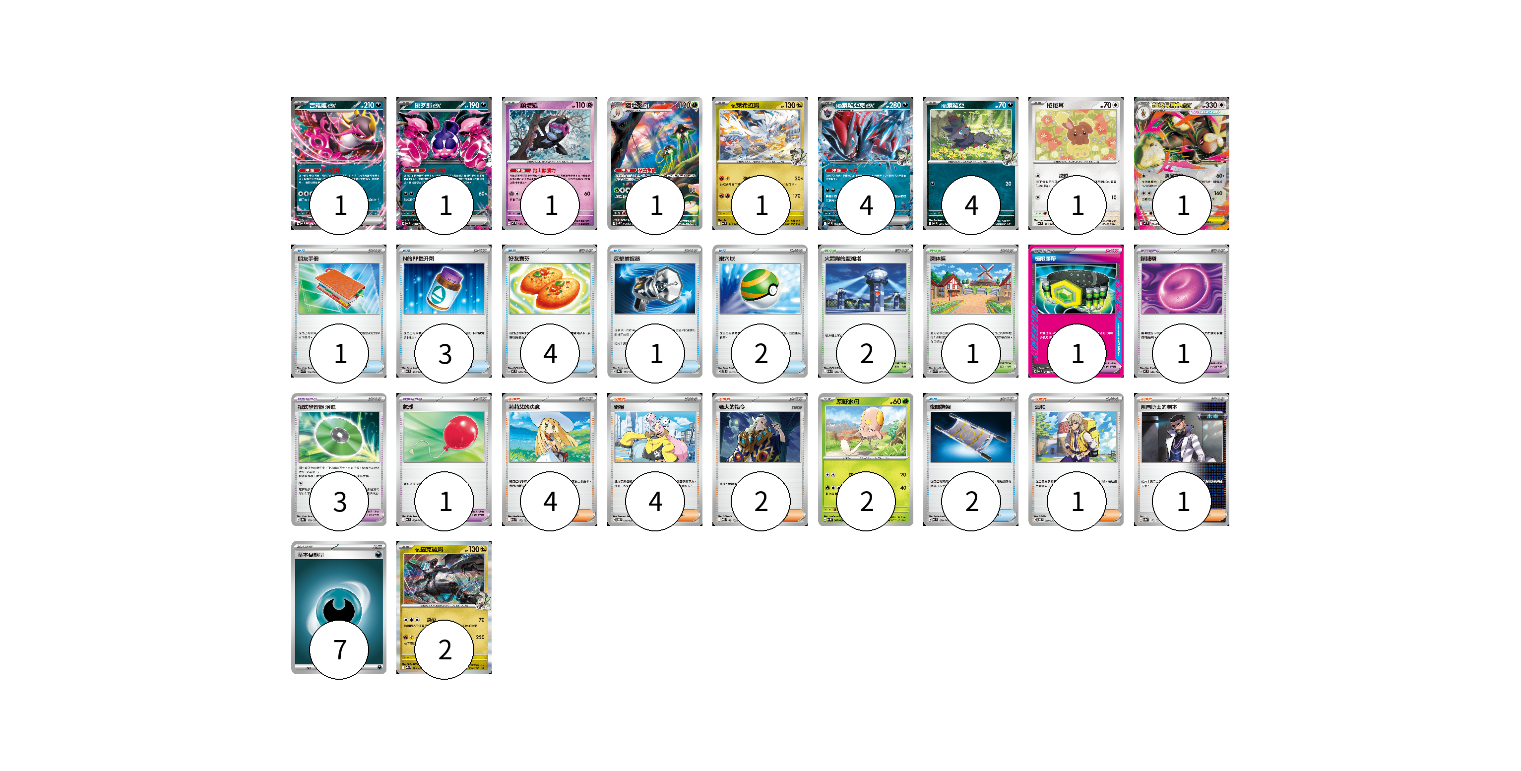 牌組構築方案 以此牌組為基礎新構築牌組 顯示卡面 顯示列表 寶可夢卡(19) 1 1 1 1 1 4 4 1 1 2 2 寶可夢道具(6) 1 1 3 1 物品卡(13) 1 3 4 1 2 2 支援者卡(12) 4 4 2 1 1 競技場卡(3) 2 1 能量卡(7) 7 寶可夢卡(19) 卡牌名稱 張數 卡牌名稱 張數 吉雉雞ex MC 489/742 01 桃歹郎ex MC 491/742 01 願增猿 MC 358/742 01 陸地水母 SV4M 068/066 01 <N的>萊希拉姆 MC 545/742 01 <N的>索羅亞克ex MC 470/742 04 <N的>索羅亞 MC 469/742 04 捲捲耳 MC 593/742 01 超級長耳兔ex M2 072/080 01 原野水母 SV4M 007/066 02 N的捷克羅姆 M2a 129/193 02 寶可夢道具(6) 卡牌名稱 張數 卡牌名稱 張數 極限腰帶 MC 691/742 01 鎖鏈糬 MC 681/742 01 招式學習器 演進 SV8a 160/187 03 氣球 MC 688/742 01 物品卡(13) 卡牌名稱 張數 卡牌名稱 張數 朋友手冊 SVK 014/042 01 N的PP提升劑 MC 635/742 03 好友寶芬 MC 648/742 04 反擊捕捉器 SV8a 139/187 01 巢穴球 SVTS 013/022 02 夜間擔架 MC 670/742 02 支援者卡(12) 卡牌名稱 張數 卡牌名稱 張數 莉莉艾的決意 M2a 175/193 04 奇樹 SVOD 016/020 04 老大的指令 MBG 021/022 02 派帕 SVOD 018/020 01 弗圖博士的劇本 SV8a 175/187 01 競技場卡(3) 卡牌名稱 張數 卡牌名稱 張數 火箭隊的監視塔 M2a 189/193 02 深缽鎮 SVK 039/042 01 能量卡(7) 卡牌名稱 張數 卡牌名稱 張數 基本惡能量 sv-p DAR 07 以此牌組為基礎新構築牌組 牌組編碼 xvCFAh-INCUcR-zoOSCZ copy 列印牌組單 牌組編碼已複製 分享至SNS