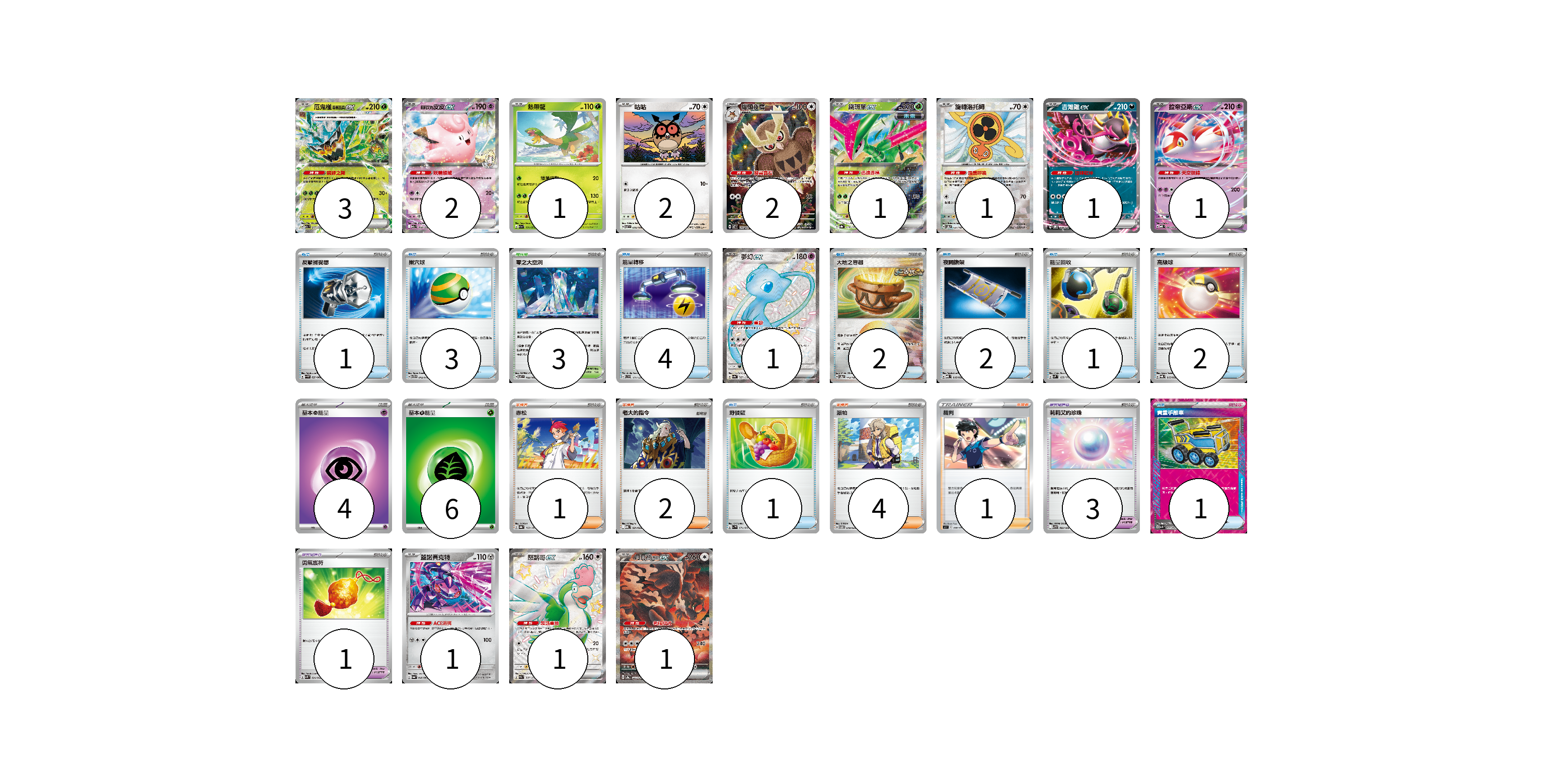 牌組構築方案 以此牌組為基礎新構築牌組 顯示卡面 顯示列表 寶可夢卡(18) 3 2 1 2 2 1 1 1 1 1 1 1 1 寶可夢道具(4) 3 1 物品卡(17) 1 3 4 2 2 1 2 1 1 支援者卡(8) 1 2 4 1 競技場卡(3) 3 能量卡(10) 4 6 寶可夢卡(18) 卡牌名稱 張數 卡牌名稱 張數 厄鬼椪 碧草面具ex M2a 017/193 03 莉莉艾的皮皮ex M2a 060/193 02 熱帶龍 SV1a 001/073 01 咕咕 SV7 076/102 02 貓頭夜鷹 SV7 114/102 02 鐵斑葉ex SV8a 016/187 01 旋轉洛托姆 SV8a 131/187 01 吉雉雞ex SVOM 009/021 01 拉帝亞斯ex MBD 003/022 01 夢幻ex SV4a 327/190 01 蓋諾賽克特 SV6a 040/064 01 怒鸚哥ex SV4a 337/190 01 月月熊 赫月ex SV8a 225/187 01 寶可夢道具(4) 卡牌名稱 張數 卡牌名稱 張數 莉莉艾的珍珠 SV9 093/100 03 勇氣護符 SVK 024/042 01 物品卡(17) 卡牌名稱 張數 卡牌名稱 張數 反擊捕捉器 SV4M 059/066 01 巢穴球 SVTG 012/019 03 能量轉移 SVD 111/139 04 大地之容器 SV8a 143/187 02 夜間擔架 MBD 016/022 02 能量回收 SVM 125/175 01 高級球 SVQL 015/022 02 野餐籃 SV1V 071/078 01 貴重手推車 SVK 020/042 01 支援者卡(8) 卡牌名稱 張數 卡牌名稱 張數 赤松 SV8a 163/187 01 老大的指令 MBG 021/022 02 派帕 SVTM 019/022 04 裁判 SI 398/414 01 競技場卡(3) 卡牌名稱 張數 卡牌名稱 張數 零之大空洞 SV7 102/102 03 能量卡(10) 卡牌名稱 張數 卡牌名稱 張數 基本超能量 sv-p PSY 04 基本草能量 sv-p GRA 06 以此牌組為基礎新構築牌組 牌組編碼 xvqXaL-ZvPudm-KuFacc copy 列印牌組單 牌組編碼已複製 分享至SNS