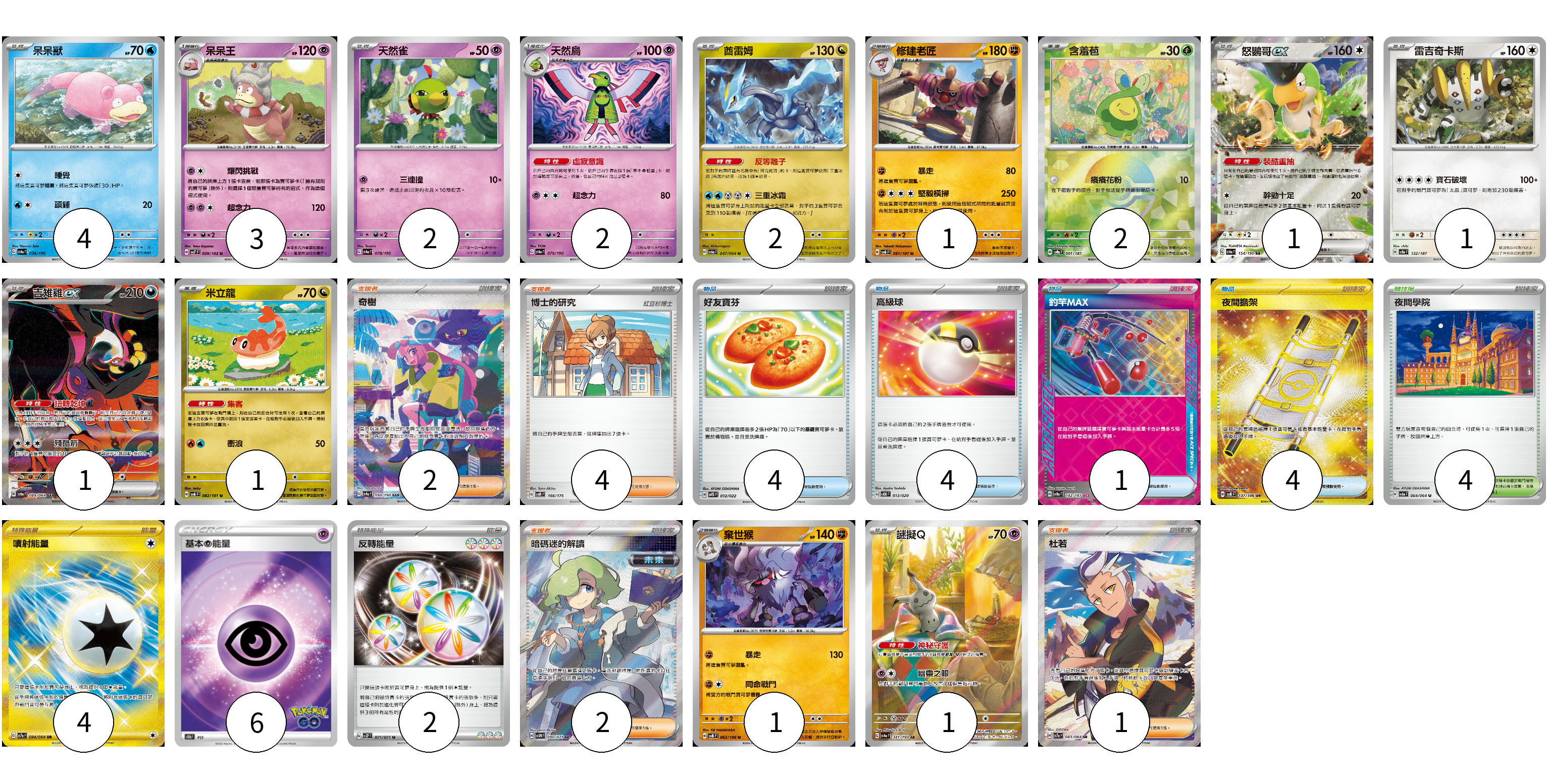牌組構築方案 以此牌組為基礎新構築牌組 顯示卡面 顯示列表 寶可夢卡(22) 4 3 2 2 2 1 2 1 1 1 1 1 1 物品卡(13) 4 4 1 4 支援者卡(9) 2 4 2 1 競技場卡(4) 4 能量卡(12) 4 6 2 寶可夢卡(22) 卡牌名稱 張數 卡牌名稱 張數 呆呆獸 SV4a 036/190 04 呆呆王 SV7 039/102 03 天然雀 SV4a 078/190 02 天然鳥 SV4a 079/190 02 酋雷姆 SV6a 047/064 02 修建老匠 SV6 061/101 01 含羞苞 SV8a 001/187 02 怒鸚哥ex SV4a 154/190 01 雷吉奇卡斯 SV8a 132/187 01 吉雉雞ex SV6a 089/064 01 米立龍 SV6 082/101 01 棄世猴 SV8 062/106 01 謎擬Q SV4a 341/190 01 物品卡(13) 卡牌名稱 張數 卡牌名稱 張數 好友寶芬 SVTS 012/022 04 高級球 SVEM 013/020 04 釣竿MAX SV8a 142/187 01 夜間擔架 SV8 137/106 04 支援者卡(9) 卡牌名稱 張數 卡牌名稱 張數 奇樹 SV4a 350/190 02 博士的研究 SVM 166/175 04 暗碼迷的解讀 SV5M 090/071 02 杜若 SV7a 083/064 01 競技場卡(4) 卡牌名稱 張數 卡牌名稱 張數 夜間學院 SV6a 064/064 04 能量卡(12) 卡牌名稱 張數 卡牌名稱 張數 噴射能量 SV7a 094/064 04 基本超能量 S10b PSY 06 反轉能量 SV2P 071/071 02 以此牌組為基礎新構築牌組 牌組編碼 xwZxCO-QtpHbf-nxHyCs copy 列印牌組單 牌組編碼已複製 分享至SNS
