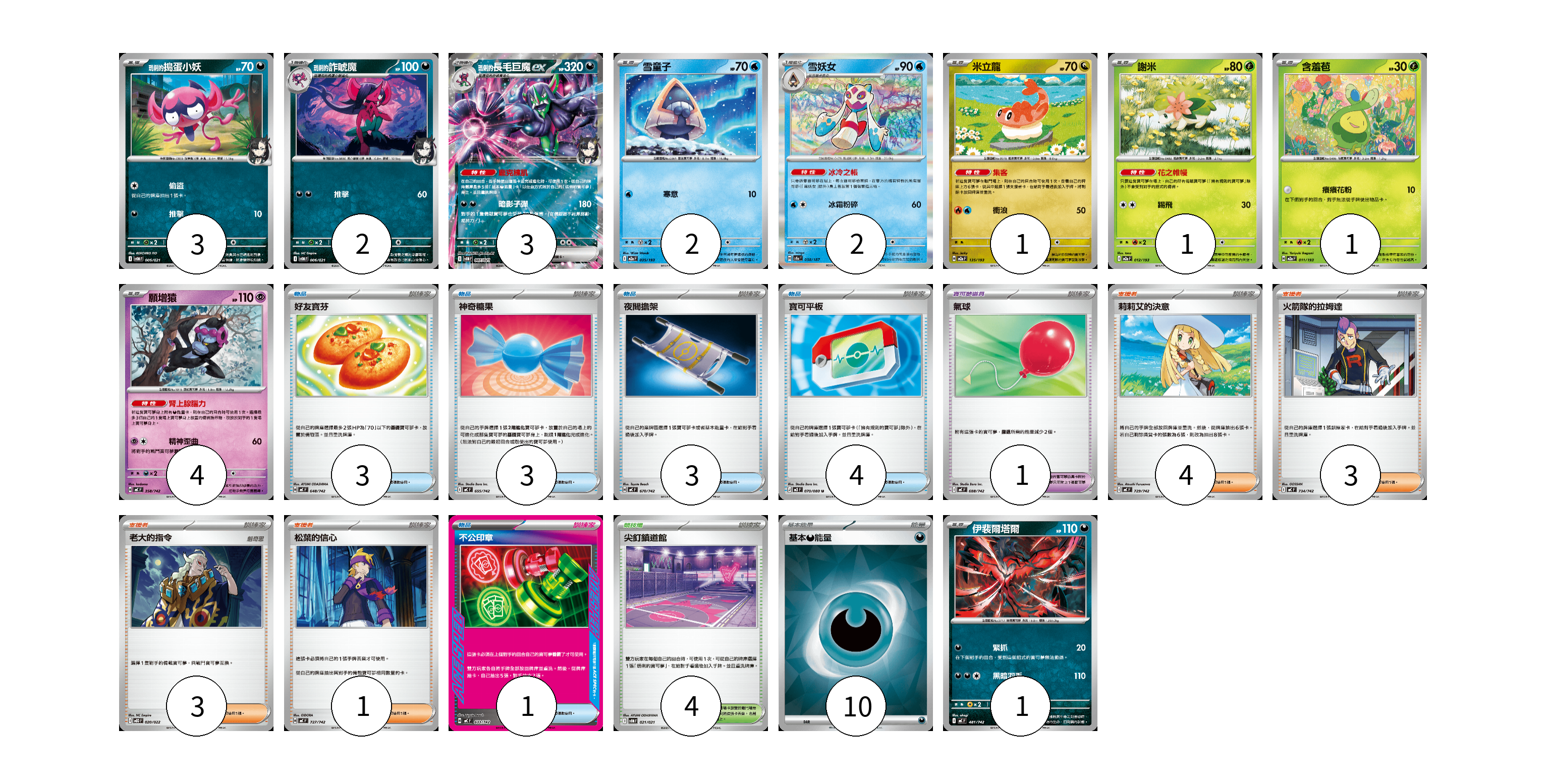 牌組構築方案 以此牌組為基礎新構築牌組 顯示卡面 顯示列表 寶可夢卡(20) 3 2 3 2 2 1 1 1 4 1 寶可夢道具(1) 1 物品卡(14) 3 3 3 4 1 支援者卡(11) 4 3 3 1 競技場卡(4) 4 能量卡(10) 10 寶可夢卡(20) 卡牌名稱 張數 卡牌名稱 張數 <瑪俐的>搗蛋小妖 SVOM 005/021 03 <瑪俐的>詐唬魔 SVOM 006/021 02 <瑪俐的>長毛巨魔ex SVOM 007/021 03 雪童子 M2a 035/193 02 雪妖女 SV8a 038/187 02 米立龍 M2a 135/193 01 謝米 M2a 012/193 01 含羞苞 M2a 011/193 01 願增猿 MC 358/742 04 伊裴爾塔爾 MC 481/742 01 寶可夢道具(1) 卡牌名稱 張數 卡牌名稱 張數 氣球 MC 688/742 01 物品卡(14) 卡牌名稱 張數 卡牌名稱 張數 好友寶芬 MC 648/742 03 神奇糖果 MC 655/742 03 夜間擔架 MC 670/742 03 寶可平板 M3 070/080 04 不公印章 MC 633/742 01 支援者卡(11) 卡牌名稱 張數 卡牌名稱 張數 莉莉艾的決意 MC 729/742 04 火箭隊的拉姆達 MC 734/742 03 老大的指令 MBD 020/022 03 松葉的信心 MC 727/742 01 競技場卡(4) 卡牌名稱 張數 卡牌名稱 張數 尖釘鎮道館 SVOM 021/021 04 能量卡(10) 卡牌名稱 張數 卡牌名稱 張數 基本【惡】能量 SVOM DAR 10 以此牌組為基礎新構築牌組 牌組編碼 xxYOqu-goJJpI-ycoOCo copy 列印牌組單 牌組編碼已複製 分享至SNS