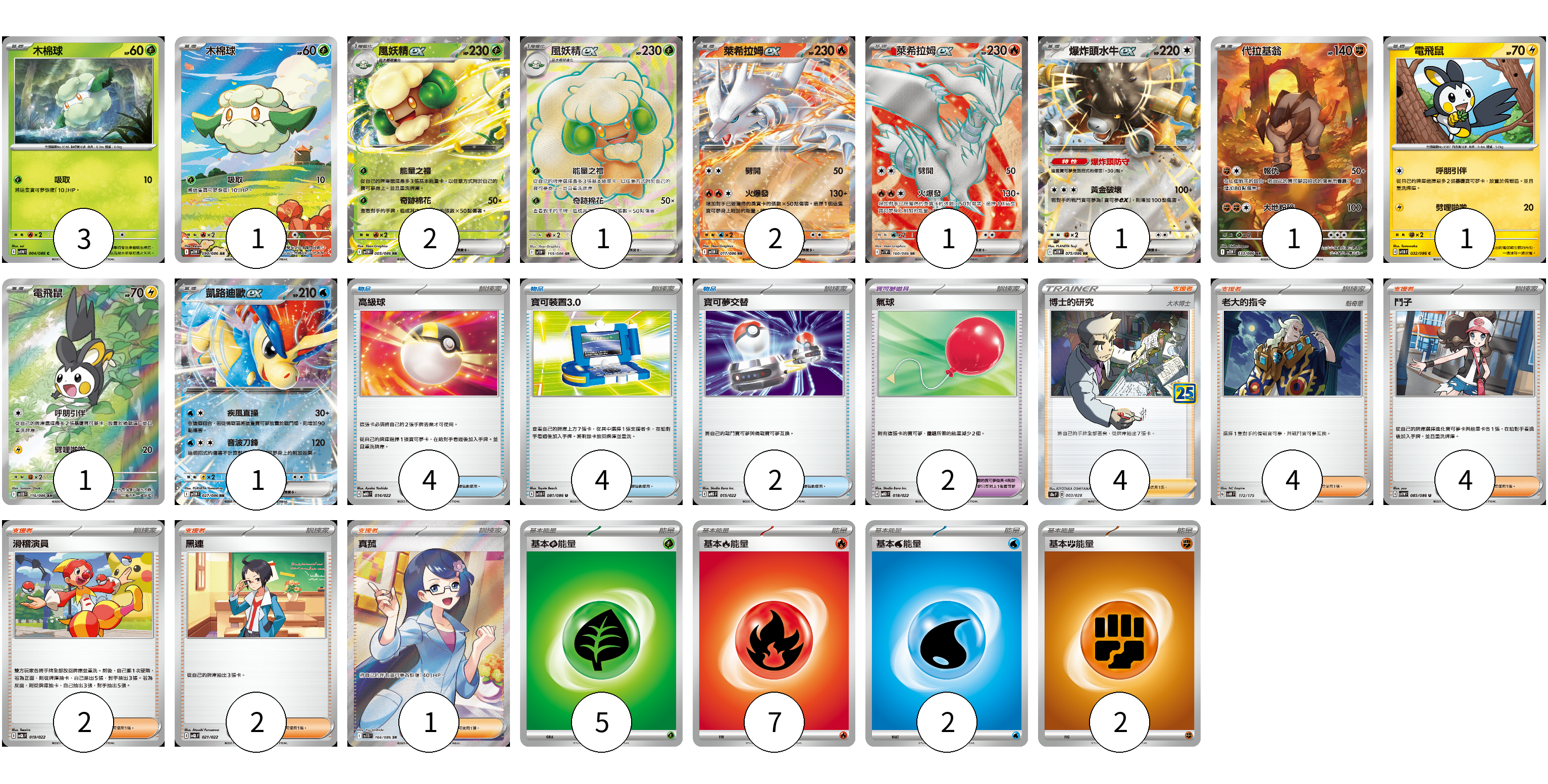 牌組構築方案 以此牌組為基礎新構築牌組 顯示卡面 顯示列表 寶可夢卡(15) 3 1 2 1 2 1 1 1 1 1 1 寶可夢道具(2) 2 物品卡(10) 4 4 2 支援者卡(17) 4 4 4 2 2 1 能量卡(16) 5 7 2 2 寶可夢卡(15) 卡牌名稱 張數 卡牌名稱 張數 木棉球 SV11W 004/086 03 木棉球 SV11W 090/086 01 風妖精ex SV11W 005/086 02 風妖精ex SV11W 159/086 01 萊希拉姆ex SV11W 017/086 02 萊希拉姆ex SV11W 160/086 01 爆炸頭水牛ex SV11W 075/086 01 代拉基翁 SV11W 133/086 01 電飛鼠 SV11B 032/086 01 電飛鼠 SV11B 116/086 01 凱路迪歐ex SV11W 027/086 01 寶可夢道具(2) 卡牌名稱 張數 卡牌名稱 張數 氣球 MBD 018/022 02 物品卡(10) 卡牌名稱 張數 卡牌名稱 張數 高級球 MBD 014/022 04 寶可裝置3.0 SV11B 081/086 04 寶可夢交替 MBG 015/022 02 支援者卡(17) 卡牌名稱 張數 卡牌名稱 張數 博士的研究(大木博士) S8a 003/028 04 老大的指令 SVM 172/175 04 鬥子 SV11W 085/086 04 滑稽演員 SVQL 019/022 02 黑連 SVQL 021/022 02 真菰 SV11B 166/086 01 能量卡(16) 卡牌名稱 張數 卡牌名稱 張數 基本草能量 sv-p GRA 05 基本火能量 sv-p FIR 07 基本水能量 sv-p WAT 02 基本鬥能量 sv-p FIG 02 以此牌組為基礎新構築牌組 牌組編碼 xxtmXH-ULQjpD-yAzKIP copy 列印牌組單 牌組編碼已複製 分享至SNS