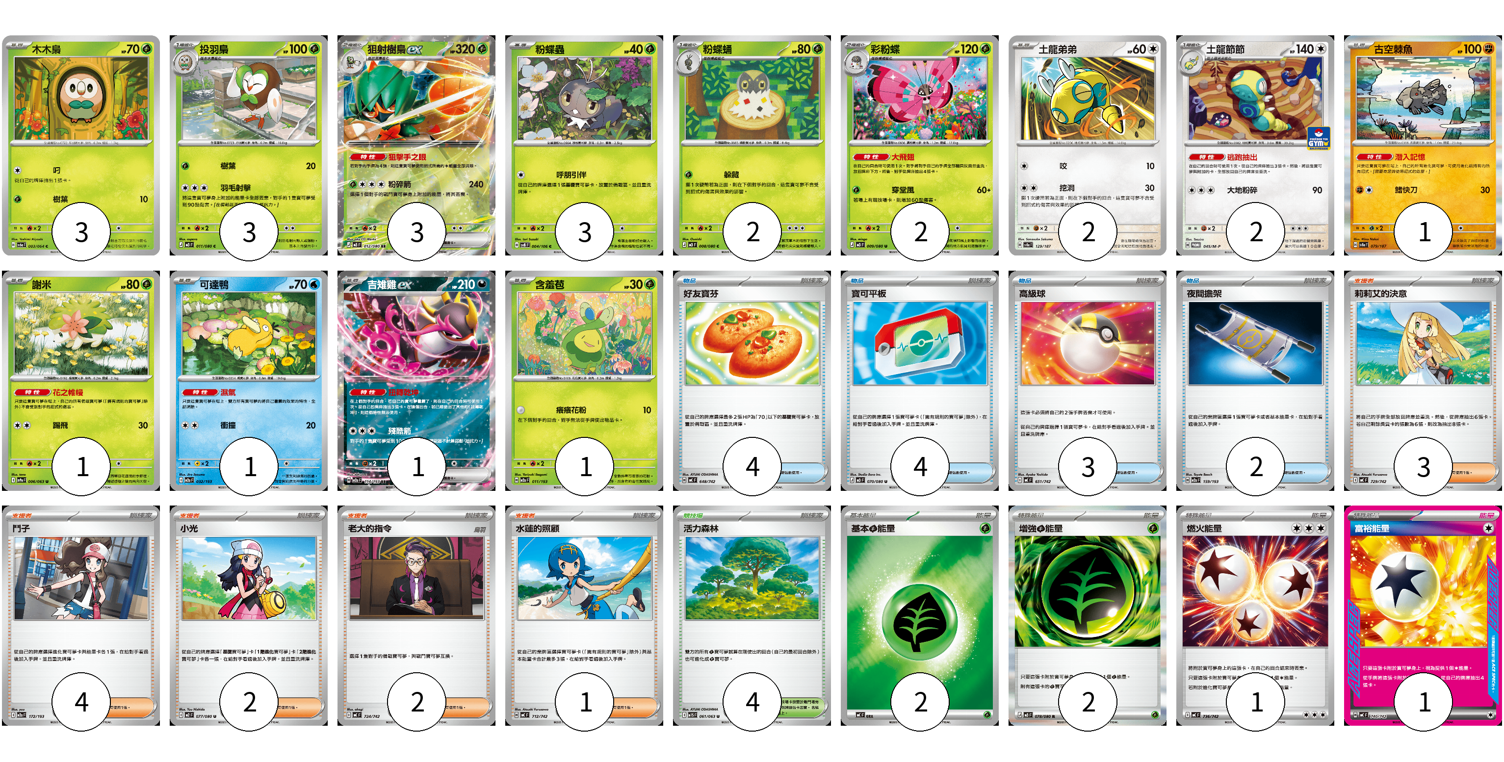 牌組構築方案 以此牌組為基礎新構築牌組 顯示卡面 顯示列表 寶可夢卡(25) 3 3 3 3 2 2 2 2 1 1 1 1 1 物品卡(13) 4 4 3 2 支援者卡(12) 3 4 2 2 1 競技場卡(4) 4 能量卡(6) 2 2 1 1 寶可夢卡(25) 卡牌名稱 張數 卡牌名稱 張數 木木梟 SV6a 003/064 03 投羽梟 M3 011/080 03 狙射樹梟ex M3 012/080 03 粉蝶蟲 SV8 004/106 03 粉蝶蛹 M3 008/080 02 彩粉蝶 M3 009/080 02 土龍弟弟 SV8a 129/187 02 土龍節節 M-P 045/M-P 02 古空棘魚 SV8a 079/187 01 謝米 SV9a 006/063 01 可達鴨 M2a 032/193 01 吉雉雞ex M2a 114/193 01 含羞苞 M2a 011/193 01 物品卡(13) 卡牌名稱 張數 卡牌名稱 張數 好友寶芬 MC 648/742 04 寶可平板 M3 070/080 04 高級球 MC 651/742 03 夜間擔架 M2a 159/193 02 支援者卡(12) 卡牌名稱 張數 卡牌名稱 張數 莉莉艾的決意 MC 729/742 03 鬥子 M2a 172/193 04 小光 M2 077/080 02 老大的指令 MC 724/742 02 水蓮的照顧 MC 712/742 01 競技場卡(4) 卡牌名稱 張數 卡牌名稱 張數 活力森林 M1S 061/063 04 能量卡(6) 卡牌名稱 張數 卡牌名稱 張數 基本【草】能量 MC GRA 02 增強【草】能量 M3 078/080 02 燃火能量 MC 736/742 01 富裕能量 MC 740/742 01 以此牌組為基礎新構築牌組 牌組編碼 xyvsFK-drVKOD-bUueAt copy 列印牌組單 牌組編碼已複製 分享至SNS