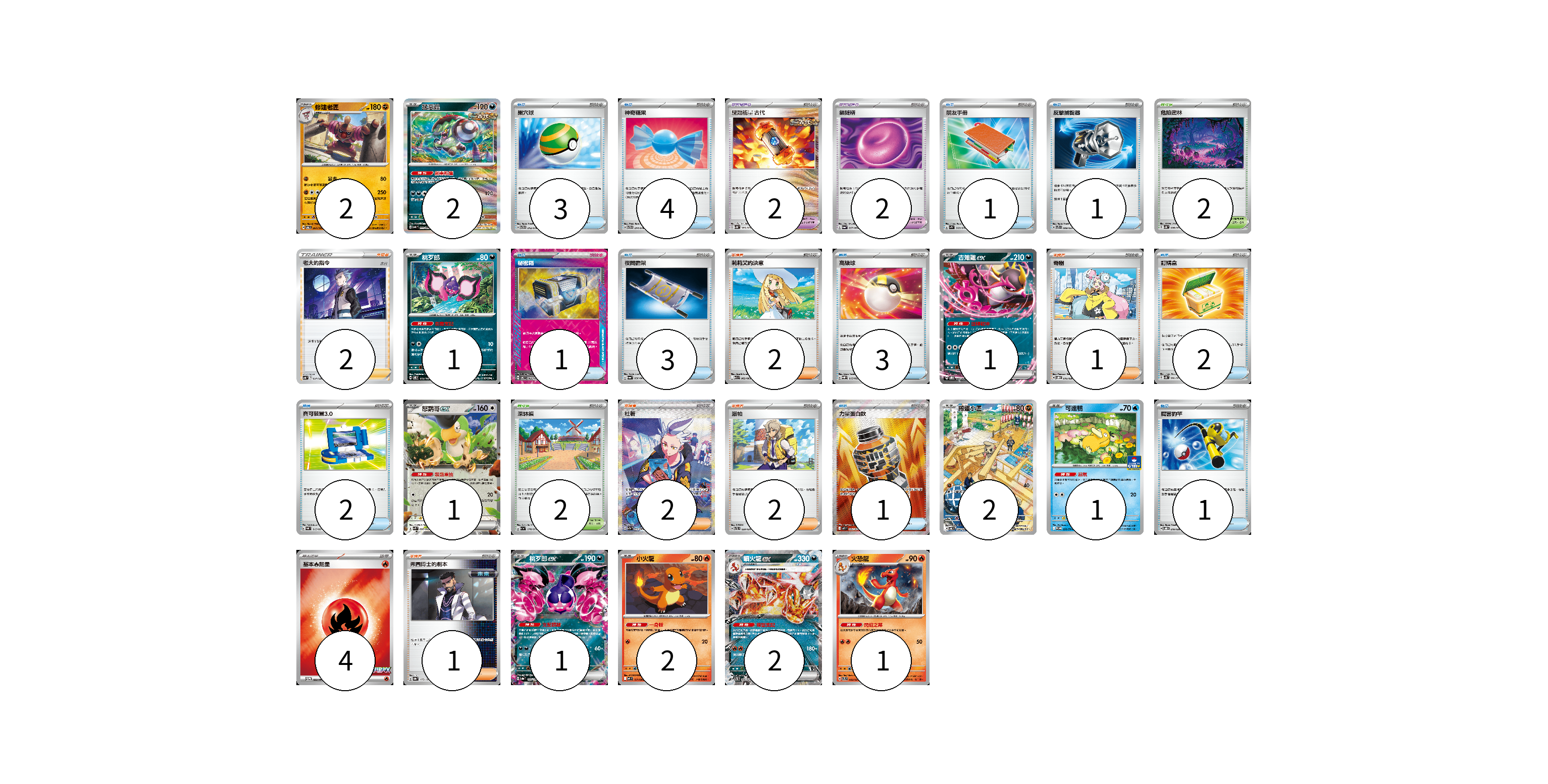 牌組構築方案 以此牌組為基礎新構築牌組 顯示卡面 顯示列表 寶可夢卡(16) 2 2 1 1 1 2 1 1 2 2 1 寶可夢道具(4) 2 2 物品卡(22) 3 4 1 1 1 3 3 2 2 1 1 支援者卡(10) 2 2 1 2 2 1 競技場卡(4) 2 2 能量卡(4) 4 寶可夢卡(16) 卡牌名稱 張數 卡牌名稱 張數 修建老匠 SV6 061/101 02 猛惡菇 SV4K 053/066 02 桃歹郎 SV8 075/106 01 吉雉雞ex SVOD 004/020 01 怒鸚哥ex SVK 006/042 01 搬運小匠 SV6 109/101 02 可達鴨 SV-P 220/SV-P 01 桃歹郎ex SV8a 105/187 01 小火龍 M2 011/080 02 噴火龍ex SVTL 006/021 02 火恐龍 SVTL 002/021 01 寶可夢道具(4) 卡牌名稱 張數 卡牌名稱 張數 驅勁能量 古代 SV5K 065/071 02 鎖鏈糬 SV6a 057/064 02 物品卡(22) 卡牌名稱 張數 卡牌名稱 張數 巢穴球 SVTG 012/019 03 神奇糖果 SVTG 014/019 04 朋友手冊 SV1S 069/078 01 反擊捕捉器 SVTS 009/022 01 秘密箱 SV6 092/101 01 夜間擔架 SV6a 056/064 03 高級球 SVQP 015/023 03 訂購盒 SV5K 061/071 02 寶可裝置3.0 SVAL 015/021 02 力量蛋白飲 M1L 081/063 01 厲害釣竿 SVOD 010/020 01 支援者卡(10) 卡牌名稱 張數 卡牌名稱 張數 老大的指令(赤日) SVB 024/028 02 莉莉艾的決意 M1L 062/063 02 奇樹 SVOD 016/020 01 杜若 SV7a 090/064 02 派帕 SVTL 020/021 02 弗圖博士的劇本 SV8a 175/187 01 競技場卡(4) 卡牌名稱 張數 卡牌名稱 張數 危險密林 SV5K 070/071 02 深缽鎮 SV1a 070/073 02 能量卡(4) 卡牌名稱 張數 卡牌名稱 張數 基本【火】能量 M-P 032/M-P 04 以此牌組為基礎新構築牌組 牌組編碼 xzYXNV-sdWhGV-vPikUe copy 列印牌組單 牌組編碼已複製 分享至SNS