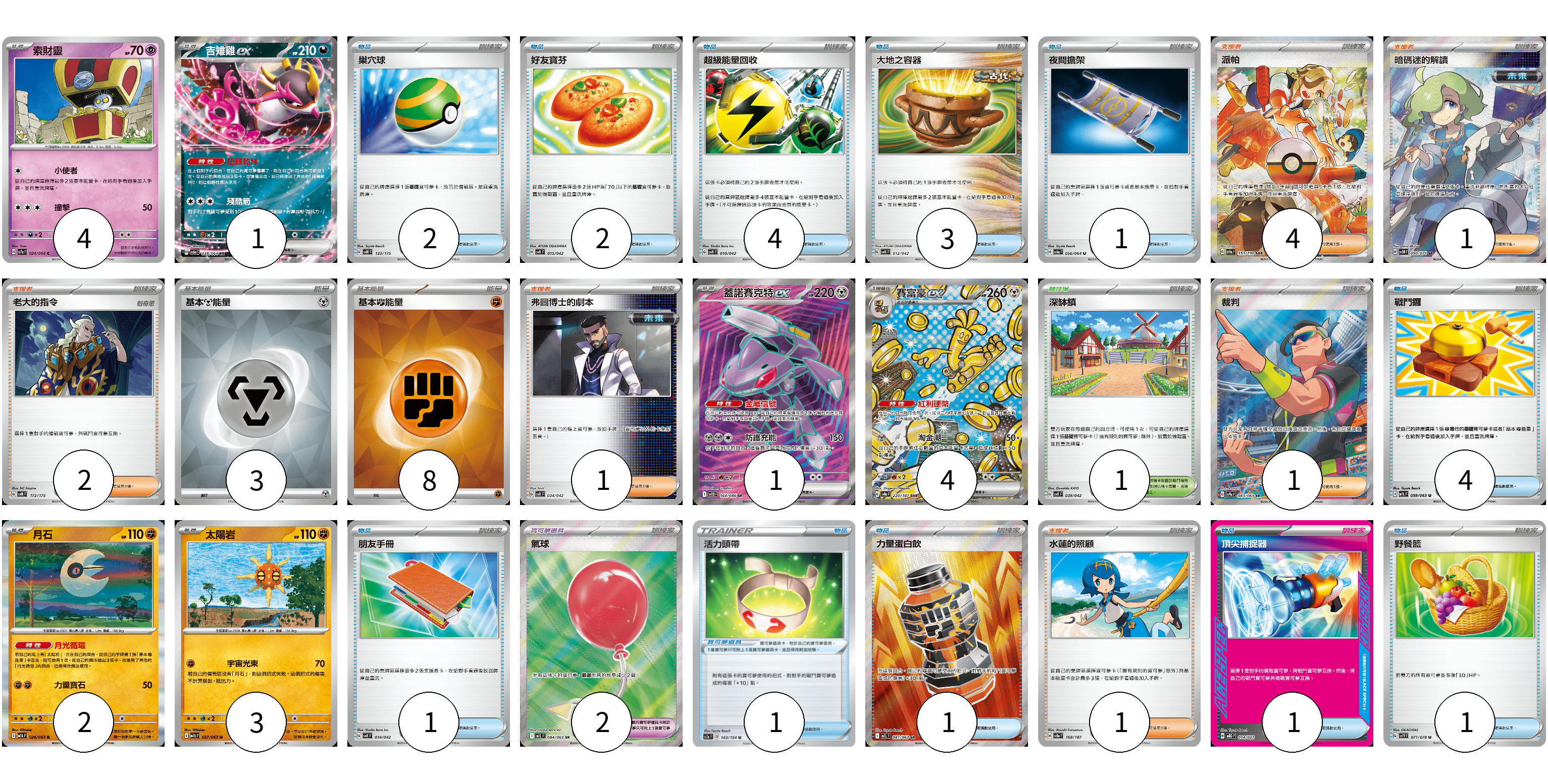 牌組構築方案 以此牌組為基礎新構築牌組 顯示卡面 顯示列表 寶可夢卡(15) 4 1 1 4 2 3 寶可夢道具(3) 2 1 物品卡(20) 2 2 4 3 1 4 1 1 1 1 支援者卡(10) 4 1 2 1 1 1 競技場卡(1) 1 能量卡(11) 3 8 寶可夢卡(15) 卡牌名稱 張數 卡牌名稱 張數 索財靈 SV7a 024/064 04 吉雉雞ex SV6a 038/064 01 蓋諾賽克特ex SV11B 164/086 01 賽富豪ex SV8a 220/187 04 月石 M1L 026/063 02 太陽岩 M1L 027/063 03 寶可夢道具(3) 卡牌名稱 張數 卡牌名稱 張數 氣球 M1L 084/063 02 活力頭帶 SC1a 143/154 01 物品卡(20) 卡牌名稱 張數 卡牌名稱 張數 巢穴球 SVM 133/175 02 好友寶芬 SVK 015/042 02 超級能量回收 SVK 010/042 04 大地之容器 SVK 012/042 03 夜間擔架 SV6a 056/064 01 戰鬥鑼 M1L 059/063 04 朋友手冊 SVK 014/042 01 力量蛋白飲 M1L 081/063 01 頂尖捕捉器 MBG 014/022 01 野餐籃 SV1V 071/078 01 支援者卡(10) 卡牌名稱 張數 卡牌名稱 張數 派帕 SV4a 353/190 04 暗碼迷的解讀 SV5M 090/071 01 老大的指令 SVM 172/175 02 弗圖博士的劇本 SVK 034/042 01 裁判 SV9a 083/063 01 水蓮的照顧 SV8a 168/187 01 競技場卡(1) 卡牌名稱 張數 卡牌名稱 張數 深缽鎮 SVK 039/042 01 能量卡(11) 卡牌名稱 張數 卡牌名稱 張數 基本【鋼】能量 SVK MET 03 基本【鬥】能量 SVK FIG 08 以此牌組為基礎新構築牌組 牌組編碼 yCjEuW-FRLDQG-TuNCRo copy 列印牌組單 牌組編碼已複製 分享至SNS