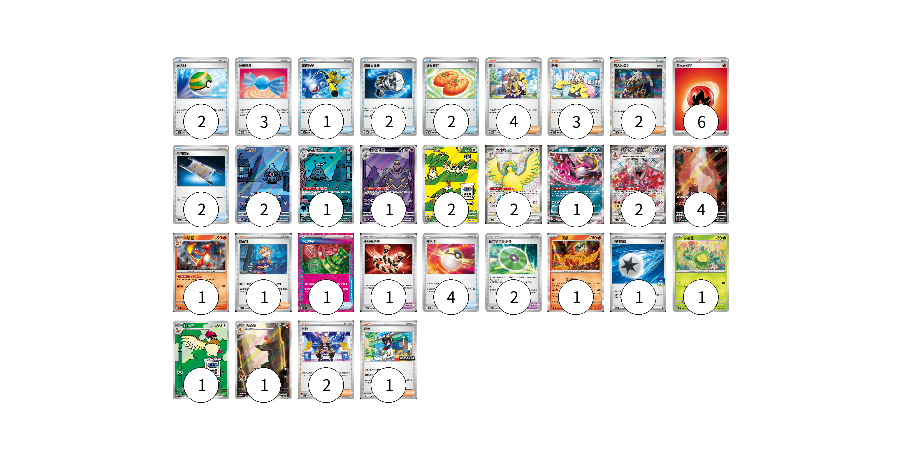 牌組構築方案 以此牌組為基礎新構築牌組 顯示卡面 顯示列表 寶可夢卡(20) 2 1 1 2 2 1 2 4 1 1 1 1 1 寶可夢道具(3) 1 2 物品卡(17) 2 3 1 2 2 2 1 4 支援者卡(13) 4 3 2 1 2 1 能量卡(7) 6 1 寶可夢卡(20) 卡牌名稱 張數 卡牌名稱 張數 夜巡靈 SV6a 068/064 02 彷徨夜靈 SV6a 069/064 01 黑夜魔靈 SV6a 070/064 01 波波 SV3 118/108 02 大比鳥ex SV4a 335/190 02 吉雉雞ex SV6a 038/064 01 噴火龍ex SV4a 331/190 02 小火龍 SV2a 168/165 04 火恐龍 SV4a 026/190 01 古玉魚 SV8a 025/187 01 含羞苞 SV8a 001/187 01 比比鳥 SV3 119/108 01 火恐龍 SV2a 169/165 01 寶可夢道具(3) 卡牌名稱 張數 卡牌名稱 張數 不服輸頭帶 SVTL 016/021 01 招式學習器 演進 SV8a 160/187 02 物品卡(17) 卡牌名稱 張數 卡牌名稱 張數 巢穴球 SV1S 070/078 02 神奇糖果 SV1V 072/078 03 厲害釣竿 SV2P 066/071 01 反擊捕捉器 SV4M 059/066 02 好友寶芬 SV5K 063/071 02 夜間擔架 SV6a 056/064 02 不公印章 SV5a 053/066 01 高級球 SVF 017/038 04 支援者卡(13) 卡牌名稱 張數 卡牌名稱 張數 派帕 SV1V 076/078 04 奇樹 SV2D 069/071 03 老大的指令 SV1a 069/073 02 白蕾雅 SV7 100/102 01 杜若 SV7a 060/064 02 烏栗 SV-P 142/SV-P 01 能量卡(7) 卡牌名稱 張數 卡牌名稱 張數 基本火能量 sv-p FIR 06 噴射能量 SV-P 180/SV-P 01 以此牌組為基礎新構築牌組 牌組編碼 yDVzHy-HRFTKF-IcJBHI copy 列印牌組單 牌組編碼已複製 分享至SNS