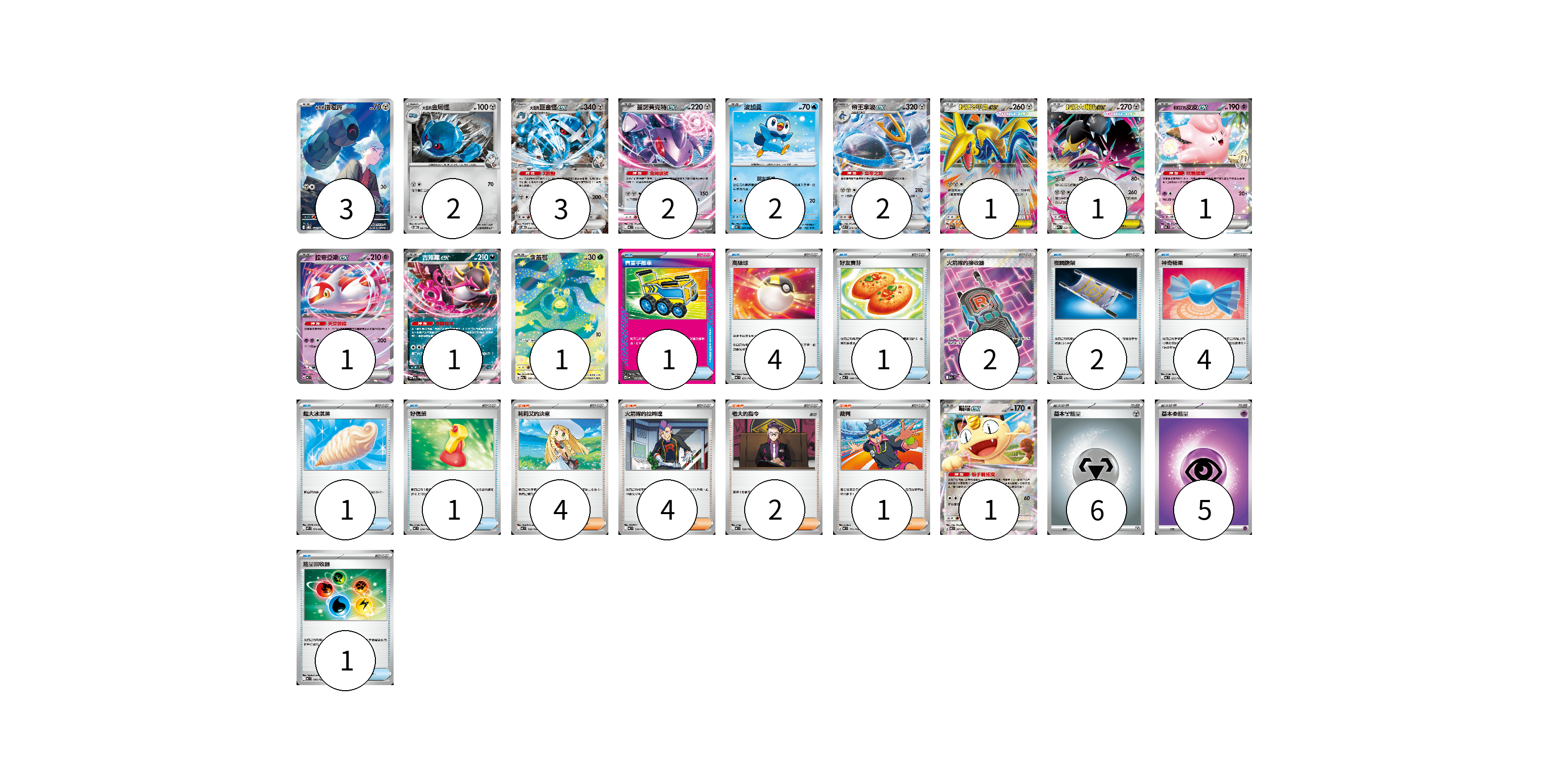 牌組構築方案 以此牌組為基礎新構築牌組 顯示卡面 顯示列表 寶可夢卡(21) 3 2 3 2 2 2 1 1 1 1 1 1 1 物品卡(17) 1 4 1 2 2 4 1 1 1 支援者卡(11) 4 4 2 1 能量卡(11) 6 5 寶可夢卡(21) 卡牌名稱 張數 卡牌名稱 張數 <大吾的>鐵啞鈴 SVOD 021/020 03 <大吾的>金屬怪 SVOD 007/020 02 <大吾的>巨金怪ex SVOD 008/020 03 蓋諾賽克特ex MC 512/742 02 波加曼 M2 027/080 02 帝王拿波ex M2 058/080 02 超級盔甲鳥ex M3 054/080 01 超級大嘴娃ex M1L 046/063 01 <莉莉艾的>皮皮ex MC 287/742 01 拉帝亞斯ex MC 312/742 01 吉雉雞ex M2a 114/193 01 含羞苞 M2a 196/193 01 喵喵ex M3 061/080 01 物品卡(17) 卡牌名稱 張數 卡牌名稱 張數 貴重手推車 MC 658/742 01 高級球 MC 651/742 04 好友寶芬 MC 648/742 01 火箭隊的接收器 M2a 217/193 02 夜間擔架 MC 670/742 02 神奇糖果 MC 655/742 04 超大冰淇淋 M2 073/080 01 好傷藥 MC 634/742 01 能量回收器 MC 640/742 01 支援者卡(11) 卡牌名稱 張數 卡牌名稱 張數 莉莉艾的決意 MC 729/742 04 火箭隊的拉姆達 MC 734/742 04 老大的指令 MC 724/742 02 裁判 MC 711/742 01 能量卡(11) 卡牌名稱 張數 卡牌名稱 張數 基本【鋼】能量 MC MET 06 基本【超】能量 MC PSY 05 以此牌組為基礎新構築牌組 牌組編碼 yDwCIB-vliPUv-bpSLfw copy 列印牌組單 牌組編碼已複製 分享至SNS