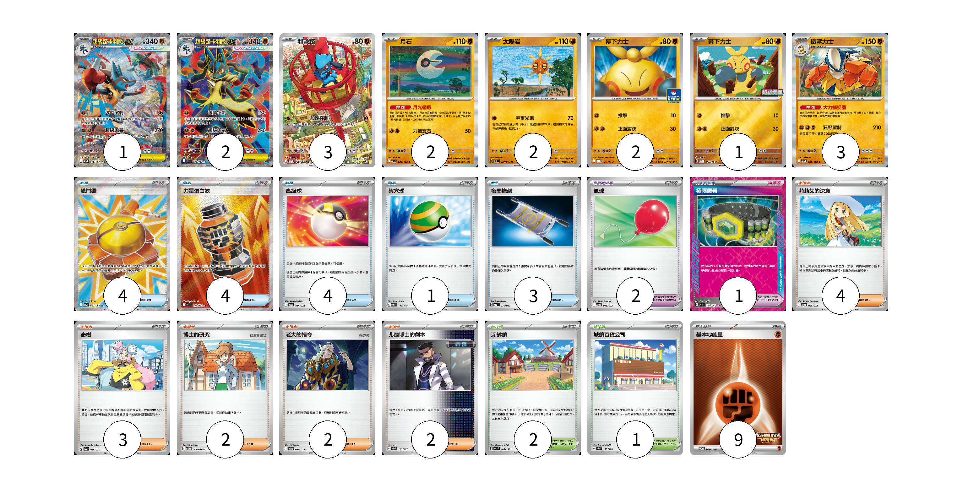 牌組構築方案 以此牌組為基礎新構築牌組 顯示卡面 顯示列表 寶可夢卡(16) 1 2 3 2 2 2 1 3 寶可夢道具(3) 2 1 物品卡(16) 4 4 4 1 3 支援者卡(13) 4 3 2 2 2 競技場卡(3) 2 1 能量卡(9) 9 寶可夢卡(16) 卡牌名稱 張數 卡牌名稱 張數 超級路卡利歐ex M1L 088/063 01 超級路卡利歐ex M1L 078/063 02 利歐路 M1L 068/063 03 月石 M1L 026/063 02 太陽岩 M1L 027/063 02 幕下力士 M-P 015/M-P 02 幕下力士 M-P 007/M-P 01 鐵掌力士 M1L 025/063 03 寶可夢道具(3) 卡牌名稱 張數 卡牌名稱 張數 氣球 MBD 018/022 02 極限腰帶 SV8a 159/187 01 物品卡(16) 卡牌名稱 張數 卡牌名稱 張數 戰鬥鑼 M1L 082/063 04 力量蛋白飲 M1L 081/063 04 高級球 MBD 014/022 04 巢穴球 SVM 133/175 01 夜間擔架 MBD 016/022 03 支援者卡(13) 卡牌名稱 張數 卡牌名稱 張數 莉莉艾的決意 MBD 021/022 04 奇樹 SVOD 016/020 03 博士的研究 SV11B 084/086 02 老大的指令 MBD 020/022 02 弗圖博士的劇本 SV8a 175/187 02 競技場卡(3) 卡牌名稱 張數 卡牌名稱 張數 深缽鎮 SV4a 185/190 02 城鎮百貨公司 SV4a 183/190 01 能量卡(9) 卡牌名稱 張數 卡牌名稱 張數 基本【鬥】能量 SV-P 262/SV-P 09 以此牌組為基礎新構築牌組 牌組編碼 yENSxE-aWfhWE-VGlzXE copy 列印牌組單 牌組編碼已複製 分享至SNS