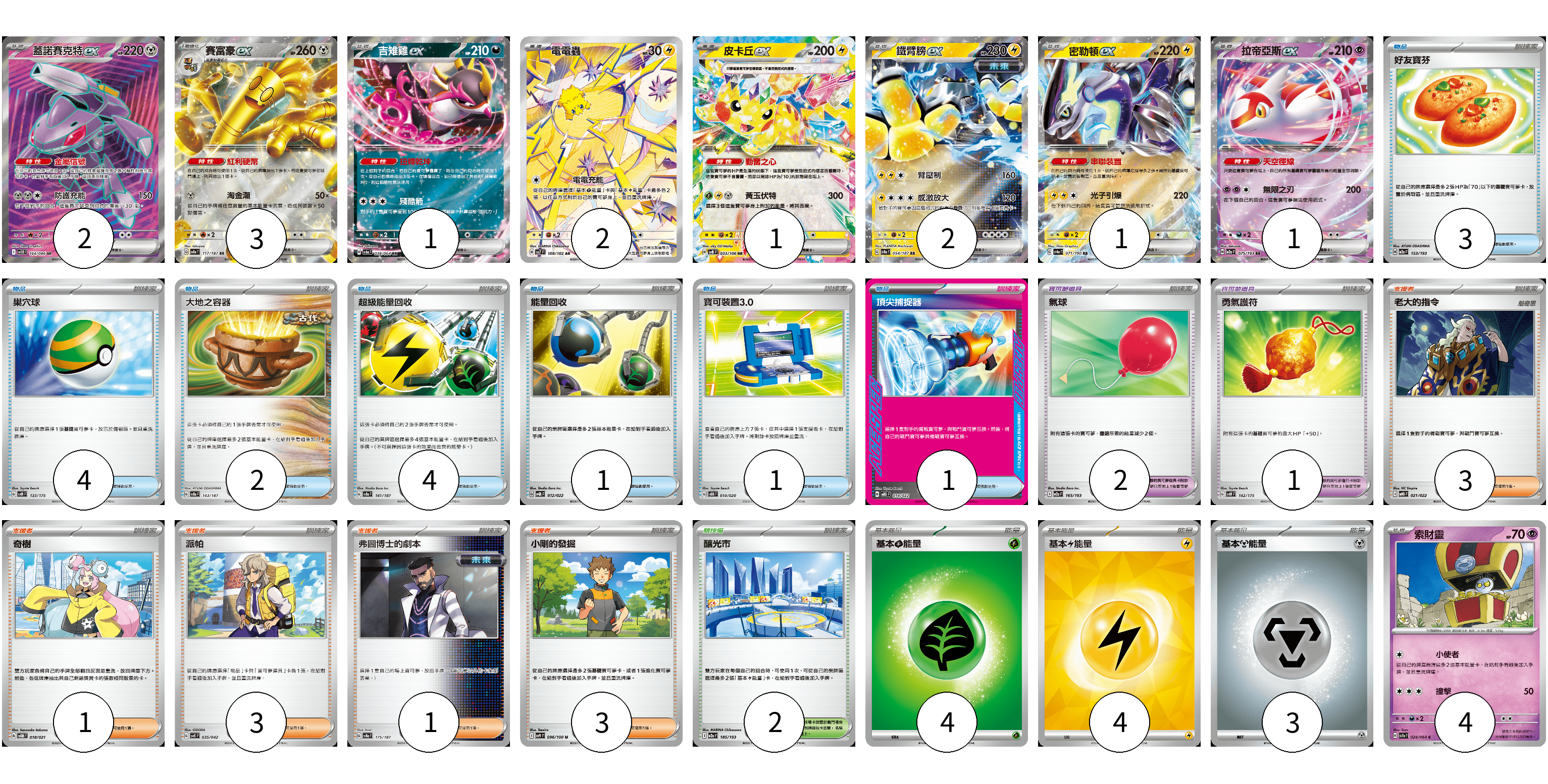 牌組構築方案 以此牌組為基礎新構築牌組 顯示卡面 顯示列表 寶可夢卡(17) 2 3 1 2 1 2 1 1 4 寶可夢道具(3) 2 1 物品卡(16) 3 4 2 4 1 1 1 支援者卡(11) 3 1 3 1 3 競技場卡(2) 2 能量卡(11) 4 4 3 寶可夢卡(17) 卡牌名稱 張數 卡牌名稱 張數 蓋諾賽克特ex SV11B 164/086 02 賽富豪ex SV8a 117/187 03 吉雉雞ex SV6a 038/064 01 電電蟲 SV7 108/102 02 皮卡丘ex SV8 033/106 01 鐵臂膀ex SV8a 054/187 02 密勒頓ex SV4a 071/190 01 拉帝亞斯ex M2a 075/193 01 索財靈 SV7a 024/064 04 寶可夢道具(3) 卡牌名稱 張數 卡牌名稱 張數 氣球 M2a 165/193 02 勇氣護符 SVM 142/175 01 物品卡(16) 卡牌名稱 張數 卡牌名稱 張數 好友寶芬 M2a 153/193 03 巢穴球 SVM 133/175 04 大地之容器 SV8a 143/187 02 超級能量回收 SV8a 141/187 04 能量回收 SVQL 012/022 01 寶可裝置3.0 SVEM 014/020 01 頂尖捕捉器 MBG 014/022 01 支援者卡(11) 卡牌名稱 張數 卡牌名稱 張數 老大的指令 MBG 021/022 03 奇樹 SVOM 018/021 01 派帕 SVK 035/042 03 弗圖博士的劇本 SV8a 175/187 01 小剛的發掘 SV9 096/100 03 競技場卡(2) 卡牌名稱 張數 卡牌名稱 張數 釀光市 M2a 185/193 02 能量卡(11) 卡牌名稱 張數 卡牌名稱 張數 基本【草】能量 M-P GRA 04 基本【雷】能量 SVQP LIG 04 基本【鋼】能量 M-P MET 03 以此牌組為基礎新構築牌組 牌組編碼 yEjTik-kogYMg-rJLQUa copy 列印牌組單 牌組編碼已複製 分享至SNS