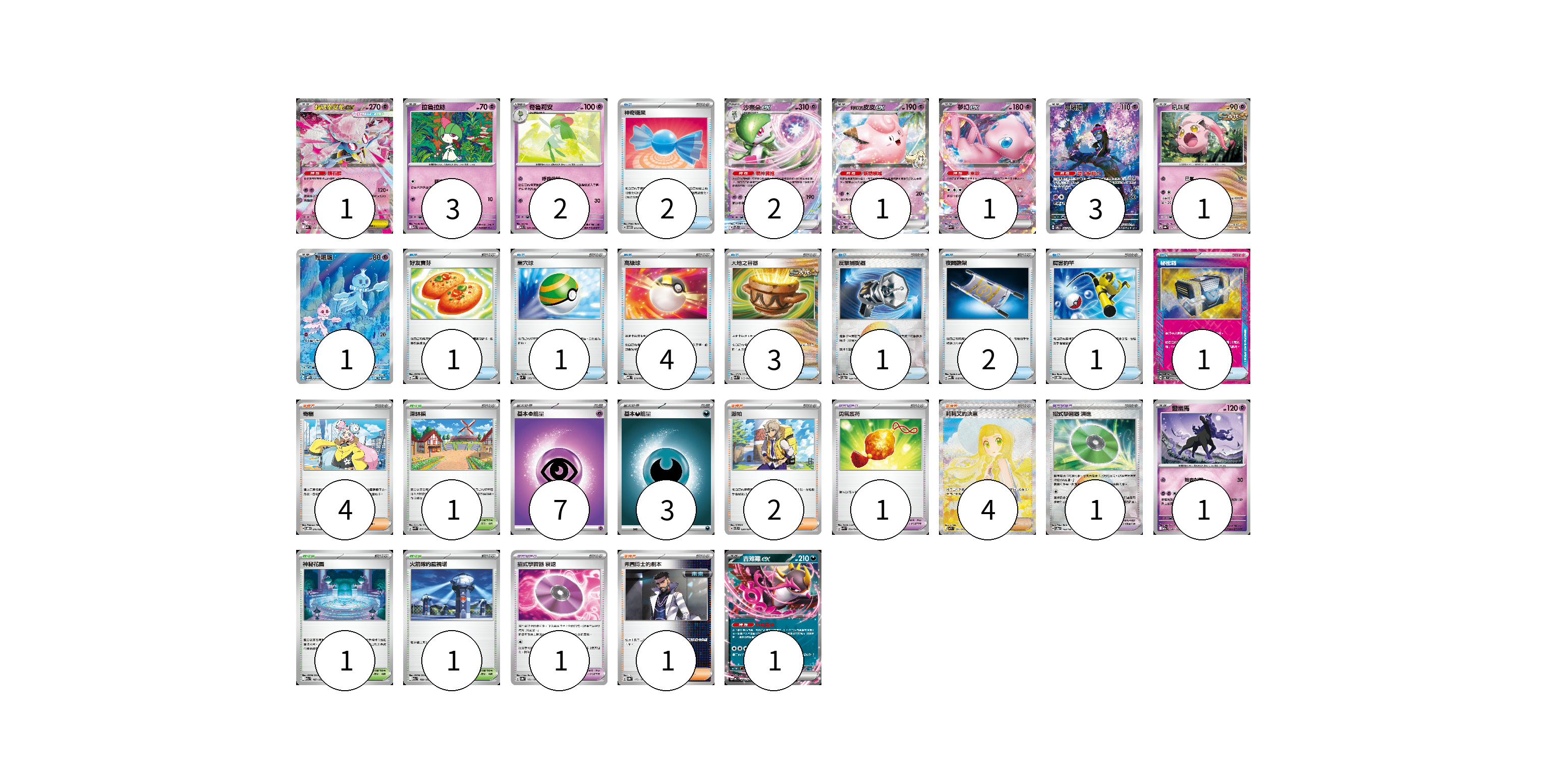 牌組構築方案 以此牌組為基礎新構築牌組 顯示卡面 顯示列表 寶可夢卡(17) 1 3 2 2 1 1 3 1 1 1 1 寶可夢道具(3) 1 1 1 物品卡(16) 2 1 1 4 3 1 2 1 1 支援者卡(11) 4 2 4 1 競技場卡(3) 1 1 1 能量卡(10) 7 3 寶可夢卡(17) 卡牌名稱 張數 卡牌名稱 張數 超級蒂安希ex MBD 006/022 01 拉魯拉絲 M1S 040/063 03 奇魯莉安 M1S 041/063 02 沙奈朵ex SVTS 004/022 02 莉莉艾的皮皮ex SV9 033/100 01 夢幻ex SVK 001/042 01 願增猿 SV6 107/101 03 吼叫尾 SV8a 071/187 01 輕飄飄 SV11W 124/086 01 靈幽馬 M2a 080/193 01 吉雉雞ex MC 489/742 01 寶可夢道具(3) 卡牌名稱 張數 卡牌名稱 張數 勇氣護符 SVK 024/042 01 招式學習器 演進 SV8a 160/187 01 招式學習器 衰退 SV8a 161/187 01 物品卡(16) 卡牌名稱 張數 卡牌名稱 張數 神奇糖果 SVTM 013/022 02 好友寶芬 MBD 013/022 01 巢穴球 SVM 133/175 01 高級球 MBD 014/022 04 大地之容器 SVK 012/042 03 反擊捕捉器 SV8a 139/187 01 夜間擔架 MBD 016/022 02 厲害釣竿 SVOD 010/020 01 秘密箱 SV6 092/101 01 支援者卡(11) 卡牌名稱 張數 卡牌名稱 張數 奇樹 SVOD 016/020 04 派帕 SVTL 020/021 02 莉莉艾的決意 M1L 091/063 04 弗圖博士的劇本 SV8a 175/187 01 競技場卡(3) 卡牌名稱 張數 卡牌名稱 張數 深缽鎮 SVK 039/042 01 神秘花園 M2a 187/193 01 火箭隊的監視塔 M2a 189/193 01 能量卡(10) 卡牌名稱 張數 卡牌名稱 張數 基本【超】能量 MBD PSY 07 基本【惡】能量 MBG DAR 03 以此牌組為基礎新構築牌組 牌組編碼 yFaLwP-SfXFSQ-jnBmUz copy 列印牌組單 牌組編碼已複製 分享至SNS