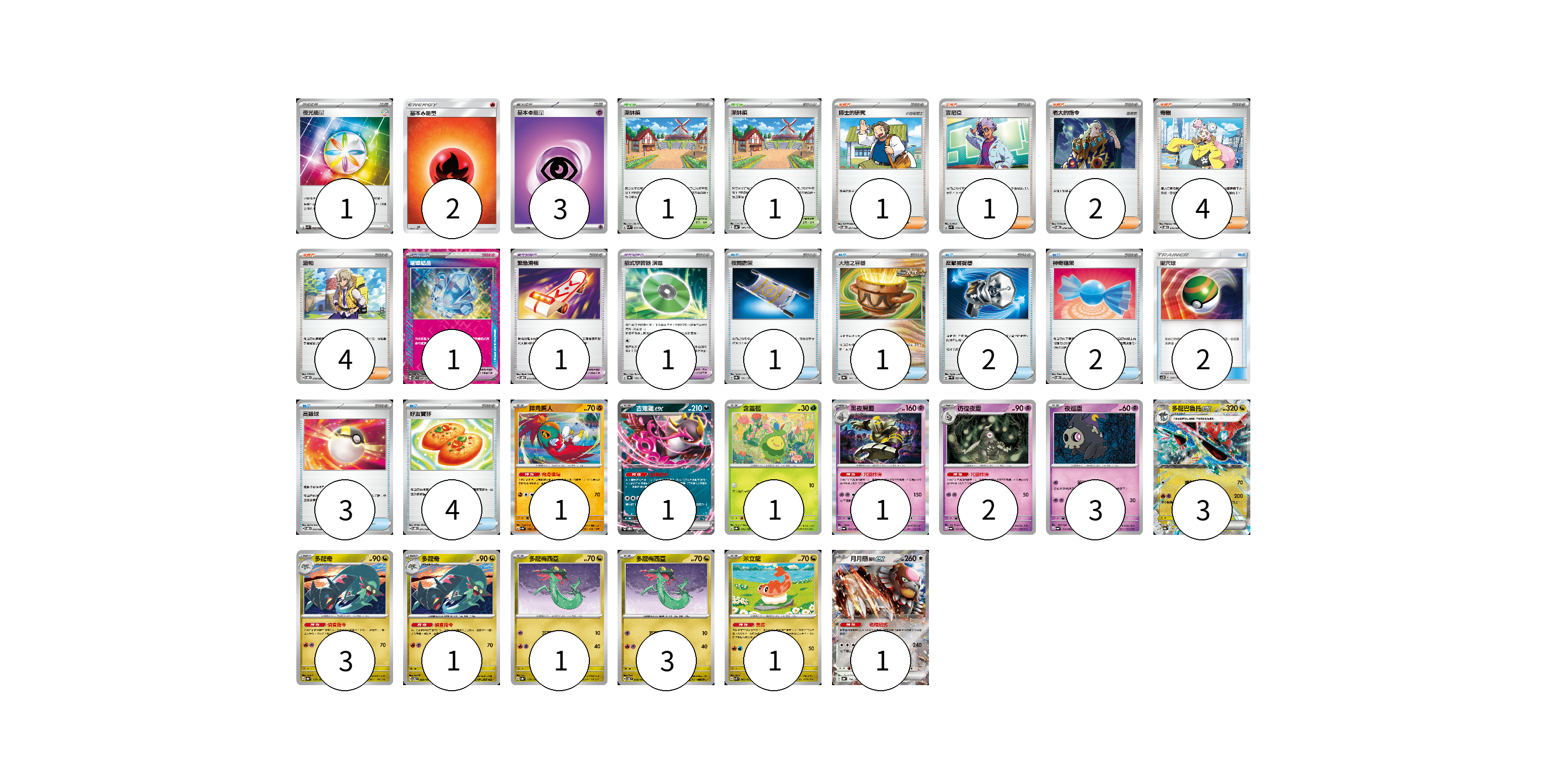 牌組構築方案 以此牌組為基礎新構築牌組 顯示卡面 顯示列表 寶可夢卡(22) 1 1 1 1 2 3 3 3 1 1 3 1 1 寶可夢道具(3) 1 1 1 物品卡(15) 1 1 2 2 2 3 4 支援者卡(12) 1 1 2 4 4 競技場卡(2) 1 1 能量卡(6) 1 2 3 寶可夢卡(22) 卡牌名稱 張數 卡牌名稱 張數 摔角鷹人 SV4a 106/190 01 吉雉雞ex SVOD 004/020 01 含羞苞 SV8a 001/187 01 黑夜魔靈 SV6a 020/064 01 彷徨夜靈 SV6a 019/064 02 夜巡靈 SV6a 018/064 03 多龍巴魯托ex SV8a 120/187 03 多龍奇 SV8a 119/187 03 多龍奇 SV6 080/101 01 多龍梅西亞 SV8a 118/187 01 多龍梅西亞 SV6 079/101 03 米立龍 SVK 002/042 01 月月熊 赫月ex SV8a 134/187 01 寶可夢道具(3) 卡牌名稱 張數 卡牌名稱 張數 璀璨結晶 SV7 094/102 01 緊急滑板 SVOD 015/020 01 招式學習器 演進 SV8a 160/187 01 物品卡(15) 卡牌名稱 張數 卡牌名稱 張數 夜間擔架 SV8a 151/187 01 大地之容器 SV8a 143/187 01 反擊捕捉器 SV4M 059/066 02 神奇糖果 SVOD 013/020 02 巢穴球 AC2D 146/176 02 高級球 SVOD 012/020 03 好友寶芬 SVOD 011/020 04 支援者卡(12) 卡牌名稱 張數 卡牌名稱 張數 博士的研究 SVOD 017/020 01 吉尼亞 SV1S 074/078 01 老大的指令 SVOD 019/020 02 奇樹 SVOD 016/020 04 派帕 SVOD 018/020 04 競技場卡(2) 卡牌名稱 張數 卡牌名稱 張數 深缽鎮 SVK 039/042 01 深缽鎮 SV4a 185/190 01 能量卡(6) 卡牌名稱 張數 卡牌名稱 張數 夜光能量 SVK 042/042 01 基本火能量 AS6D FIR 02 基本超能量 sv-p PSY 03 以此牌組為基礎新構築牌組 牌組編碼 yGBDas-jAmvWF-tWbuWZ copy 列印牌組單 牌組編碼已複製 分享至SNS