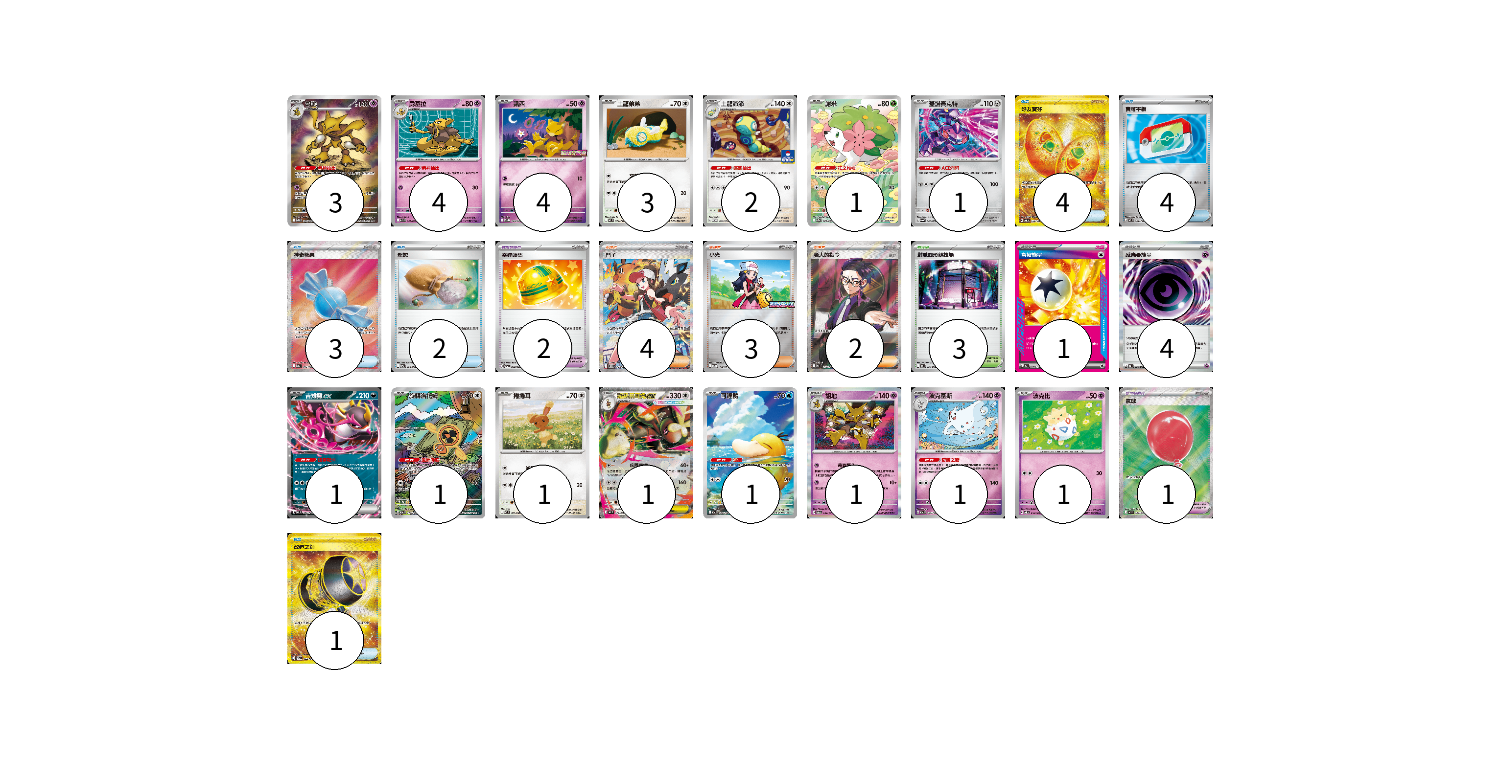 牌組構築方案 以此牌組為基礎新構築牌組 顯示卡面 顯示列表 寶可夢卡(26) 3 4 4 3 2 1 1 1 1 1 1 1 1 1 1 寶可夢道具(3) 2 1 物品卡(14) 4 4 3 2 1 支援者卡(9) 4 3 2 競技場卡(3) 3 能量卡(5) 1 4 寶可夢卡(26) 卡牌名稱 張數 卡牌名稱 張數 胡地 M1S 071/063 03 勇基拉 M1S 037/063 04 凱西 M-P 004/M-P 04 土龍弟弟 MC 574/742 03 土龍節節 M-P 045/M-P 02 謝米 SV9a 066/063 01 蓋諾賽克特 SV6a 040/064 01 吉雉雞ex MC 489/742 01 旋轉洛托姆 M2a 213/193 01 捲捲耳 M2 071/080 01 超級長耳兔ex M2 072/080 01 可達鴨 M2a 199/193 01 胡地 SV6 049/101 01 波克基斯 M2a 066/193 01 波克比 SV8 045/106 01 寶可夢道具(3) 卡牌名稱 張數 卡牌名稱 張數 幸運頭盔 SV5a 060/066 02 氣球 M1L 084/063 01 物品卡(14) 卡牌名稱 張數 卡牌名稱 張數 好友寶芬 SV6 133/101 04 寶可平板 MC 662/742 04 神奇糖果 M1S 082/063 03 聖灰 SV9a 056/063 02 改造之錘 SV6 132/101 01 支援者卡(9) 卡牌名稱 張數 卡牌名稱 張數 鬥子 SV11W 173/086 04 小光 M-P 028/M-P 03 老大的指令(烏羽) MC 760/742 02 競技場卡(3) 卡牌名稱 張數 卡牌名稱 張數 對戰圓形競技場 M2 079/080 03 能量卡(5) 卡牌名稱 張數 卡牌名稱 張數 富裕能量 MC 740/742 01 感應【超】能量 M3 079/080 04 以此牌組為基礎新構築牌組 牌組編碼 yGTLLQ-NDrrVW-cNxexh copy 列印牌組單 牌組編碼已複製 分享至SNS