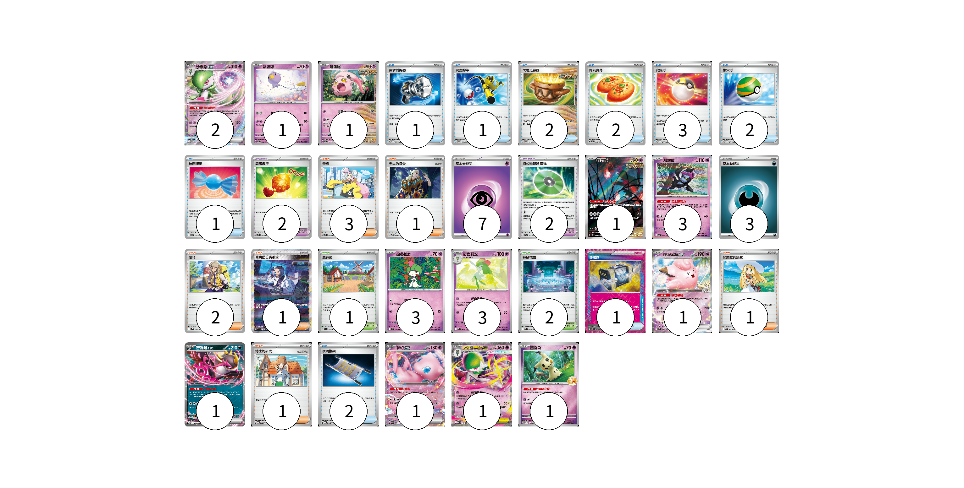 牌組構築方案 以此牌組為基礎新構築牌組 顯示卡面 顯示列表 寶可夢卡(19) 2 1 1 1 3 3 3 1 1 1 1 1 寶可夢道具(4) 2 2 物品卡(15) 1 1 2 2 3 2 1 1 2 支援者卡(9) 3 1 2 1 1 1 競技場卡(3) 1 2 能量卡(10) 7 3 寶可夢卡(19) 卡牌名稱 張數 卡牌名稱 張數 沙奈朵ex SVTS 004/022 02 飄飄球 SVTS 005/022 01 吼叫尾 SVTS 007/022 01 振翼髮 SV5K 076/071 01 願增猿 SV6 055/101 03 拉魯拉絲 M1S 040/063 03 奇魯莉安 M1S 041/063 03 莉莉艾的皮皮ex SV9 033/100 01 吉雉雞ex SVOM 009/021 01 夢幻ex SVK 001/042 01 超級沙奈朵ex M1S 042/063 01 謎擬Q SV-P 170/SV-P 01 寶可夢道具(4) 卡牌名稱 張數 卡牌名稱 張數 勇氣護符 SVTS 017/022 02 招式學習器 演進 SVTL 017/021 02 物品卡(15) 卡牌名稱 張數 卡牌名稱 張數 反擊捕捉器 SVTS 009/022 01 厲害釣竿 SVTS 010/022 01 大地之容器 SVTS 011/022 02 好友寶芬 SVTS 012/022 02 高級球 SVTS 014/022 03 巢穴球 SVTS 013/022 02 神奇糖果 SVTS 015/022 01 秘密箱 SV6 092/101 01 夜間擔架 MBD 016/022 02 支援者卡(9) 卡牌名稱 張數 卡牌名稱 張數 奇樹 SVTS 018/022 03 老大的指令 SVTS 020/022 01 派帕 SV1V 076/078 02 弗圖博士的劇本 SV4M 091/066 01 莉莉艾的決意 MBD 021/022 01 博士的研究 SV11B 084/086 01 競技場卡(3) 卡牌名稱 張數 卡牌名稱 張數 深缽鎮 SV1a 070/073 01 神秘花園 MBD 022/022 02 能量卡(10) 卡牌名稱 張數 卡牌名稱 張數 基本【超】能量 SVHM PSY 07 基本【惡】能量 SVF DAR 03 以此牌組為基礎新構築牌組 牌組編碼 yIGFAc-CxyeuK-KQWRHG copy 列印牌組單 牌組編碼已複製 分享至SNS