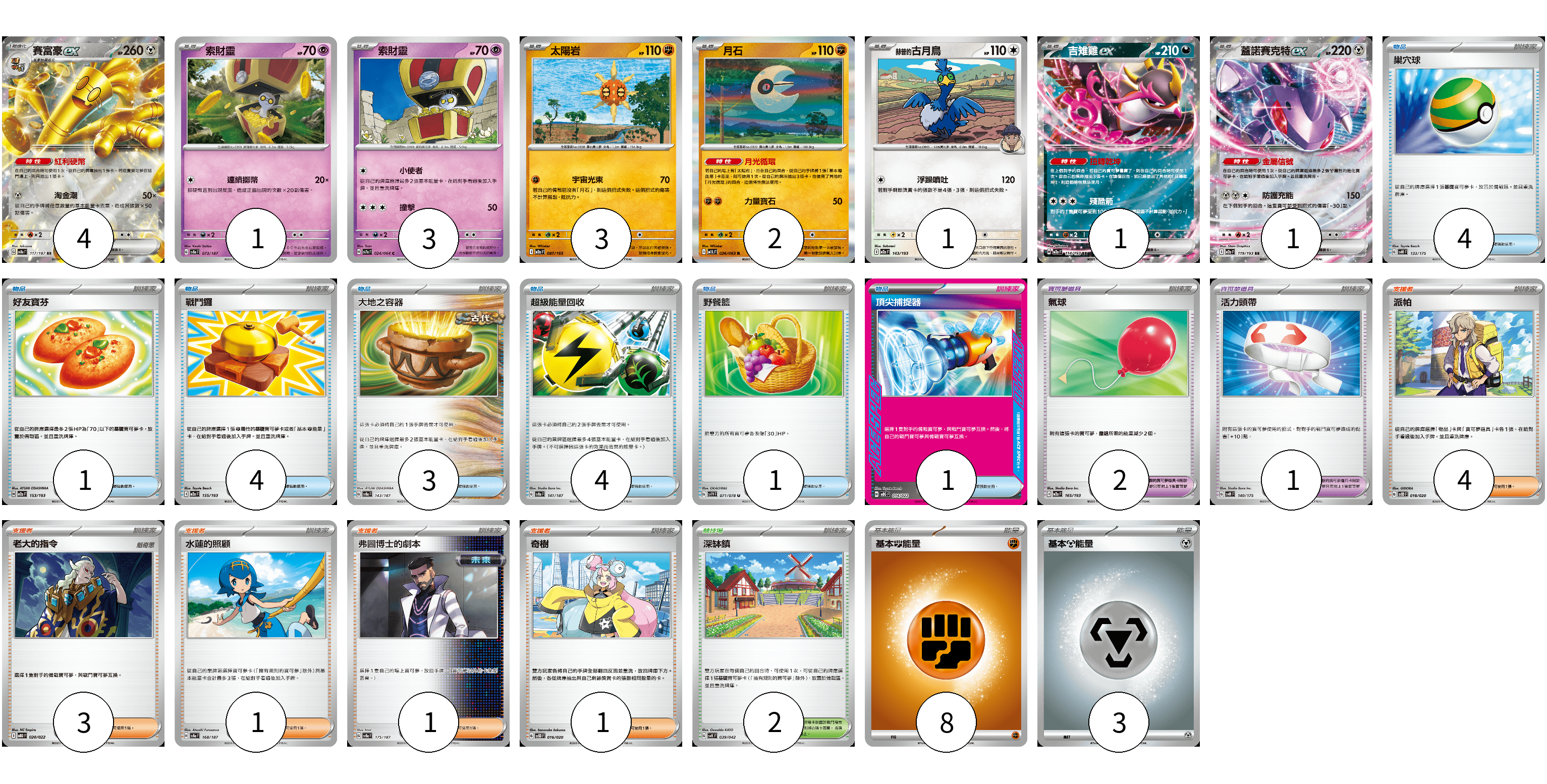 牌組構築方案 以此牌組為基礎新構築牌組 顯示卡面 顯示列表 寶可夢卡(16) 4 1 3 3 2 1 1 1 寶可夢道具(3) 2 1 物品卡(18) 4 1 4 3 4 1 1 支援者卡(10) 4 3 1 1 1 競技場卡(2) 2 能量卡(11) 8 3 寶可夢卡(16) 卡牌名稱 張數 卡牌名稱 張數 賽富豪ex SV8a 117/187 04 索財靈 SV8a 073/187 01 索財靈 SV7a 024/064 03 太陽岩 M2a 087/193 03 月石 M1L 026/063 02 赫普的古月鳥 M2a 143/193 01 吉雉雞ex M2a 114/193 01 蓋諾賽克特ex M2a 119/193 01 寶可夢道具(3) 卡牌名稱 張數 卡牌名稱 張數 氣球 M2a 165/193 02 活力頭帶 SVM 140/175 01 物品卡(18) 卡牌名稱 張數 卡牌名稱 張數 巢穴球 SVM 133/175 04 好友寶芬 M2a 153/193 01 戰鬥鑼 M2a 155/193 04 大地之容器 SV8a 143/187 03 超級能量回收 SV8a 141/187 04 野餐籃 SV1V 071/078 01 頂尖捕捉器 MBG 014/022 01 支援者卡(10) 卡牌名稱 張數 卡牌名稱 張數 派帕 SVOD 018/020 04 老大的指令 MBD 020/022 03 水蓮的照顧 SV8a 168/187 01 弗圖博士的劇本 SV8a 175/187 01 奇樹 SVOD 016/020 01 競技場卡(2) 卡牌名稱 張數 卡牌名稱 張數 深缽鎮 SVK 039/042 02 能量卡(11) 卡牌名稱 張數 卡牌名稱 張數 基本【鬥】能量 M-P FIG 08 基本【鋼】能量 M-P MET 03 以此牌組為基礎新構築牌組 牌組編碼 yJJvXm-FgFBBy-TTTgbX copy 列印牌組單 牌組編碼已複製 分享至SNS