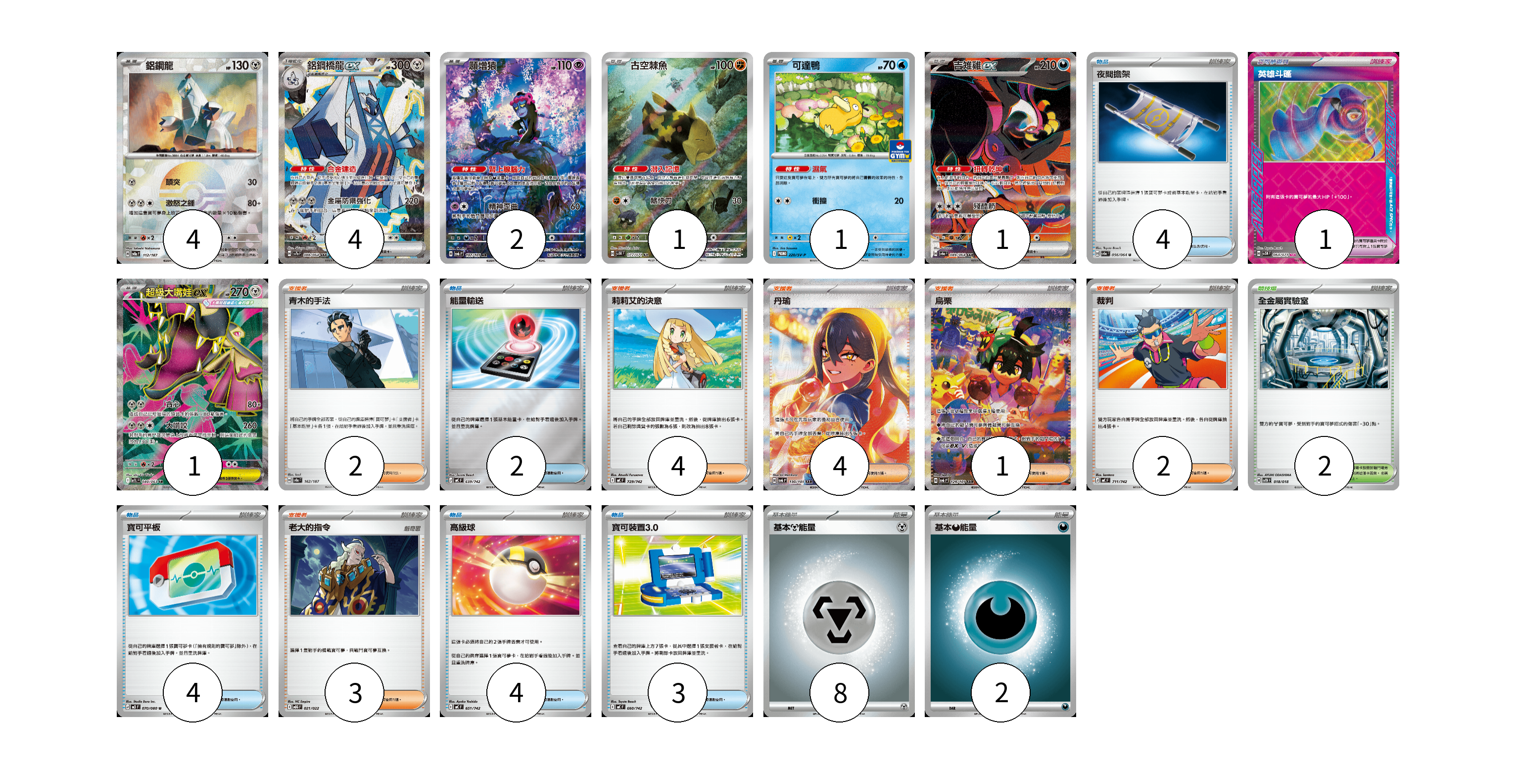 牌組構築方案 以此牌組為基礎新構築牌組 顯示卡面 顯示列表 寶可夢卡(14) 4 4 2 1 1 1 1 寶可夢道具(1) 1 物品卡(17) 4 2 4 4 3 支援者卡(16) 2 4 4 1 2 3 競技場卡(2) 2 能量卡(10) 8 2 寶可夢卡(14) 卡牌名稱 張數 卡牌名稱 張數 鋁鋼龍 SV8a 112/187 04 鋁鋼橋龍ex SV7a 088/064 04 願增猿 SV6 107/101 02 古空棘魚 SV5K 077/071 01 可達鴨 SV-P 220/SV-P 01 吉雉雞ex SV6a 089/064 01 超級大嘴娃ex M1L 080/063 01 寶可夢道具(1) 卡牌名稱 張數 卡牌名稱 張數 英雄斗篷 SV5M 064/071 01 物品卡(17) 卡牌名稱 張數 卡牌名稱 張數 夜間擔架 SV6a 056/064 04 能量輸送 MC 639/742 02 寶可平板 M3 070/080 04 高級球 MC 651/742 04 寶可裝置3.0 MC 660/742 03 支援者卡(16) 卡牌名稱 張數 卡牌名稱 張數 青木的手法 SV8a 162/187 02 莉莉艾的決意 MC 729/742 04 丹瑜 SV6 130/101 04 烏栗 SV6 129/101 01 裁判 MC 711/742 02 老大的指令 MBG 021/022 03 競技場卡(2) 卡牌名稱 張數 卡牌名稱 張數 全金屬實驗室 SVTH 018/018 02 能量卡(10) 卡牌名稱 張數 卡牌名稱 張數 基本【鋼】能量 MC MET 08 基本【惡】能量 MC DAR 02 以此牌組為基礎新構築牌組 牌組編碼 yLkrOh-DuAQfE-BWFSbw copy 列印牌組單 牌組編碼已複製 分享至SNS