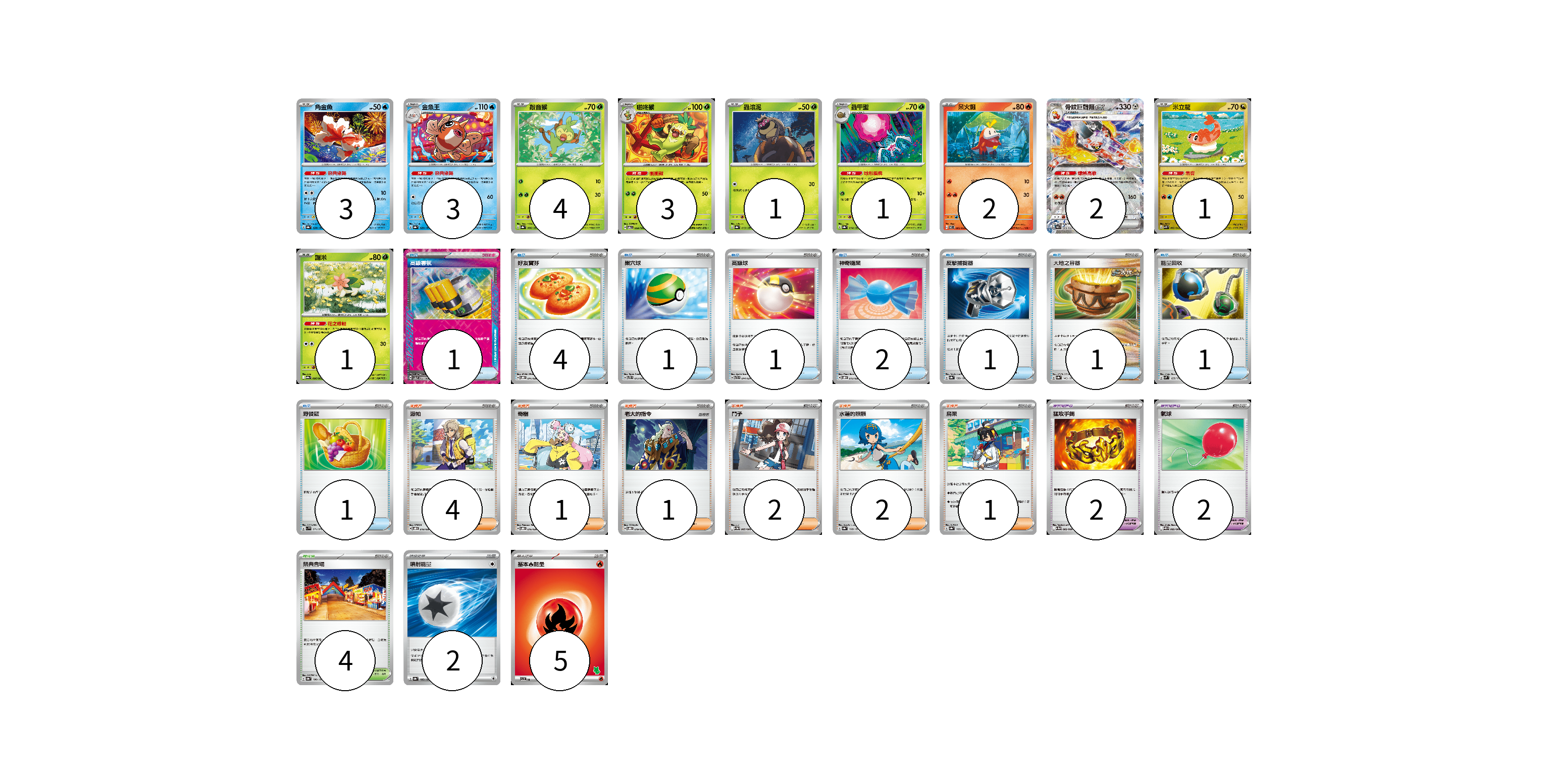牌組構築方案 以此牌組為基礎新構築牌組 顯示卡面 顯示列表 寶可夢卡(21) 3 3 4 3 1 1 2 2 1 1 寶可夢道具(4) 2 2 物品卡(13) 1 4 1 1 2 1 1 1 1 支援者卡(11) 4 1 1 2 2 1 競技場卡(4) 4 能量卡(7) 2 5 寶可夢卡(21) 卡牌名稱 張數 卡牌名稱 張數 角金魚 SV8a 028/187 03 金魚王 SV8a 029/187 03 敲音猴 SV8a 006/187 04 啪咚猴 SV6 009/101 03 蟲滾泥 SV8a 013/187 01 蟲甲聖 SV8a 014/187 01 呆火鱷 SVEL 005/020 02 骨紋巨聲鱷ex SVEL 008/020 02 米立龍 SVK 002/042 01 謝米 SV9a 006/063 01 寶可夢道具(4) 卡牌名稱 張數 卡牌名稱 張數 猛攻手鐲 SV11W 082/086 02 氣球 SV11B 082/086 02 物品卡(13) 卡牌名稱 張數 卡牌名稱 張數 高級香氛 SV5a 055/066 01 好友寶芬 SVOD 011/020 04 巢穴球 SVTS 013/022 01 高級球 SVTR 014/021 01 神奇糖果 SVOD 013/020 02 反擊捕捉器 SV8a 139/187 01 大地之容器 SV8a 143/187 01 能量回收 SVM 125/175 01 野餐籃 SV1V 071/078 01 支援者卡(11) 卡牌名稱 張數 卡牌名稱 張數 派帕 SVOD 018/020 04 奇樹 SVOD 016/020 01 老大的指令 SVOD 019/020 01 鬥子 SV11W 085/086 02 水蓮的照顧 SV8a 168/187 02 烏栗 SV8a 169/187 01 競技場卡(4) 卡牌名稱 張數 卡牌名稱 張數 祭典會場 SV8a 180/187 04 能量卡(7) 卡牌名稱 張數 卡牌名稱 張數 噴射能量 SV8a 185/187 02 基本【火】能量 SVI FIR 05 以此牌組為基礎新構築牌組 牌組編碼 yMTQxP-KbdkzH-xlcUYB copy 列印牌組單 牌組編碼已複製 分享至SNS
