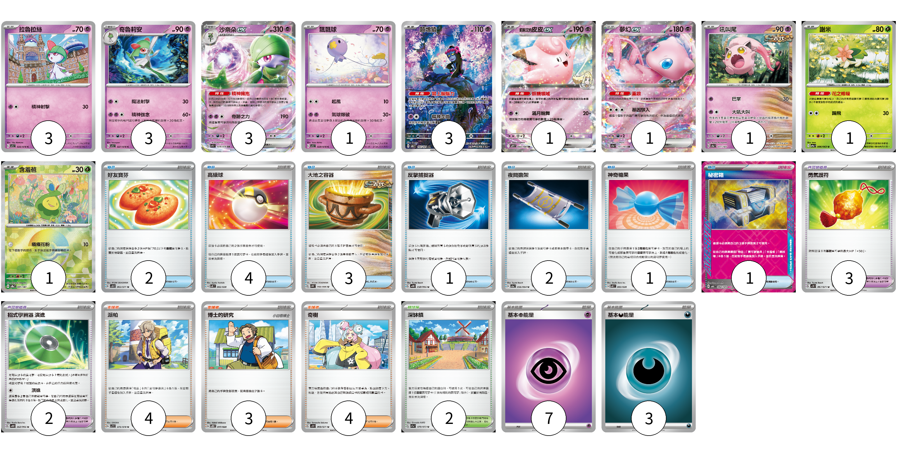 牌組構築方案 以此牌組為基礎新構築牌組 顯示卡面 顯示列表 寶可夢卡(18) 3 3 3 1 3 1 1 1 1 1 寶可夢道具(5) 3 2 物品卡(14) 2 4 3 1 2 1 1 支援者卡(11) 4 3 4 競技場卡(2) 2 能量卡(10) 7 3 寶可夢卡(18) 卡牌名稱 張數 卡牌名稱 張數 拉魯拉絲 SV1S 026/078 03 奇魯莉安 SV1S 027/078 03 沙奈朵ex SV1S 028/078 03 飄飄球 SV1S 029/078 01 願增猿 SV6 107/101 03 莉莉艾的皮皮ex SV9 033/100 01 夢幻ex SV2a 151/165 01 吼叫尾 SV8a 071/187 01 謝米 SV9a 006/063 01 含羞苞 SV8a 001/187 01 寶可夢道具(5) 卡牌名稱 張數 卡牌名稱 張數 勇氣護符 SV2D 067/071 03 招式學習器 演進 SV4M 063/066 02 物品卡(14) 卡牌名稱 張數 卡牌名稱 張數 好友寶芬 SV5K 063/071 02 高級球 SVB 002/028 04 大地之容器 SV4K 060/066 03 反擊捕捉器 SV4M 059/066 01 夜間擔架 SV6a 056/064 02 神奇糖果 SVB 003/028 01 秘密箱 SV6 092/101 01 支援者卡(11) 卡牌名稱 張數 卡牌名稱 張數 派帕 SV1V 076/078 04 博士的研究 SVOD 017/020 03 奇樹 SV2D 069/071 04 競技場卡(2) 卡牌名稱 張數 卡牌名稱 張數 深缽鎮 SV1a 070/073 02 能量卡(10) 卡牌名稱 張數 卡牌名稱 張數 基本超能量 sv-p PSY 07 基本惡能量 sv-p DAR 03 以此牌組為基礎新構築牌組 牌組編碼 yMvEwD-Dlyrre-CaHqsl copy 列印牌組單 牌組編碼已複製 分享至SNS