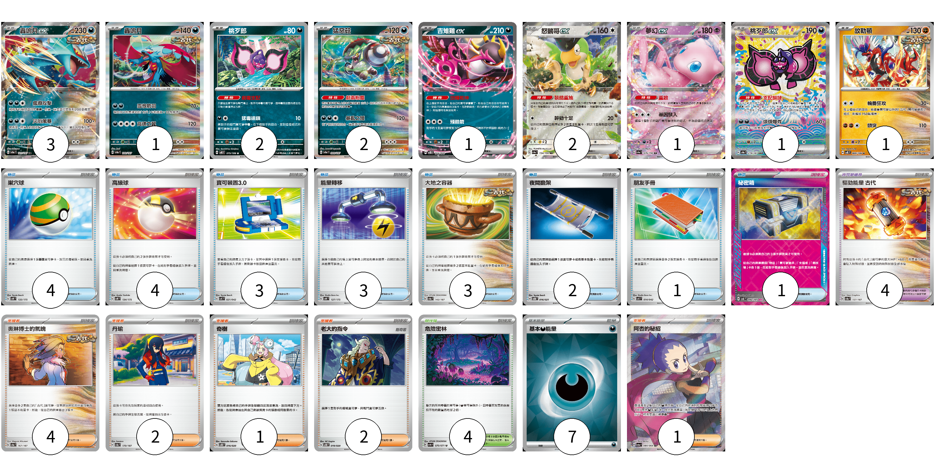 牌組構築方案 以此牌組為基礎新構築牌組 顯示卡面 顯示列表 寶可夢卡(14) 3 1 2 2 1 2 1 1 1 寶可夢道具(4) 4 物品卡(21) 4 4 3 3 3 2 1 1 支援者卡(10) 4 2 1 2 1 競技場卡(4) 4 能量卡(7) 7 寶可夢卡(14) 卡牌名稱 張數 卡牌名稱 張數 轟鳴月ex SV8a 101/187 03 轟鳴月 SV8a 100/187 01 桃歹郎 SV8 075/106 02 猛惡菇 SV8a 099/187 02 吉雉雞ex SVOD 004/020 01 怒鸚哥ex SV4a 154/190 02 夢幻ex SV4a 076/190 01 桃歹郎ex SV8a 219/187 01 故勒頓 SV8 069/106 01 寶可夢道具(4) 卡牌名稱 張數 卡牌名稱 張數 驅勁能量 古代 SV8a 157/187 04 物品卡(21) 卡牌名稱 張數 卡牌名稱 張數 巢穴球 SVM 133/175 04 高級球 SVM 134/175 04 寶可裝置3.0 SVK 021/042 03 能量轉移 SVM 127/175 03 大地之容器 SV8a 143/187 03 夜間擔架 SVOM 016/021 02 朋友手冊 SVK 014/042 01 秘密箱 SV6 092/101 01 支援者卡(10) 卡牌名稱 張數 卡牌名稱 張數 奧琳博士的氣魄 SV8a 167/187 04 丹瑜 SV8a 170/187 02 奇樹 SVOD 016/020 01 老大的指令 SVOD 019/020 02 阿杏的秘招 SV6a 084/064 01 競技場卡(4) 卡牌名稱 張數 卡牌名稱 張數 危險密林 SV5K 070/071 04 能量卡(7) 卡牌名稱 張數 卡牌名稱 張數 基本【惡】能量 SVOM DAR 07 以此牌組為基礎新構築牌組 牌組編碼 yNYrBX-JIgtDU-JyEcSY copy 列印牌組單 牌組編碼已複製 分享至SNS