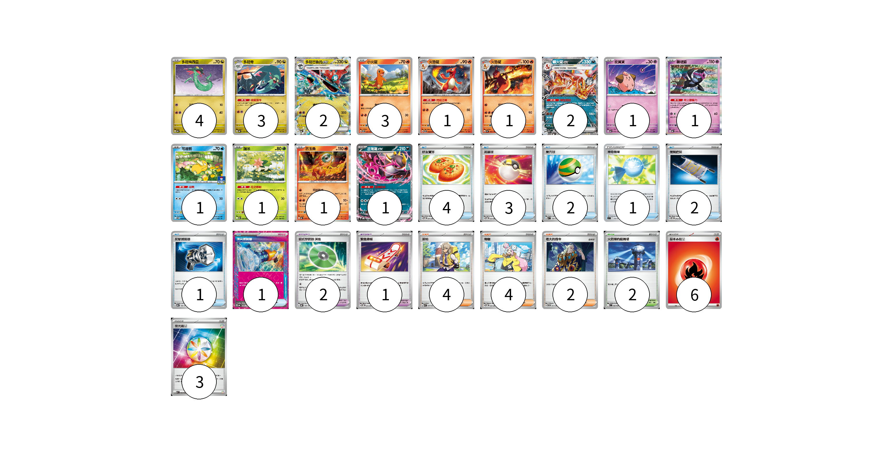 牌組構築方案 以此牌組為基礎新構築牌組 顯示卡面 顯示列表 寶可夢卡(22) 4 3 2 3 1 1 2 1 1 1 1 1 1 寶可夢道具(3) 2 1 物品卡(14) 4 3 2 1 2 1 1 支援者卡(10) 4 4 2 競技場卡(2) 2 能量卡(9) 6 3 寶可夢卡(22) 卡牌名稱 張數 卡牌名稱 張數 多龍梅西亞 SV8a 118/187 04 多龍奇 SV8a 119/187 03 多龍巴魯托ex SV8a 120/187 02 小火龍 SVTL 001/021 03 火恐龍 SVTL 002/021 01 火恐龍 SV2a 005/165 01 噴火龍ex SVTL 006/021 02 皮寶寶 SV4a 077/190 01 願增猿 SV8a 075/187 01 可達鴨 SV-P 220/SV-P 01 謝米 SV9a 006/063 01 古玉魚 SV8a 025/187 01 吉雉雞ex SVOD 004/020 01 寶可夢道具(3) 卡牌名稱 張數 卡牌名稱 張數 招式學習器 演進 SV8a 160/187 02 緊急滑板 SVOD 015/020 01 物品卡(14) 卡牌名稱 張數 卡牌名稱 張數 好友寶芬 SVOD 011/020 04 高級球 SVOD 012/020 03 巢穴球 SVM 133/175 02 神奇糖果 SI 376/414 01 夜間擔架 SVOM 016/021 02 反擊捕捉器 SV8a 139/187 01 頂尖捕捉器 SV8a 148/187 01 支援者卡(10) 卡牌名稱 張數 卡牌名稱 張數 派帕 SVK 035/042 04 奇樹 SVOD 016/020 04 老大的指令 SVTH 017/018 02 競技場卡(2) 卡牌名稱 張數 卡牌名稱 張數 火箭隊的監視塔 SV10 096/098 02 能量卡(9) 卡牌名稱 張數 卡牌名稱 張數 基本火能量 sv-p FIR 06 夜光能量 SVK 042/042 03 以此牌組為基礎新構築牌組 牌組編碼 yNsOun-foqNhI-qSAJZG copy 列印牌組單 牌組編碼已複製 分享至SNS