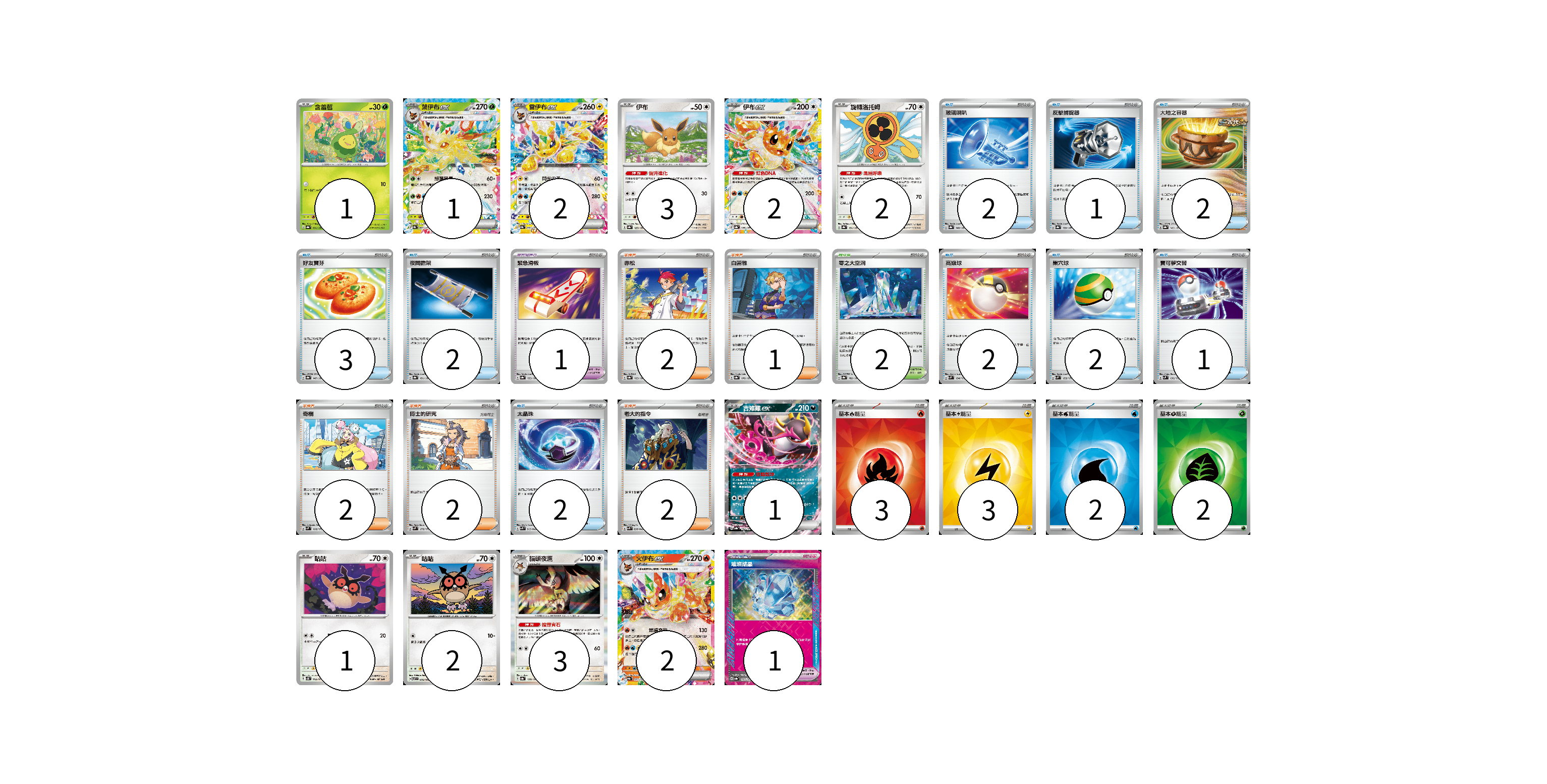 牌組構築方案 以此牌組為基礎新構築牌組 顯示卡面 顯示列表 寶可夢卡(20) 1 1 2 3 2 2 1 1 2 3 2 寶可夢道具(2) 1 1 物品卡(17) 2 1 2 3 2 2 2 1 2 支援者卡(9) 2 1 2 2 2 競技場卡(2) 2 能量卡(10) 3 3 2 2 寶可夢卡(20) 卡牌名稱 張數 卡牌名稱 張數 含羞苞 SV8a 001/187 01 葉伊布ex SV8a 003/187 01 雷伊布ex SV8a 052/187 02 伊布 SV8a 125/187 03 伊布ex SV8a 126/187 02 旋轉洛托姆 SV8a 131/187 02 吉雉雞ex SV8a 104/187 01 咕咕 SV5K 054/071 01 咕咕 SV7 076/102 02 貓頭夜鷹 SV8a 128/187 03 火伊布ex SV8a 022/187 02 寶可夢道具(2) 卡牌名稱 張數 卡牌名稱 張數 緊急滑板 SV8a 153/187 01 璀璨結晶 SV8a 152/187 01 物品卡(17) 卡牌名稱 張數 卡牌名稱 張數 玻璃喇叭 SV8a 140/187 02 反擊捕捉器 SV8a 139/187 01 大地之容器 SV8a 143/187 02 好友寶芬 SV8a 147/187 03 夜間擔架 SV8a 151/187 02 高級球 SVM 134/175 02 巢穴球 SVM 133/175 02 寶可夢交替 SVM 136/175 01 太晶珠 SVK 013/042 02 支援者卡(9) 卡牌名稱 張數 卡牌名稱 張數 赤松 SV8a 163/187 02 白蕾雅 SV8a 176/187 01 奇樹 SVM 160/175 02 博士的研究 SVM 170/175 02 老大的指令 SVK 036/042 02 競技場卡(2) 卡牌名稱 張數 卡牌名稱 張數 零之大空洞 SV8a 182/187 02 能量卡(10) 卡牌名稱 張數 卡牌名稱 張數 基本【火】能量 SVK FIR 03 基本【雷】能量 SVK LIG 03 基本【水】能量 SVK WAT 02 基本【草】能量 SVK GRA 02 以此牌組為基礎新構築牌組 牌組編碼 yPayyi-NWNgVF-HQrghD copy 列印牌組單 牌組編碼已複製 分享至SNS