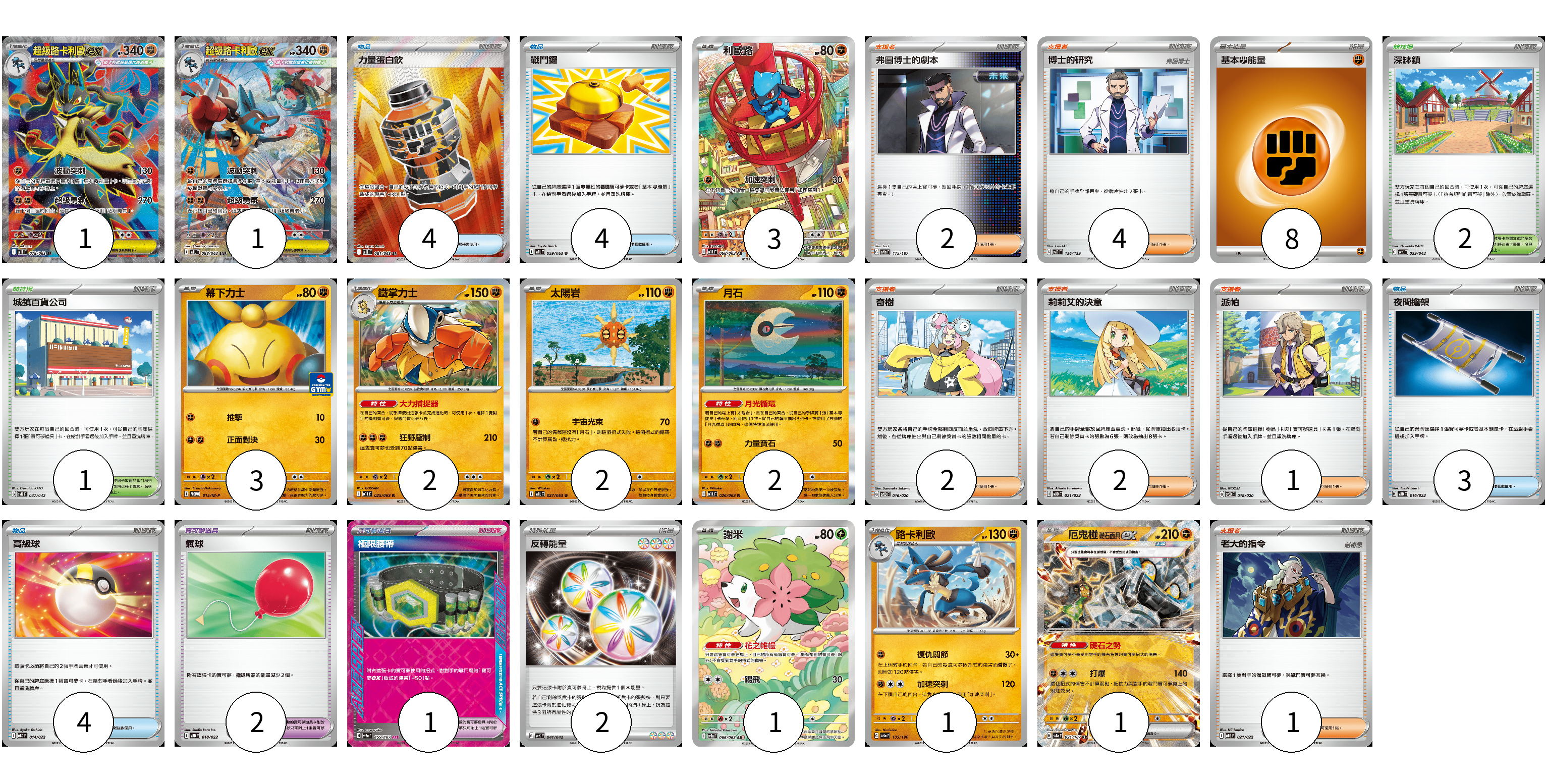 牌組構築方案 以此牌組為基礎新構築牌組 顯示卡面 顯示列表 寶可夢卡(17) 1 1 3 3 2 2 2 1 1 1 寶可夢道具(3) 2 1 物品卡(15) 4 4 3 4 支援者卡(12) 2 4 2 2 1 1 競技場卡(3) 2 1 能量卡(10) 8 2 寶可夢卡(17) 卡牌名稱 張數 卡牌名稱 張數 超級路卡利歐ex M1L 078/063 01 超級路卡利歐ex M1L 088/063 01 利歐路 M1L 068/063 03 幕下力士 M-P 015/M-P 03 鐵掌力士 M1L 025/063 02 太陽岩 M1L 027/063 02 月石 M1L 026/063 02 謝米 SV9a 066/063 01 路卡利歐 SV4a 105/190 01 厄鬼椪 礎石面具ex SV8a 091/187 01 寶可夢道具(3) 卡牌名稱 張數 卡牌名稱 張數 氣球 MBD 018/022 02 極限腰帶 SV8a 159/187 01 物品卡(15) 卡牌名稱 張數 卡牌名稱 張數 力量蛋白飲 M1L 081/063 04 戰鬥鑼 M1L 059/063 04 夜間擔架 MBD 016/022 03 高級球 MBD 014/022 04 支援者卡(12) 卡牌名稱 張數 卡牌名稱 張數 弗圖博士的劇本 SV8a 175/187 02 博士的研究(弗圖博士) SVD 136/139 04 奇樹 SVOD 016/020 02 莉莉艾的決意 MBD 021/022 02 派帕 SVOD 018/020 01 老大的指令 MBG 021/022 01 競技場卡(3) 卡牌名稱 張數 卡牌名稱 張數 深缽鎮 SVK 039/042 02 城鎮百貨公司 SVK 037/042 01 能量卡(10) 卡牌名稱 張數 卡牌名稱 張數 基本鬥能量 sv-p FIG 08 反轉能量 SVK 041/042 02 以此牌組為基礎新構築牌組 牌組編碼 yPwglz-CqhpSw-sXIAHu copy 列印牌組單 牌組編碼已複製 分享至SNS
