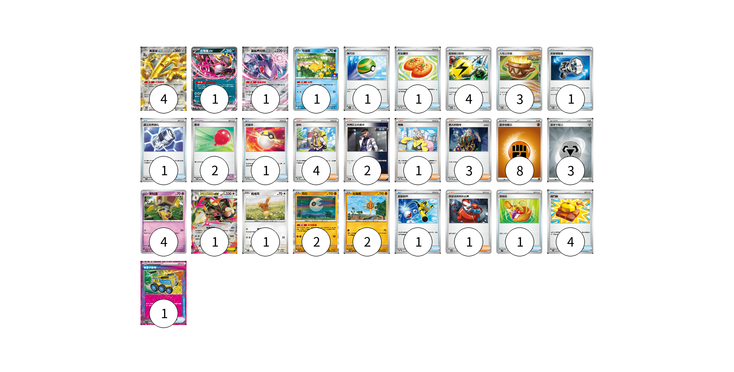 牌組構築方案 以此牌組為基礎新構築牌組 顯示卡面 顯示列表 寶可夢卡(17) 4 1 1 1 4 1 1 2 2 寶可夢道具(2) 2 物品卡(19) 1 1 4 3 1 1 1 1 1 4 1 支援者卡(11) 4 2 1 3 1 能量卡(11) 8 3 寶可夢卡(17) 卡牌名稱 張數 卡牌名稱 張數 賽富豪ex SV8a 117/187 04 吉雉雞ex SVOD 004/020 01 蓋諾賽克特ex SV11B 069/086 01 可達鴨 SV-P 220/SV-P 01 索財靈 SV8a 073/187 04 超級長耳兔ex M2 072/080 01 捲捲耳 M2 071/080 01 月石 M1L 026/063 02 太陽岩 M1L 027/063 02 寶可夢道具(2) 卡牌名稱 張數 卡牌名稱 張數 氣球 SV11B 082/086 02 物品卡(19) 卡牌名稱 張數 卡牌名稱 張數 巢穴球 SVM 133/175 01 好友寶芬 SVOD 011/020 01 超級能量回收 SV8a 141/187 04 大地之容器 SV8a 143/187 03 反擊捕捉器 SV8a 139/187 01 鐵之防禦強化 M1L 057/063 01 高級球 SVOD 012/020 01 厲害釣竿 SVOD 010/020 01 野餐籃 SV1V 071/078 01 戰鬥鑼 M1L 059/063 04 貴重手推車 SVK 020/042 01 支援者卡(11) 卡牌名稱 張數 卡牌名稱 張數 派帕 SVOD 018/020 04 弗圖博士的劇本 SV8a 175/187 02 奇樹 SVOD 016/020 01 老大的指令 SVOD 019/020 03 庫瑟洛斯奇的企圖 SV6a 062/064 01 能量卡(11) 卡牌名稱 張數 卡牌名稱 張數 基本【鬥】能量 M-P FIG 08 基本【鋼】能量 SVOD MET 03 以此牌組為基礎新構築牌組 牌組編碼 yQJOui-obgAuw-jYjZkM copy 列印牌組單 牌組編碼已複製 分享至SNS