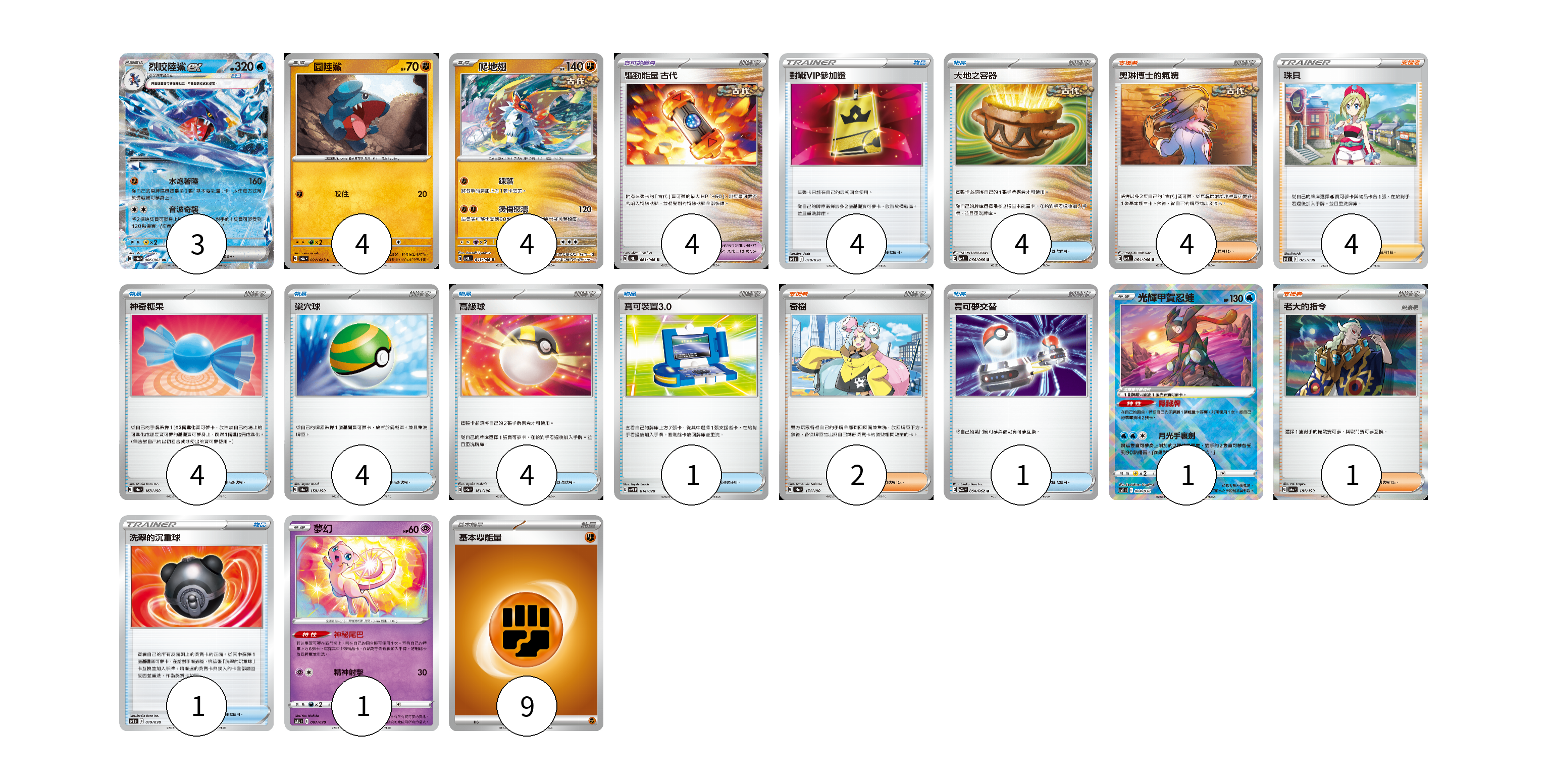 牌組構築方案 以此牌組為基礎新構築牌組 顯示卡面 顯示列表 寶可夢卡(13) 3 4 4 1 1 寶可夢道具(4) 4 物品卡(23) 4 4 4 4 4 1 1 1 支援者卡(11) 4 4 2 1 能量卡(9) 9 寶可夢卡(13) 卡牌名稱 張數 卡牌名稱 張數 烈咬陸鯊ex SV3a 006/062 03 圓陸鯊 SV3a 027/062 04 爬地翅 SV4K 041/066 04 光輝甲賀忍蛙 SVF 004/038 01 夢幻 SVEL 007/020 01 寶可夢道具(4) 卡牌名稱 張數 卡牌名稱 張數 驅勁能量 古代 SV4K 061/066 04 物品卡(23) 卡牌名稱 張數 卡牌名稱 張數 對戰VIP參加證 SVF 018/038 04 大地之容器 SV4K 060/066 04 神奇糖果 SV4a 163/190 04 巢穴球 SV4a 159/190 04 高級球 SV4a 161/190 04 寶可裝置3.0 SVEL 014/020 01 寶可夢交替 SV3a 054/062 01 洗翠的沉重球 SVF 019/038 01 支援者卡(11) 卡牌名稱 張數 卡牌名稱 張數 奧琳博士的氣魄 SV4K 064/066 04 珠貝 SVF 025/038 04 奇樹 SV4a 174/190 02 老大的指令 SV4a 181/190 01 能量卡(9) 卡牌名稱 張數 卡牌名稱 張數 基本【鬥】能量 SVF FIG 09 以此牌組為基礎新構築牌組 牌組編碼 yRAhPh-ZnRAaU-SoJrOB copy 列印牌組單 牌組編碼已複製 分享至SNS