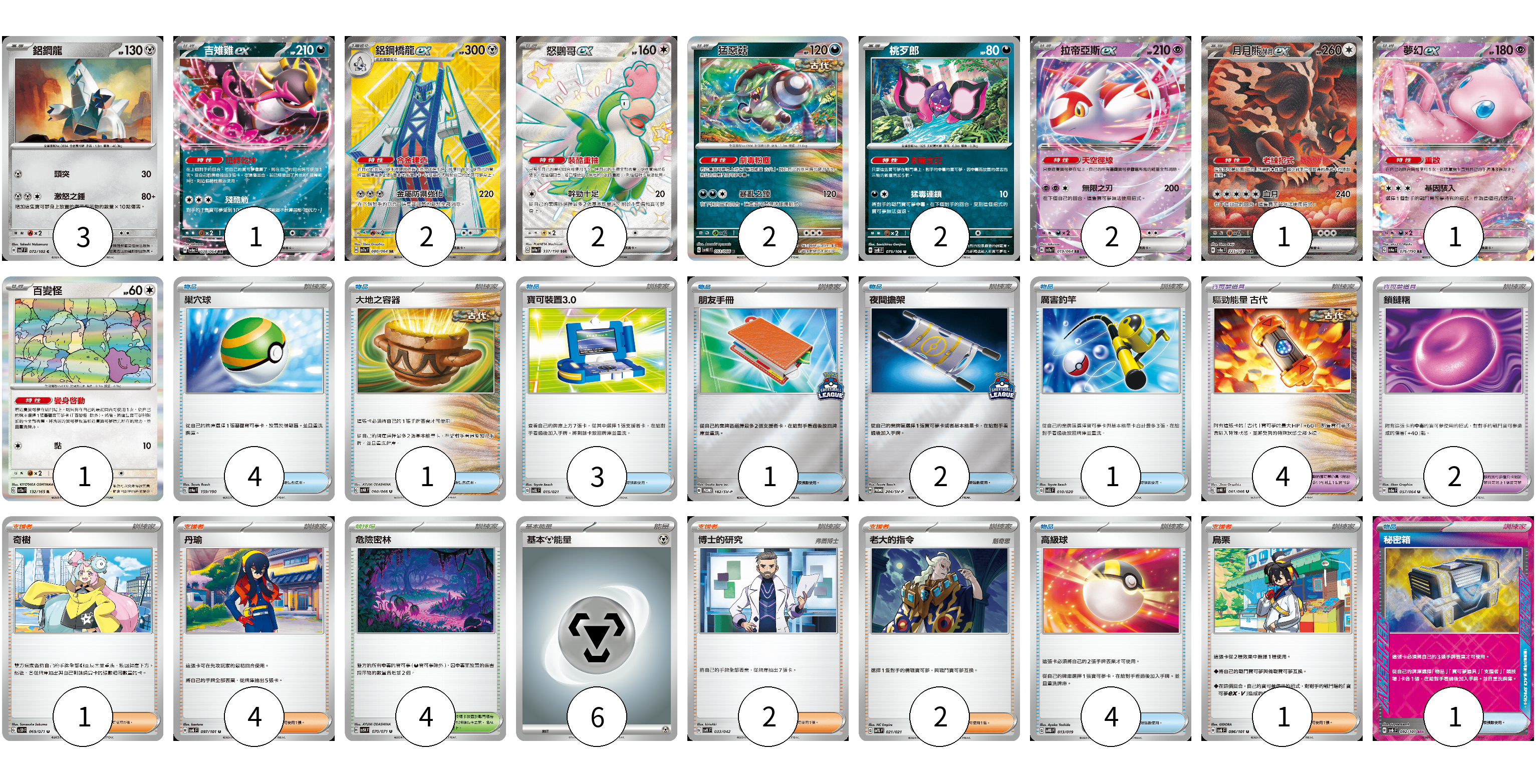 牌組構築方案 以此牌組為基礎新構築牌組 顯示卡面 顯示列表 寶可夢卡(18) 3 1 2 2 2 2 2 1 1 1 1 寶可夢道具(6) 4 2 物品卡(16) 4 1 3 1 2 4 1 支援者卡(10) 1 4 2 2 1 競技場卡(4) 4 能量卡(6) 6 寶可夢卡(18) 卡牌名稱 張數 卡牌名稱 張數 鋁鋼龍 SV7 072/102 03 吉雉雞ex SV6a 038/064 01 鋁鋼橋龍ex SV7a 080/064 02 怒鸚哥ex SV4a 337/190 02 猛惡菇 SV4K 053/066 02 桃歹郎 SV8 075/106 02 拉帝亞斯ex SV7a 019/064 02 月月熊 赫月ex SV8a 225/187 01 夢幻ex SV4a 076/190 01 百變怪 SV2a 132/165 01 厲害釣竿 SVEL 010/020 01 寶可夢道具(6) 卡牌名稱 張數 卡牌名稱 張數 驅勁能量 古代 SV4K 061/066 04 鎖鏈糬 SV6a 057/064 02 物品卡(16) 卡牌名稱 張數 卡牌名稱 張數 巢穴球 SV4a 159/190 04 大地之容器 SV4K 060/066 01 寶可裝置3.0 SVAL 015/021 03 朋友手冊 SV-P 182/SV-P 01 夜間擔架 SV-P 204/SV-P 02 高級球 SVTG 013/019 04 秘密箱 SV6 092/101 01 支援者卡(10) 卡牌名稱 張數 卡牌名稱 張數 奇樹 SV2D 069/071 01 丹瑜 SV6 097/101 04 博士的研究 SVK 033/042 02 老大的指令 SVTL 021/021 02 烏栗 SV6 096/101 01 競技場卡(4) 卡牌名稱 張數 卡牌名稱 張數 危險密林 SV5K 070/071 04 能量卡(6) 卡牌名稱 張數 卡牌名稱 張數 基本鋼能量 sv-p MET 06 以此牌組為基礎新構築牌組 牌組編碼 yRKNTi-yWugGP-BxlszS copy 列印牌組單 牌組編碼已複製 分享至SNS