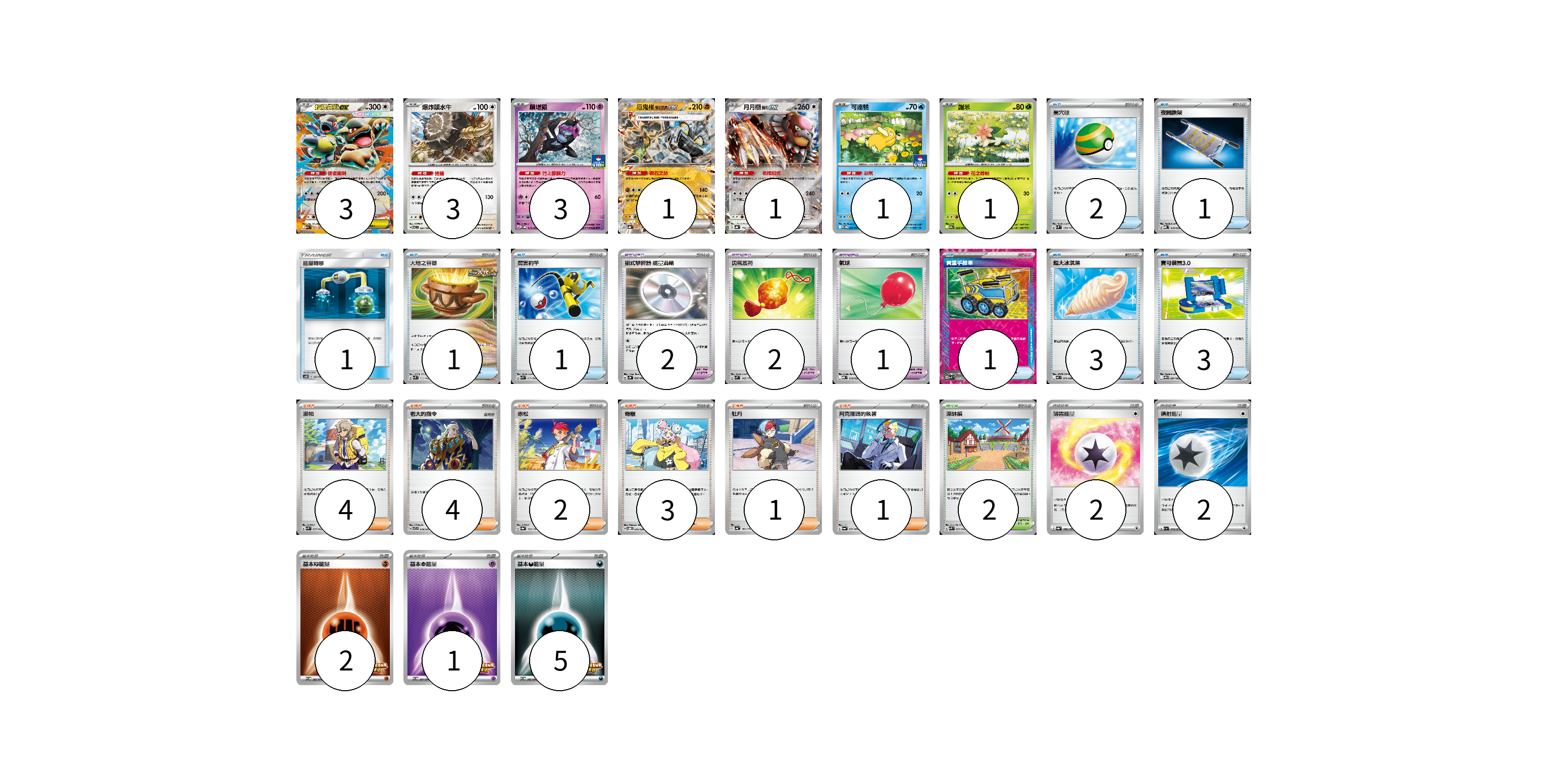 牌組構築方案 以此牌組為基礎新構築牌組 顯示卡面 顯示列表 寶可夢卡(13) 3 3 3 1 1 1 1 寶可夢道具(5) 2 2 1 物品卡(13) 2 1 1 1 1 1 3 3 支援者卡(15) 4 4 2 3 1 1 競技場卡(2) 2 能量卡(12) 2 2 2 1 5 寶可夢卡(13) 卡牌名稱 張數 卡牌名稱 張數 超級袋獸ex M1S 051/063 03 爆炸頭水牛 SV7 081/102 03 願增猿 M-P 014/M-P 03 厄鬼椪 礎石面具ex SV8a 091/187 01 月月熊 赫月ex SV8a 134/187 01 可達鴨 SV-P 220/SV-P 01 謝米 SV9a 006/063 01 寶可夢道具(5) 卡牌名稱 張數 卡牌名稱 張數 招式學習器 能量渦輪 SV3a 056/062 02 勇氣護符 SVM 142/175 02 氣球 MBD 018/022 01 物品卡(13) 卡牌名稱 張數 卡牌名稱 張數 巢穴球 SVM 133/175 02 夜間擔架 MBD 016/022 01 能量轉移 AS6D 142/168 01 大地之容器 SVK 012/042 01 厲害釣竿 SVK 011/042 01 貴重手推車 SVK 020/042 01 超大冰淇淋 M2 073/080 03 寶可裝置3.0 SV11B 081/086 03 支援者卡(15) 卡牌名稱 張數 卡牌名稱 張數 派帕 SVK 035/042 04 老大的指令 SVTR 019/021 04 赤松 SV8a 163/187 02 奇樹 SVOD 016/020 03 牡丹 SV4a 182/190 01 阿克羅瑪的執著 SV6a 059/064 01 競技場卡(2) 卡牌名稱 張數 卡牌名稱 張數 深缽鎮 SVK 039/042 02 能量卡(12) 卡牌名稱 張數 卡牌名稱 張數 薄霧能量 SV8a 186/187 02 噴射能量 SV1a 072/073 02 基本【鬥】能量 SV-P 262/SV-P 02 基本【超】能量 SV-P 261/SV-P 01 基本【惡】能量 SV-P 263/SV-P 05 以此牌組為基礎新構築牌組 牌組編碼 yRcwsE-BcsDiV-THUMXS copy 列印牌組單 牌組編碼已複製 分享至SNS