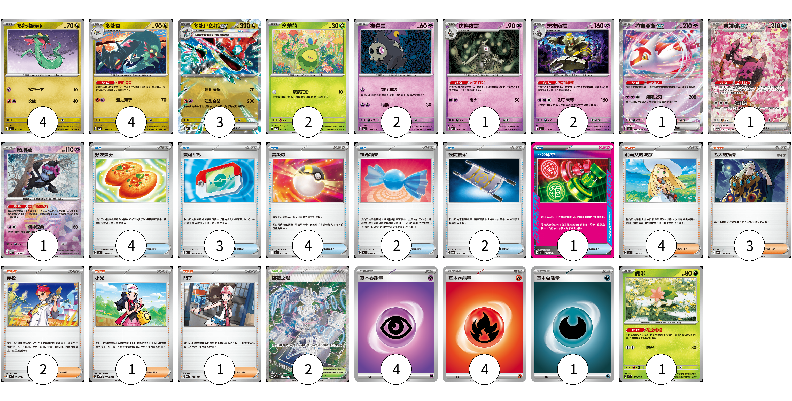 牌組構築方案 以此牌組為基礎新構築牌組 顯示卡面 顯示列表 寶可夢卡(22) 4 4 3 2 2 1 2 1 1 1 1 物品卡(16) 4 3 4 2 2 1 支援者卡(11) 4 3 2 1 1 競技場卡(2) 2 能量卡(9) 4 4 1 寶可夢卡(22) 卡牌名稱 張數 卡牌名稱 張數 多龍梅西亞 MC 546/742 04 多龍奇 MC 547/742 04 多龍巴魯托ex MC 548/742 03 含羞苞 M2a 011/193 02 夜巡靈 MC 308/742 02 彷徨夜靈 MC 309/742 01 黑夜魔靈 MC 310/742 02 拉帝亞斯ex M2a 075/193 01 吉雉雞ex M2a 244/193 01 願增猿 SV8a 075/187 01 謝米 M2a 012/193 01 物品卡(16) 卡牌名稱 張數 卡牌名稱 張數 好友寶芬 M2a 153/193 04 寶可平板 M3 070/080 03 高級球 MC 651/742 04 神奇糖果 MC 655/742 02 夜間擔架 M2a 159/193 02 不公印章 MC 633/742 01 支援者卡(11) 卡牌名稱 張數 卡牌名稱 張數 莉莉艾的決意 M2a 175/193 04 老大的指令 MBD 020/022 03 赤松 MC 696/742 02 小光 M2 077/080 01 鬥子 MC 718/742 01 競技場卡(2) 卡牌名稱 張數 卡牌名稱 張數 阻礙之塔 M2a 222/193 02 能量卡(9) 卡牌名稱 張數 卡牌名稱 張數 基本超能量 sv-p PSY 04 基本火能量 sv-p FIR 04 基本惡能量 sv-p DAR 01 以此牌組為基礎新構築牌組 牌組編碼 yRtpvw-fmNdmn-IwwLCu copy 列印牌組單 牌組編碼已複製 分享至SNS