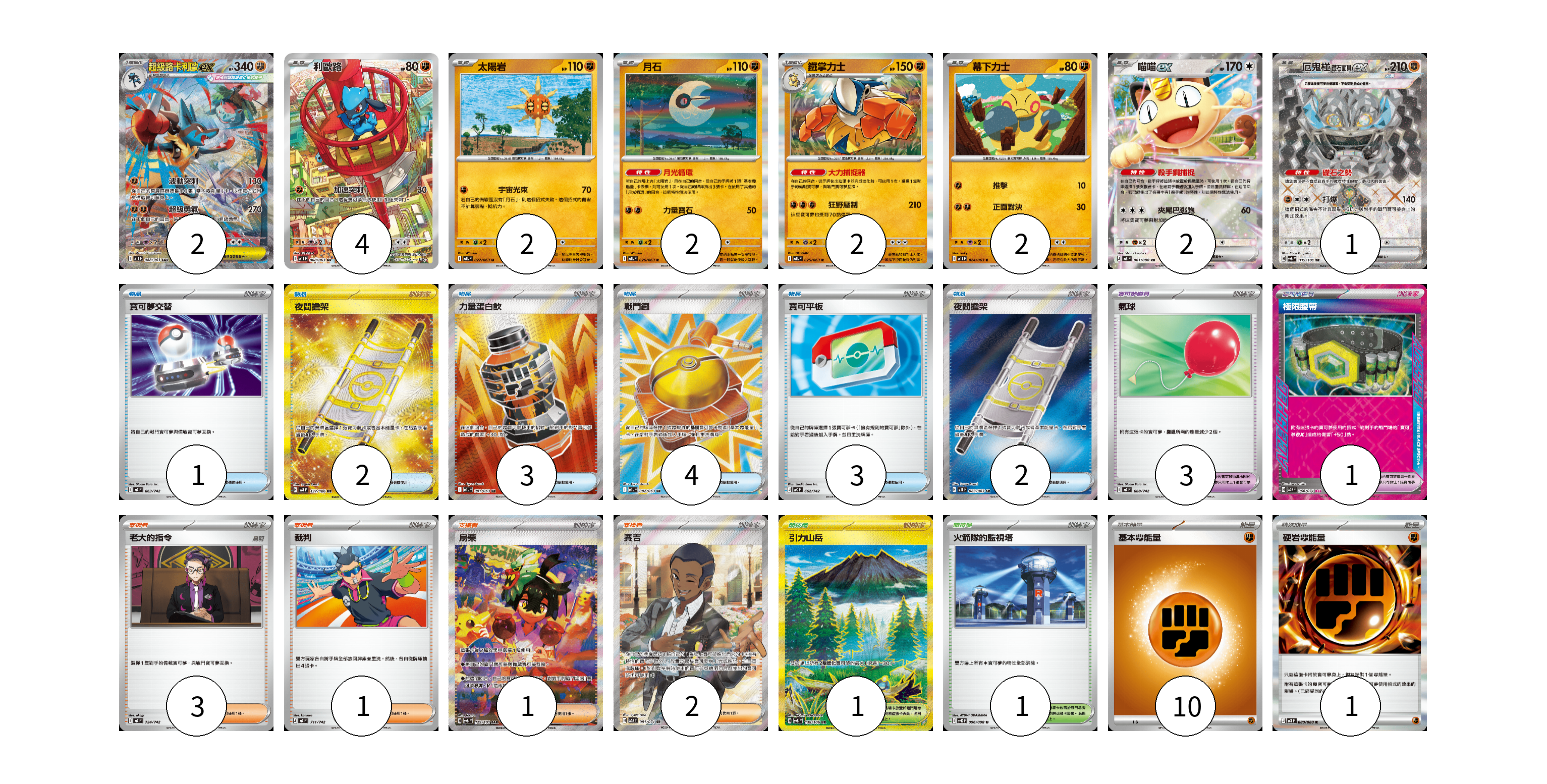 牌組構築方案 以此牌組為基礎新構築牌組 顯示卡面 顯示列表 寶可夢卡(17) 2 4 2 2 2 2 2 1 寶可夢道具(4) 3 1 物品卡(15) 1 2 3 4 3 2 支援者卡(7) 3 1 1 2 競技場卡(2) 1 1 能量卡(11) 10 1 寶可夢卡(17) 卡牌名稱 張數 卡牌名稱 張數 超級路卡利歐ex M1L 088/063 02 利歐路 M1L 068/063 04 太陽岩 M1L 027/063 02 月石 M1L 026/063 02 鐵掌力士 M1L 025/063 02 幕下力士 M1L 024/063 02 喵喵ex M3 061/080 02 厄鬼椪 礎石面具ex SV6 119/101 01 寶可夢道具(4) 卡牌名稱 張數 卡牌名稱 張數 氣球 MC 688/742 03 極限腰帶 SV5K 066/071 01 物品卡(15) 卡牌名稱 張數 卡牌名稱 張數 寶可夢交替 MC 663/742 01 夜間擔架 SV8 137/106 02 力量蛋白飲 M1L 081/063 03 戰鬥鑼 M1L 082/063 04 寶可平板 MC 662/742 03 夜間擔架 M1L 083/063 02 支援者卡(7) 卡牌名稱 張數 卡牌名稱 張數 老大的指令 MC 724/742 03 裁判 MC 711/742 01 烏栗 SV6 129/101 01 賽吉 SV5M 091/071 02 競技場卡(2) 卡牌名稱 張數 卡牌名稱 張數 引力山岳 SV8 138/106 01 火箭隊的監視塔 SV10 096/098 01 能量卡(11) 卡牌名稱 張數 卡牌名稱 張數 基本【鬥】能量 MC FIG 10 硬岩【鬥】能量 M3 080/080 01 以此牌組為基礎新構築牌組 牌組編碼 yTRzQr-zgHECo-YDJrWf copy 列印牌組單 牌組編碼已複製 分享至SNS