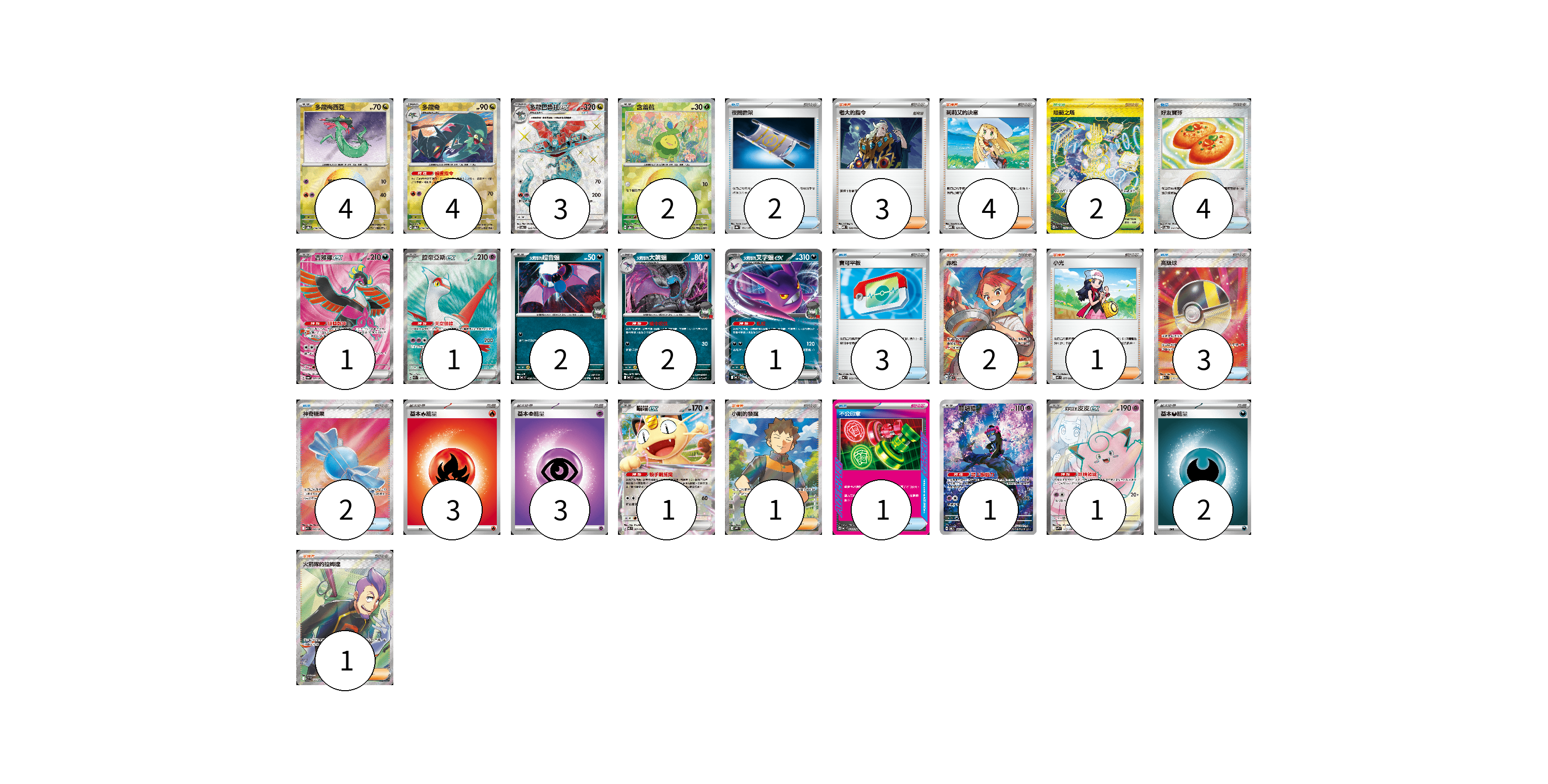 牌組構築方案 以此牌組為基礎新構築牌組 顯示卡面 顯示列表 寶可夢卡(23) 4 4 3 2 1 1 2 2 1 1 1 1 物品卡(15) 2 4 3 3 2 1 支援者卡(12) 3 4 2 1 1 1 競技場卡(2) 2 能量卡(8) 3 3 2 寶可夢卡(23) 卡牌名稱 張數 卡牌名稱 張數 多龍梅西亞 SV8a 118/187 04 多龍奇 SV8a 119/187 04 多龍巴魯托ex SV6 120/101 03 含羞苞 SV8a 001/187 02 吉雉雞ex SV6a 081/064 01 拉帝亞斯ex SV7a 078/064 01 <火箭隊的>超音蝠 MC 438/742 02 <火箭隊的>大嘴蝠 MC 439/742 02 <火箭隊的>叉字蝠ex MC 440/742 01 喵喵ex M3 061/080 01 願增猿 SV6 107/101 01 莉莉艾的皮皮ex SV9 115/100 01 物品卡(15) 卡牌名稱 張數 卡牌名稱 張數 夜間擔架 SV8a 151/187 02 好友寶芬 SV8a 147/187 04 寶可平板 MC 662/742 03 高級球 M2a 216/193 03 神奇糖果 M1S 082/063 02 不公印章 MC 633/742 01 支援者卡(12) 卡牌名稱 張數 卡牌名稱 張數 老大的指令 MBD 020/022 03 莉莉艾的決意 MBD 021/022 04 赤松 SV7 123/102 02 小光 M2 077/080 01 小剛的發掘 SV9 123/100 01 火箭隊的拉姆達 SV10 122/098 01 競技場卡(2) 卡牌名稱 張數 卡牌名稱 張數 阻礙之塔 SV10 132/098 02 能量卡(8) 卡牌名稱 張數 卡牌名稱 張數 基本【火】能量 MC FIR 03 基本【超】能量 MC PSY 03 基本【惡】能量 MC DAR 02 以此牌組為基礎新構築牌組 牌組編碼 yUIxSW-lAwzvG-tlRYJj copy 列印牌組單 牌組編碼已複製 分享至SNS