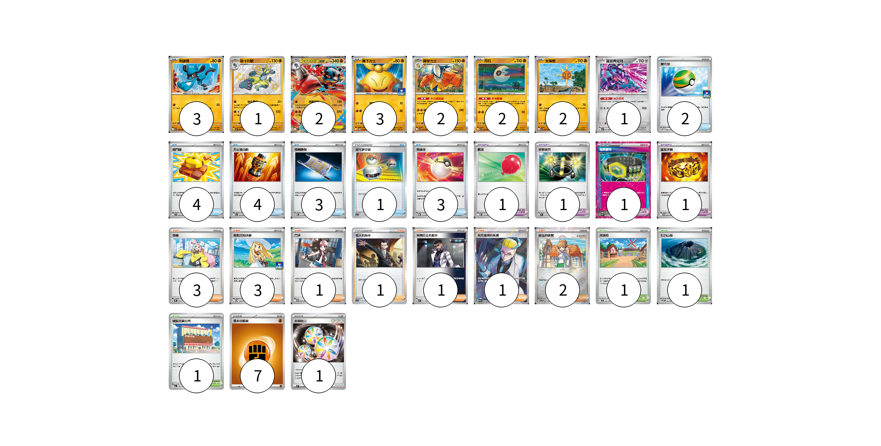 牌組構築方案 以此牌組為基礎新構築牌組 顯示卡面 顯示列表 寶可夢卡(16) 3 1 2 3 2 2 2 1 寶可夢道具(4) 1 1 1 1 物品卡(17) 2 4 4 3 1 3 支援者卡(12) 3 3 1 1 1 1 2 競技場卡(3) 1 1 1 能量卡(8) 7 1 寶可夢卡(16) 卡牌名稱 張數 卡牌名稱 張數 利歐路 M1L 028/063 03 路卡利歐 SV4a 281/190 01 超級路卡利歐ex M1L 029/063 02 幕下力士 M-P 015/M-P 03 鐵掌力士 M1L 025/063 02 月石 M1L 026/063 02 太陽岩 M1L 027/063 02 蓋諾賽克特 SV6a 040/064 01 寶可夢道具(4) 卡牌名稱 張數 卡牌名稱 張數 氣球 MBG 019/022 01 學習裝置 SV1S 072/078 01 極限腰帶 SV5K 066/071 01 猛攻手鐲 SV11W 082/086 01 物品卡(17) 卡牌名稱 張數 卡牌名稱 張數 巢穴球 SV-P 091/SV-P 02 戰鬥鑼 M1L 059/063 04 力量蛋白飲 M1L 058/063 04 夜間擔架 MBG 017/022 03 寶可夢交替 SC1D 155/164 01 高級球 SVQP 015/023 03 支援者卡(12) 卡牌名稱 張數 卡牌名稱 張數 奇樹 SV2D 069/071 03 莉莉艾的決意 M-P 018/M-P 03 鬥子 SV11W 085/086 01 老大的指令(坂木) SC1D 161/164 01 弗圖博士的劇本 SVK 034/042 01 阿克羅瑪的執著 SV6a 083/064 01 博士的研究 SV11B 084/086 02 競技場卡(3) 卡牌名稱 張數 卡牌名稱 張數 深缽鎮 SVF 036/038 01 引力山岳 SV8 106/106 01 城鎮百貨公司 SV3 107/108 01 能量卡(8) 卡牌名稱 張數 卡牌名稱 張數 基本【鬥】能量 SVAM FIG 07 反轉能量 SV2P 071/071 01 以此牌組為基礎新構築牌組 牌組編碼 yUdtVn-biQzwU-Socgsx copy 列印牌組單 牌組編碼已複製 分享至SNS