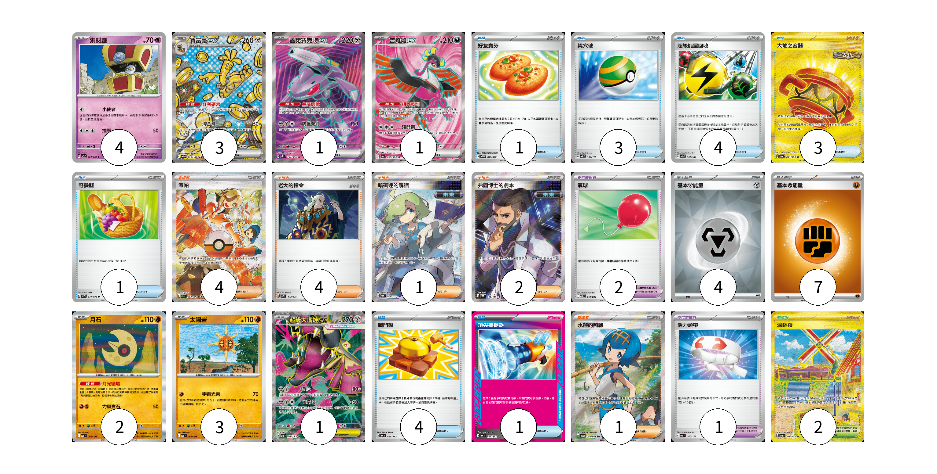 牌組構築方案 以此牌組為基礎新構築牌組 顯示卡面 顯示列表 寶可夢卡(15) 4 3 1 1 2 3 1 寶可夢道具(3) 2 1 物品卡(17) 1 3 4 3 1 4 1 支援者卡(12) 4 4 1 2 1 競技場卡(2) 2 能量卡(11) 4 7 寶可夢卡(15) 卡牌名稱 張數 卡牌名稱 張數 索財靈 SV7a 024/064 04 賽富豪ex SV8a 220/187 03 蓋諾賽克特ex SV11B 164/086 01 吉雉雞ex SV6a 081/064 01 月石 M2a 086/193 02 太陽岩 M2a 087/193 03 超級大嘴娃ex M1L 080/063 01 寶可夢道具(3) 卡牌名稱 張數 卡牌名稱 張數 氣球 MBG 019/022 02 活力頭帶 SVM 140/175 01 物品卡(17) 卡牌名稱 張數 卡牌名稱 張數 好友寶芬 MBD 013/022 01 巢穴球 SVM 133/175 03 超級能量回收 SV8a 141/187 04 大地之容器 SV6a 093/064 03 野餐籃 SV1V 071/078 01 戰鬥鑼 MC 654/742 04 頂尖捕捉器 MC 656/742 01 支援者卡(12) 卡牌名稱 張數 卡牌名稱 張數 派帕 SV4a 353/190 04 老大的指令 SVM 172/175 04 暗碼迷的解讀 SV5M 090/071 01 弗圖博士的劇本 SV4M 086/066 02 水蓮的照顧 SV5a 088/066 01 競技場卡(2) 卡牌名稱 張數 卡牌名稱 張數 深缽鎮 SV3 140/108 02 能量卡(11) 卡牌名稱 張數 卡牌名稱 張數 基本【鋼】能量 SVOD MET 04 基本【鬥】能量 M-P FIG 07 以此牌組為基礎新構築牌組 牌組編碼 yXRlJk-qnZlCl-TeoaJw copy 列印牌組單 牌組編碼已複製 分享至SNS