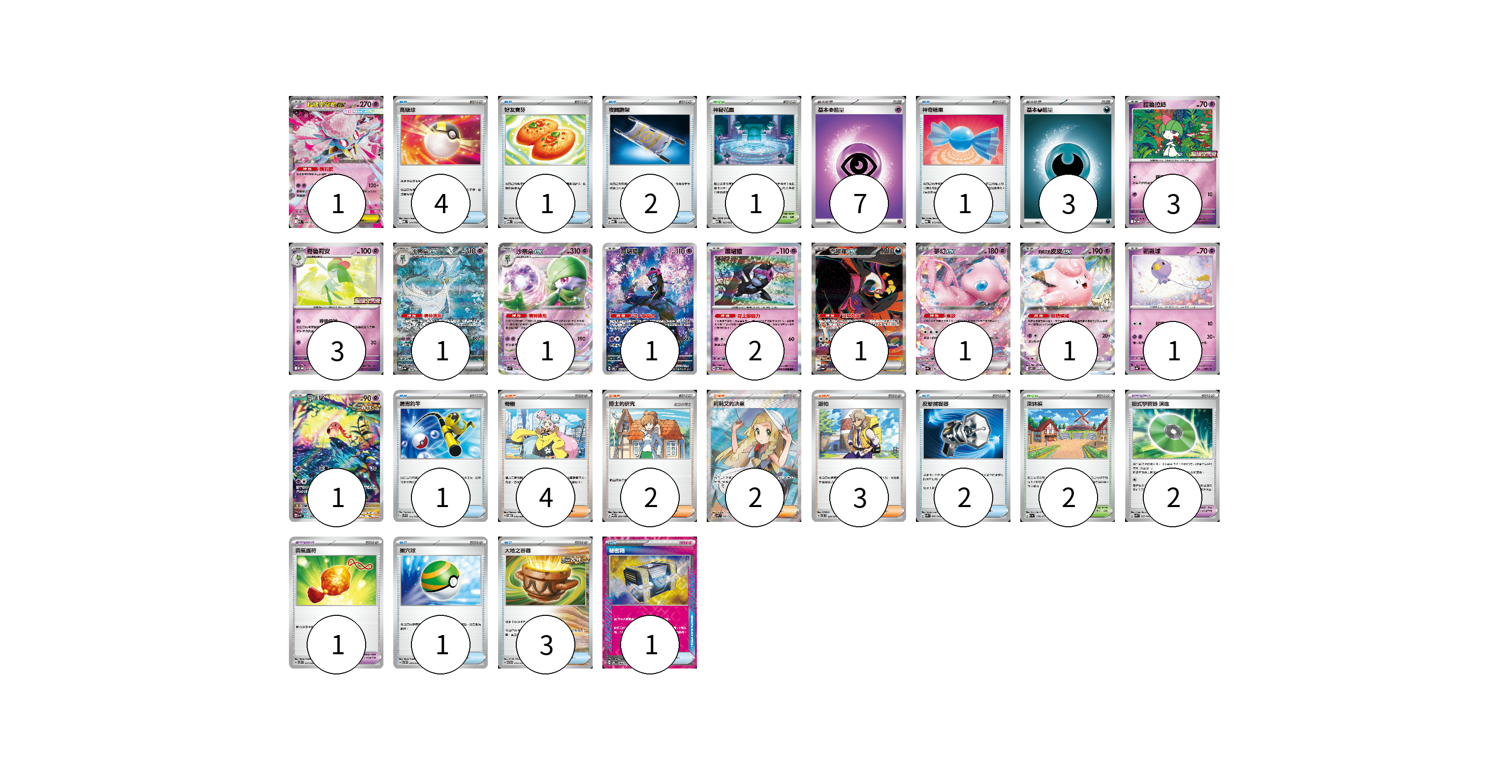 牌組構築方案 以此牌組為基礎新構築牌組 顯示卡面 顯示列表 寶可夢卡(17) 1 3 3 1 1 1 2 1 1 1 1 1 寶可夢道具(3) 2 1 物品卡(16) 4 1 2 1 1 2 1 3 1 支援者卡(11) 4 2 2 3 競技場卡(3) 1 2 能量卡(10) 7 3 寶可夢卡(17) 卡牌名稱 張數 卡牌名稱 張數 超級蒂安希ex MBD 006/022 01 拉魯拉絲 M-P 005/M-P 03 奇魯莉安 M-P 006/M-P 03 沙奈朵ex SV4a 348/190 01 沙奈朵ex SV1S 028/078 01 願增猿 SV6 107/101 01 願增猿 SV6 055/101 02 吉雉雞ex SV6a 089/064 01 夢幻ex SV4a 076/190 01 莉莉艾的皮皮ex SV9 033/100 01 飄飄球 SV4a 083/190 01 吼叫尾 SV4K 071/066 01 寶可夢道具(3) 卡牌名稱 張數 卡牌名稱 張數 招式學習器 演進 SVK 025/042 02 勇氣護符 SVTS 017/022 01 物品卡(16) 卡牌名稱 張數 卡牌名稱 張數 高級球 MBD 014/022 04 好友寶芬 MBD 013/022 01 夜間擔架 MBD 016/022 02 神奇糖果 MBG 013/022 01 厲害釣竿 SVF 013/038 01 反擊捕捉器 SVK 009/042 02 巢穴球 SVTH 010/018 01 大地之容器 SVTG 010/019 03 秘密箱 SV6 092/101 01 支援者卡(11) 卡牌名稱 張數 卡牌名稱 張數 奇樹 SVOD 016/020 04 博士的研究 SV11B 084/086 02 莉莉艾的決意 M1L 086/063 02 派帕 SVTL 020/021 03 競技場卡(3) 卡牌名稱 張數 卡牌名稱 張數 神秘花園 MBD 022/022 01 深缽鎮 SV1a 070/073 02 能量卡(10) 卡牌名稱 張數 卡牌名稱 張數 基本【超】能量 MBD PSY 07 基本【惡】能量 MBG DAR 03 以此牌組為基礎新構築牌組 牌組編碼 yXWNnz-XEFTfT-ucmBYG copy 列印牌組單 牌組編碼已複製 分享至SNS