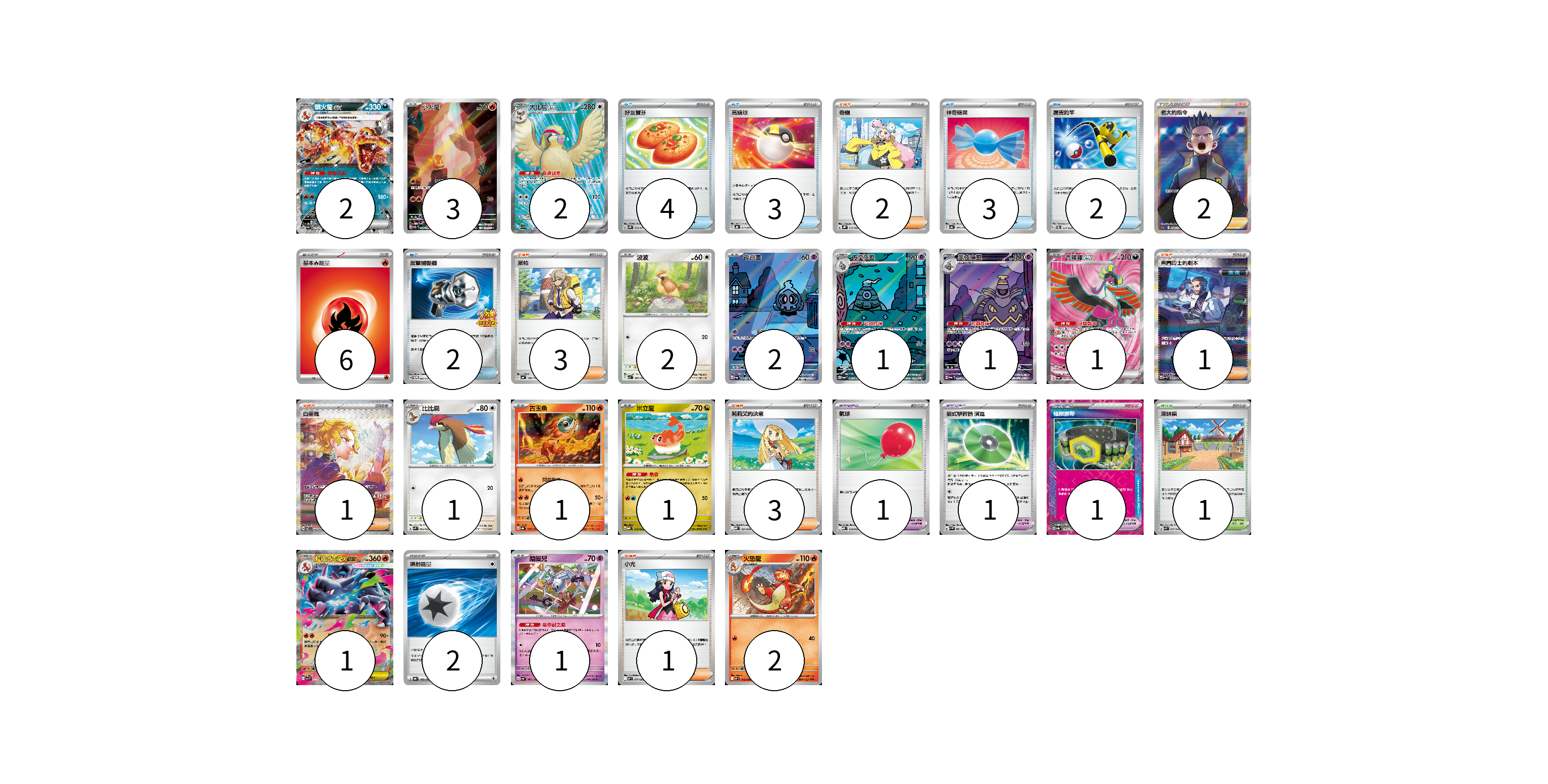 牌組構築方案 以此牌組為基礎新構築牌組 顯示卡面 顯示列表 寶可夢卡(21) 2 3 2 2 2 1 1 1 1 1 1 1 1 2 寶可夢道具(3) 1 1 1 物品卡(14) 4 3 3 2 2 支援者卡(13) 2 2 3 1 1 3 1 競技場卡(1) 1 能量卡(8) 6 2 寶可夢卡(21) 卡牌名稱 張數 卡牌名稱 張數 噴火龍ex SV4a 115/190 02 小火龍 SV2a 168/165 03 大比鳥ex SV3 128/108 02 波波 SV3 087/108 02 夜巡靈 SV6a 068/064 02 彷徨夜靈 SV6a 069/064 01 黑夜魔靈 SV6a 070/064 01 吉雉雞ex SV6a 081/064 01 比比鳥 SVK 004/042 01 古玉魚 SV8a 025/187 01 米立龍 MBD 010/022 01 超級噴火龍Xex M2 013/080 01 鑰圈兒 SV4a 087/190 01 火恐龍 M2 012/080 02 寶可夢道具(3) 卡牌名稱 張數 卡牌名稱 張數 氣球 MBD 018/022 01 招式學習器 演進 SV4M 063/066 01 極限腰帶 SV8a 159/187 01 物品卡(14) 卡牌名稱 張數 卡牌名稱 張數 好友寶芬 SV5K 063/071 04 高級球 SVHK 013/022 03 神奇糖果 SV4a 163/190 03 厲害釣竿 SVEM 011/020 02 反擊捕捉器 SV-P 083/SV-P 02 支援者卡(13) 卡牌名稱 張數 卡牌名稱 張數 奇樹 SVHK 019/022 02 老大的指令(赤日) S12a 250/172 02 派帕 SV4a 180/190 03 弗圖博士的劇本 SV4M 091/066 01 白蕾雅 SV7 132/102 01 莉莉艾的決意 MBD 021/022 03 小光 M2 077/080 01 競技場卡(1) 卡牌名稱 張數 卡牌名稱 張數 深缽鎮 SVK 039/042 01 能量卡(8) 卡牌名稱 張數 卡牌名稱 張數 基本【火】能量 SVHK FIR 06 噴射能量 SV8a 185/187 02 以此牌組為基礎新構築牌組 牌組編碼 yXvMAh-UzmtER-eQbggy copy 列印牌組單 牌組編碼已複製 分享至SNS