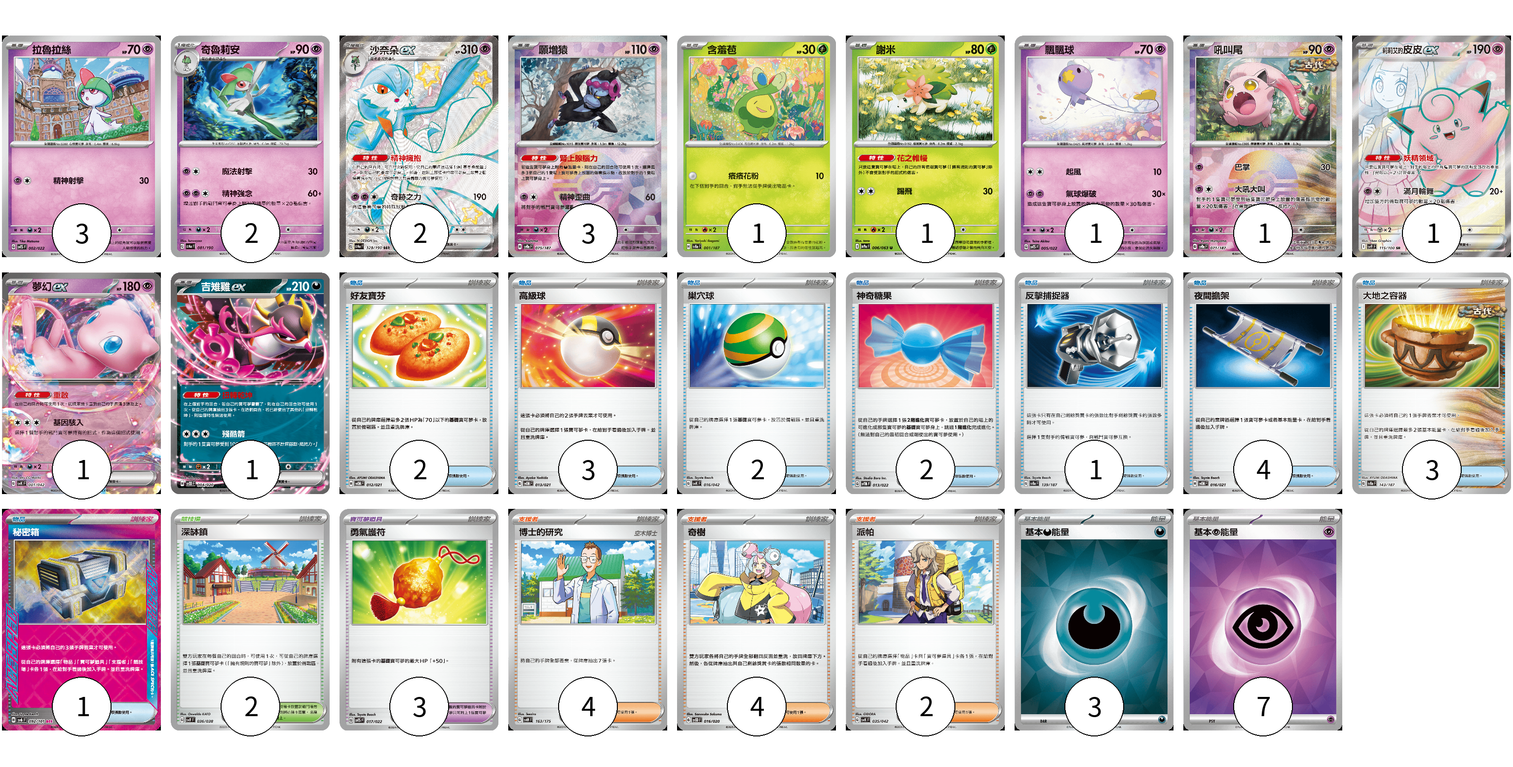 牌組構築方案 以此牌組為基礎新構築牌組 顯示卡面 顯示列表 寶可夢卡(17) 3 2 2 3 1 1 1 1 1 1 1 寶可夢道具(3) 3 物品卡(18) 2 3 2 2 1 4 3 1 支援者卡(10) 4 4 2 競技場卡(2) 2 能量卡(10) 3 7 寶可夢卡(17) 卡牌名稱 張數 卡牌名稱 張數 拉魯拉絲 SVTS 002/022 03 奇魯莉安 SV4a 081/190 02 沙奈朵ex SV4a 328/190 02 願增猿 SV8a 075/187 03 含羞苞 SV8a 001/187 01 謝米 SV9a 006/063 01 飄飄球 SVTS 005/022 01 吼叫尾 SV8a 071/187 01 莉莉艾的皮皮ex SV9 115/100 01 夢幻ex SVK 001/042 01 吉雉雞ex SVOD 004/020 01 寶可夢道具(3) 卡牌名稱 張數 卡牌名稱 張數 勇氣護符 SVTS 017/022 03 物品卡(18) 卡牌名稱 張數 卡牌名稱 張數 好友寶芬 SVOM 012/021 02 高級球 SVOM 013/021 03 巢穴球 SVK 016/042 02 神奇糖果 SVTM 013/022 02 反擊捕捉器 SV8a 139/187 01 夜間擔架 SVOM 016/021 04 大地之容器 SV8a 143/187 03 秘密箱 SV6 092/101 01 支援者卡(10) 卡牌名稱 張數 卡牌名稱 張數 博士的研究 SVM 163/175 04 奇樹 SVOD 016/020 04 派帕 SVK 035/042 02 競技場卡(2) 卡牌名稱 張數 卡牌名稱 張數 深缽鎮 SVF 036/038 02 能量卡(10) 卡牌名稱 張數 卡牌名稱 張數 基本【惡】能量 SVOM DAR 03 基本【超】能量 SVOD PSY 07 以此牌組為基礎新構築牌組 牌組編碼 yZwCdB-urufhw-HxOoYn copy 列印牌組單 牌組編碼已複製 分享至SNS