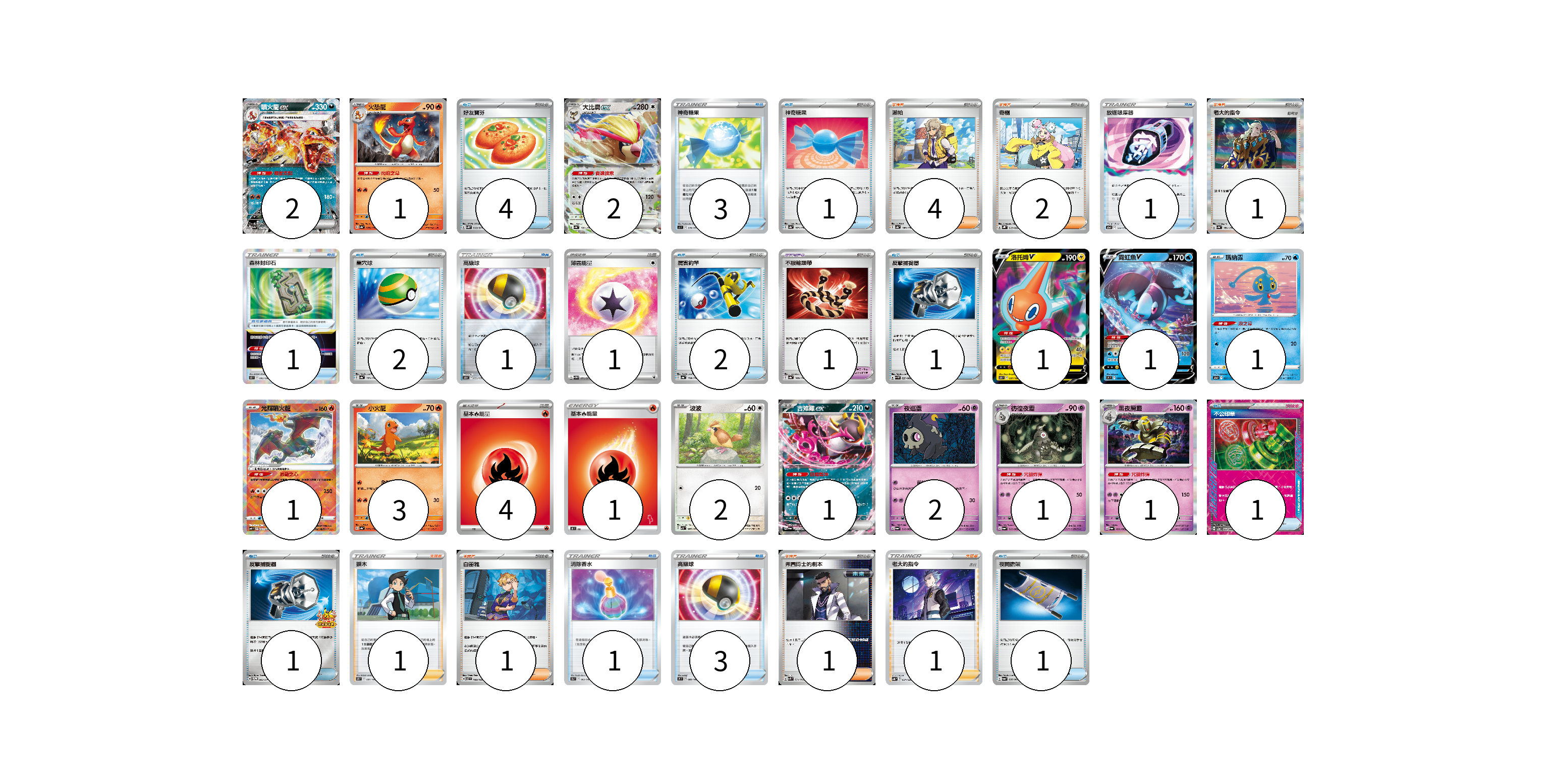 牌組構築方案 以此牌組為基礎新構築牌組 顯示卡面 顯示列表 寶可夢卡(19) 2 1 2 1 1 1 1 3 2 1 2 1 1 寶可夢道具(2) 1 1 物品卡(22) 4 3 1 1 2 1 2 1 1 1 1 3 1 支援者卡(11) 4 2 1 1 1 1 1 能量卡(6) 1 4 1 寶可夢卡(19) 卡牌名稱 張數 卡牌名稱 張數 噴火龍ex SV4a 115/190 02 火恐龍 SV4a 026/190 01 大比鳥ex SV4a 139/190 02 洛托姆V S11 037/100 01 霓虹魚V S9 030/100 01 瑪納霏 S12a 029/172 01 光輝噴火龍 SVF 001/038 01 小火龍 SV4a 025/190 03 波波 SV3 087/108 02 吉雉雞ex SV6a 038/064 01 夜巡靈 SV6a 018/064 02 彷徨夜靈 SV6a 019/064 01 黑夜魔靈 SV6a 020/064 01 寶可夢道具(2) 卡牌名稱 張數 卡牌名稱 張數 森林封印石 S12 092/098 01 不服輸頭帶 SV4a 168/190 01 物品卡(22) 卡牌名稱 張數 卡牌名稱 張數 好友寶芬 SV5K 063/071 04 神奇糖果 SI 376/414 03 神奇糖果 SV4a 163/190 01 放逐吸塵器 S12a 144/172 01 巢穴球 SV4a 159/190 02 高級球 SO 020/030 01 厲害釣竿 SV4a 158/190 02 反擊捕捉器 SV4M 059/066 01 不公印章 SV5a 053/066 01 反擊捕捉器 SV-P 083/SV-P 01 消除香水 S9a 063/067 01 高級球 S9 089/100 03 夜間擔架 SV6a 056/064 01 支援者卡(11) 卡牌名稱 張數 卡牌名稱 張數 派帕 SV4a 180/190 04 奇樹 SVHK 019/022 02 老大的指令 SV4a 181/190 01 捩木 S11 097/100 01 白蕾雅 SV7 100/102 01 弗圖博士的劇本 SVK 034/042 01 老大的指令(赤日) SVB 024/028 01 能量卡(6) 卡牌名稱 張數 卡牌名稱 張數 薄霧能量 SV5M 071/071 01 基本火能量 sv-p FIR 04 基本火能量 SH FIR 01 以此牌組為基礎新構築牌組 牌組編碼 yanugU-qCXEjr-ZwxmYy copy 列印牌組單 牌組編碼已複製 分享至SNS