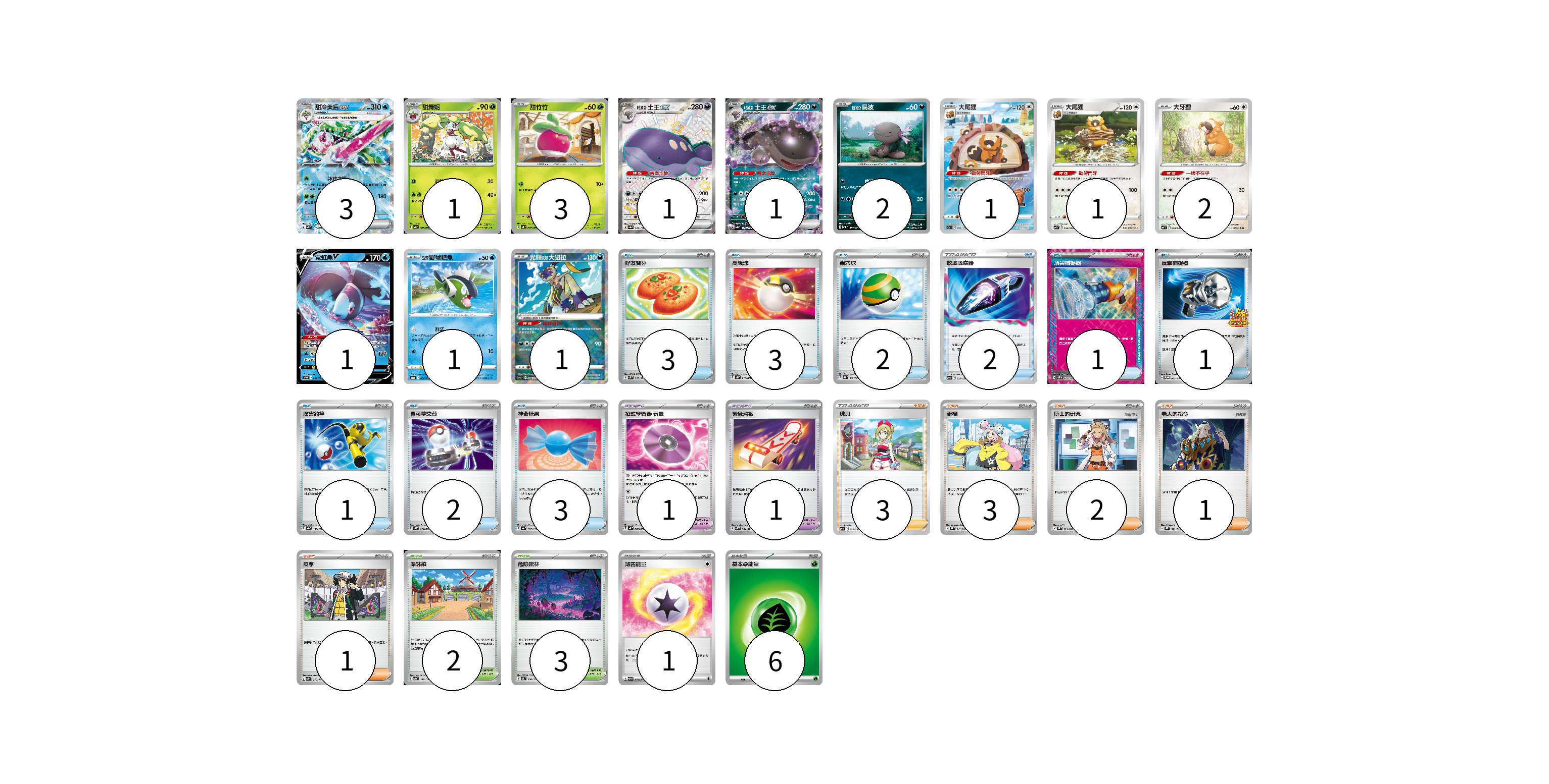 牌組構築方案 以此牌組為基礎新構築牌組 顯示卡面 顯示列表 寶可夢卡(18) 3 1 3 1 1 2 1 1 2 1 1 1 寶可夢道具(2) 1 1 物品卡(18) 3 3 2 2 1 1 1 2 3 支援者卡(10) 3 3 2 1 1 競技場卡(5) 2 3 能量卡(7) 1 6 寶可夢卡(18) 卡牌名稱 張數 卡牌名稱 張數 甜冷美后ex SV4K 020/066 03 甜舞妮 SV4K 007/066 01 甜竹竹 SV4K 006/066 03 帕底亞 土王ex SV4a 332/190 01 帕底亞 土王ex SV4a 117/190 01 帕底亞 烏波 SV3 067/108 02 大尾狸 S12a 200/172 01 大尾狸 SVF 009/038 01 大牙狸 SVF 008/038 02 霓虹魚V SVHK 004/022 01 洗翠 野蠻鱸魚 S12a 030/172 01 光輝洗翠 大狃拉 S10a 046/071 01 寶可夢道具(2) 卡牌名稱 張數 卡牌名稱 張數 招式學習器 衰退 SV4K 063/066 01 緊急滑板 SV5K 064/071 01 物品卡(18) 卡牌名稱 張數 卡牌名稱 張數 好友寶芬 SV5K 063/071 03 高級球 SVHK 013/022 03 巢穴球 SVHK 012/022 02 放逐吸塵器 SVF 023/038 02 頂尖捕捉器 SV5M 062/071 01 反擊捕捉器 SV-P 083/SV-P 01 厲害釣竿 SV4a 158/190 01 寶可夢交替 SVHK 014/022 02 神奇糖果 SV4a 163/190 03 支援者卡(10) 卡牌名稱 張數 卡牌名稱 張數 珠貝 SVF 025/038 03 奇樹 SVHK 019/022 03 博士的研究 SVHK 021/022 02 老大的指令 SVHK 022/022 01 皮拿 SV2P 069/071 01 競技場卡(5) 卡牌名稱 張數 卡牌名稱 張數 深缽鎮 SV4a 185/190 02 危險密林 SV5K 070/071 03 能量卡(7) 卡牌名稱 張數 卡牌名稱 張數 薄霧能量 SV5M 071/071 01 基本【草】能量 SVF GRA 06 以此牌組為基礎新構築牌組 牌組編碼 yayqHe-YMlayc-PEMyny copy 列印牌組單 牌組編碼已複製 分享至SNS