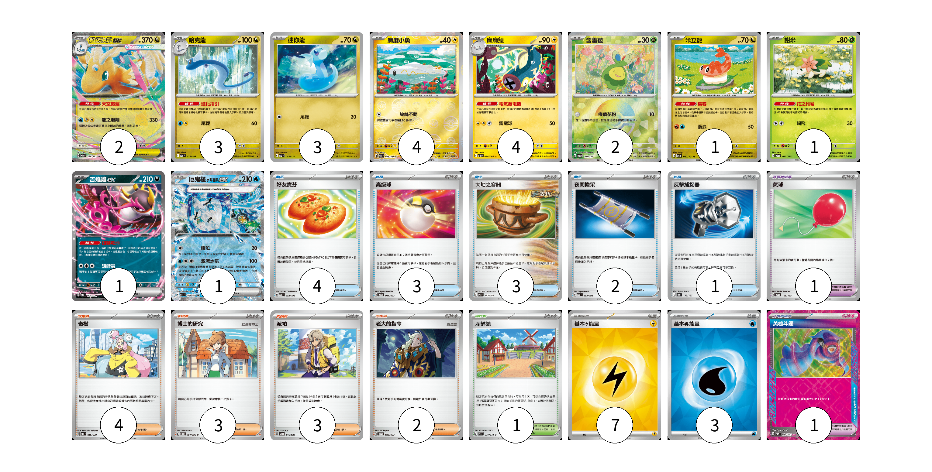 牌組構築方案 以此牌組為基礎新構築牌組 顯示卡面 顯示列表 寶可夢卡(22) 2 3 3 4 4 2 1 1 1 1 寶可夢道具(2) 1 1 物品卡(13) 4 3 3 2 1 支援者卡(12) 4 3 3 2 競技場卡(1) 1 能量卡(10) 7 3 寶可夢卡(22) 卡牌名稱 張數 卡牌名稱 張數 超級快龍ex M2a 126/193 02 哈克龍 M2a 125/193 03 迷你龍 SVD 088/139 03 麻麻小魚 SV11B 033/086 04 麻麻鰻 SV11B 034/086 04 含羞苞 SV8a 001/187 02 米立龍 SV6 082/101 01 謝米 M2a 012/193 01 吉雉雞ex SVOD 004/020 01 厄鬼椪 水井面具ex SV8a 050/187 01 寶可夢道具(2) 卡牌名稱 張數 卡牌名稱 張數 氣球 M2a 165/193 01 英雄斗篷 SV5M 064/071 01 物品卡(13) 卡牌名稱 張數 卡牌名稱 張數 好友寶芬 M2a 153/193 04 高級球 MBD 014/022 03 大地之容器 SV8a 143/187 03 夜間擔架 M2a 159/193 02 反擊捕捉器 SV8a 139/187 01 支援者卡(12) 卡牌名稱 張數 卡牌名稱 張數 奇樹 SVOD 016/020 04 博士的研究 SV11B 084/086 03 派帕 SVOD 018/020 03 老大的指令 MBD 020/022 02 競技場卡(1) 卡牌名稱 張數 卡牌名稱 張數 深缽鎮 SV1a 070/073 01 能量卡(10) 卡牌名稱 張數 卡牌名稱 張數 基本【雷】能量 SVQP LIG 07 基本【水】能量 SVK WAT 03 以此牌組為基礎新構築牌組 牌組編碼 ydWtRJ-eymImj-fdtyDo copy 列印牌組單 牌組編碼已複製 分享至SNS