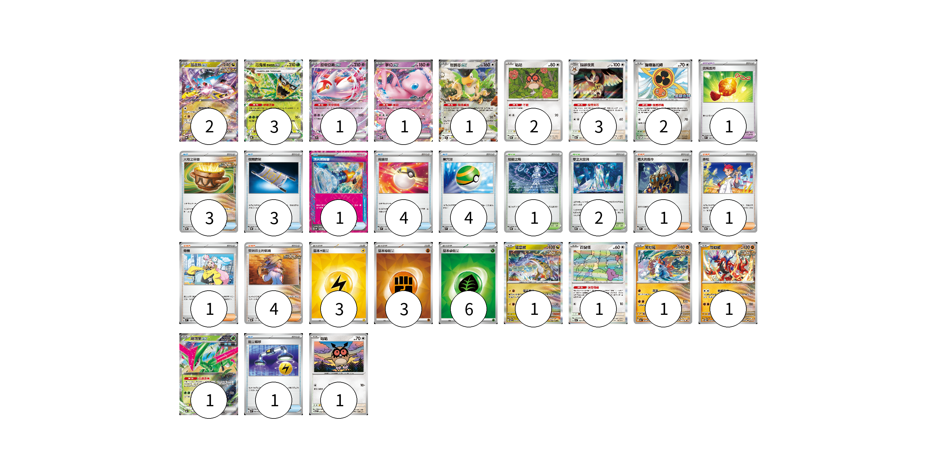 牌組構築方案 以此牌組為基礎新構築牌組 顯示卡面 顯示列表 寶可夢卡(21) 2 3 1 1 1 2 3 2 1 1 1 1 1 1 寶可夢道具(1) 1 物品卡(16) 3 3 1 4 4 1 支援者卡(7) 1 1 1 4 競技場卡(3) 1 2 能量卡(12) 3 3 6 寶可夢卡(21) 卡牌名稱 張數 卡牌名稱 張數 猛雷鼓ex SV8a 124/187 02 厄鬼椪 碧草面具ex SV8a 020/187 03 拉帝亞斯ex SV7a 019/064 01 夢幻ex SVK 001/042 01 怒鸚哥ex SV4a 154/190 01 咕咕 SV8a 127/187 02 貓頭夜鷹 SV8a 128/187 03 旋轉洛托姆 SV-P 146/SV-P 02 猛雷鼓 SV7 075/102 01 百變怪 SV4a 144/190 01 爬地翅 SV4K 041/066 01 故勒頓 SV8 069/106 01 鐵斑葉ex SV8a 016/187 01 咕咕 SV7 076/102 01 寶可夢道具(1) 卡牌名稱 張數 卡牌名稱 張數 勇氣護符 SVM 142/175 01 物品卡(16) 卡牌名稱 張數 卡牌名稱 張數 大地之容器 SV8a 143/187 03 夜間擔架 SV8a 151/187 03 頂尖捕捉器 SV8a 148/187 01 高級球 SVM 134/175 04 巢穴球 SVM 133/175 04 能量轉移 SVK 008/042 01 支援者卡(7) 卡牌名稱 張數 卡牌名稱 張數 老大的指令 SVM 172/175 01 赤松 SV8a 163/187 01 奇樹 SVM 160/175 01 奧琳博士的氣魄 SV8a 167/187 04 競技場卡(3) 卡牌名稱 張數 卡牌名稱 張數 阻礙之塔 SV8a 181/187 01 零之大空洞 SV8a 182/187 02 能量卡(12) 卡牌名稱 張數 卡牌名稱 張數 基本【雷】能量 SVK LIG 03 基本【鬥】能量 SVK FIG 03 基本【草】能量 SVK GRA 06 以此牌組為基礎新構築牌組 牌組編碼 yeiwJU-vcHoJP-xhVcGm copy 列印牌組單 牌組編碼已複製 分享至SNS