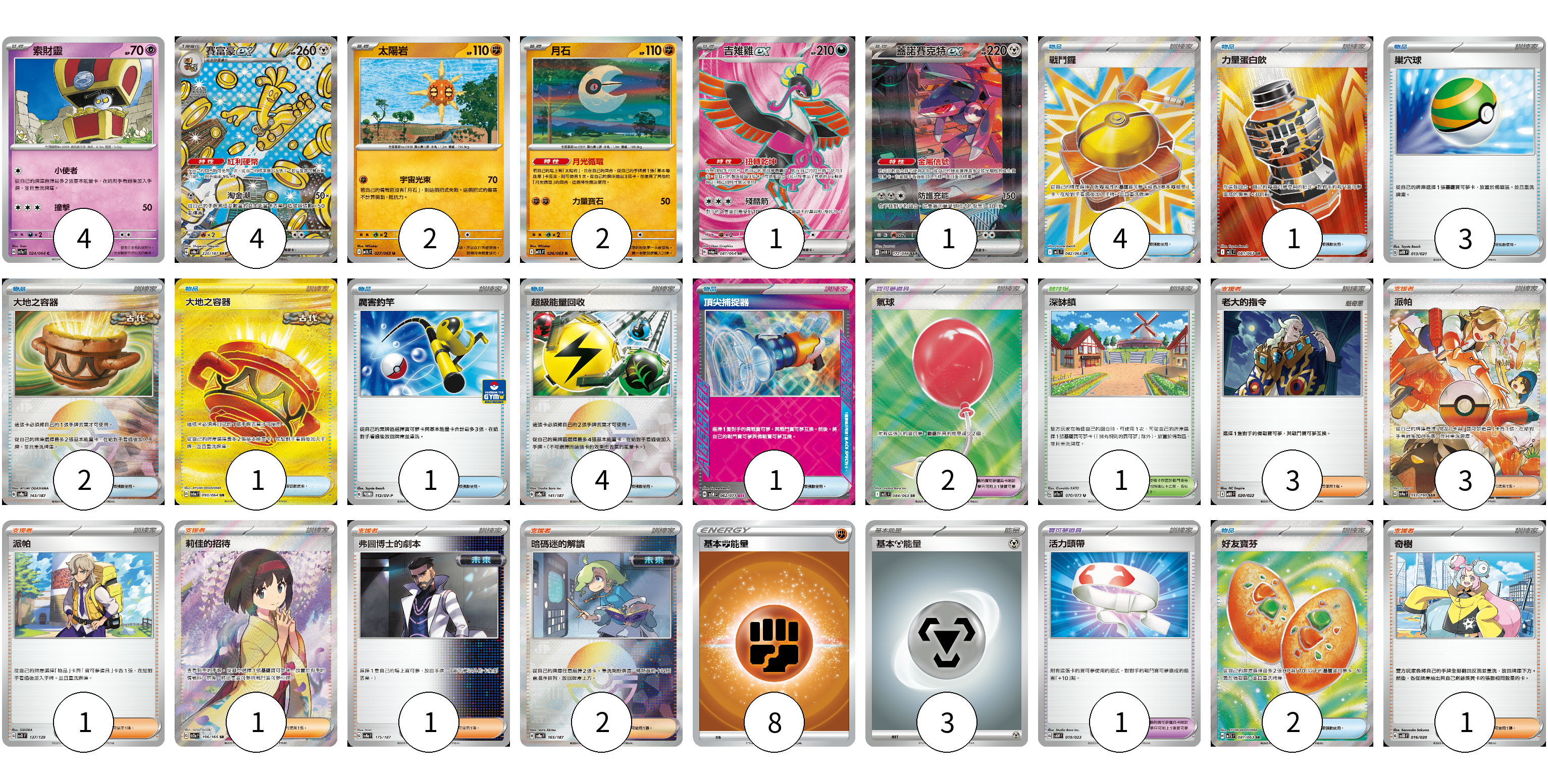 牌組構築方案 以此牌組為基礎新構築牌組 顯示卡面 顯示列表 寶可夢卡(14) 4 4 2 2 1 1 寶可夢道具(3) 2 1 物品卡(19) 4 1 3 2 1 1 4 1 2 支援者卡(12) 3 3 1 1 1 2 1 競技場卡(1) 1 能量卡(11) 8 3 寶可夢卡(14) 卡牌名稱 張數 卡牌名稱 張數 索財靈 SV7a 024/064 04 賽富豪ex SV8a 220/187 04 太陽岩 M1L 027/063 02 月石 M1L 026/063 02 吉雉雞ex SV6a 081/064 01 蓋諾賽克特ex SV11B 172/086 01 寶可夢道具(3) 卡牌名稱 張數 卡牌名稱 張數 氣球 M1L 084/063 02 活力頭帶 SVAW 019/023 01 物品卡(19) 卡牌名稱 張數 卡牌名稱 張數 戰鬥鑼 M1L 082/063 04 力量蛋白飲 M1L 081/063 01 巢穴球 SVTR 013/021 03 大地之容器 SV8a 143/187 02 大地之容器 SV6a 093/064 01 厲害釣竿 SV-P 112/SV-P 01 超級能量回收 SV8a 141/187 04 頂尖捕捉器 SV5M 062/071 01 好友寶芬 M1S 081/063 02 支援者卡(12) 卡牌名稱 張數 卡牌名稱 張數 老大的指令 MBD 020/022 03 派帕 SV4a 353/190 03 派帕 SVD 137/139 01 莉佳的招待[支援者] SV2a 196/165 01 弗圖博士的劇本 SV8a 175/187 01 暗碼迷的解讀 SV8a 165/187 02 奇樹 SVOD 016/020 01 競技場卡(1) 卡牌名稱 張數 卡牌名稱 張數 深缽鎮 SV1a 070/073 01 能量卡(11) 卡牌名稱 張數 卡牌名稱 張數 基本鬥能量 SLL FIG 08 基本鋼能量 sv-p MET 03 以此牌組為基礎新構築牌組 牌組編碼 ygAAuK-nmuZYi-djOKvY copy 列印牌組單 牌組編碼已複製 分享至SNS