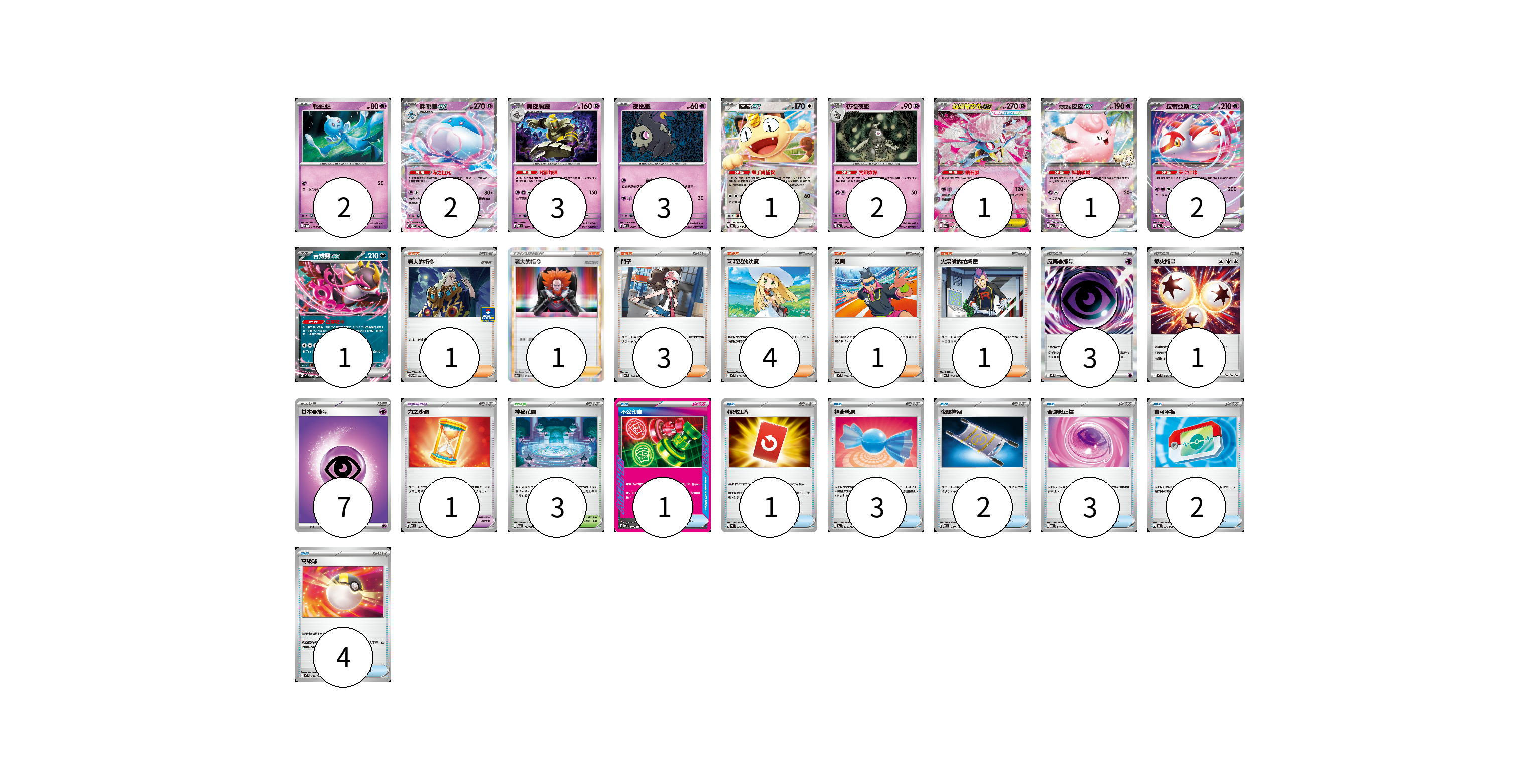 牌組構築方案 以此牌組為基礎新構築牌組 顯示卡面 顯示列表 寶可夢卡(18) 2 2 3 3 1 2 1 1 2 1 寶可夢道具(1) 1 物品卡(16) 1 1 3 2 3 2 4 支援者卡(11) 1 1 3 4 1 1 競技場卡(3) 3 能量卡(11) 3 1 7 寶可夢卡(18) 卡牌名稱 張數 卡牌名稱 張數 輕飄飄 SV11W 041/086 02 胖嘟嘟ex SV11W 042/086 02 黑夜魔靈 MC 310/742 03 夜巡靈 MC 308/742 03 喵喵ex M3 061/080 01 彷徨夜靈 MC 309/742 02 超級蒂安希ex MBD 006/022 01 莉莉艾的皮皮ex M2a 060/193 01 拉帝亞斯ex MC 312/742 02 吉雉雞ex MC 489/742 01 寶可夢道具(1) 卡牌名稱 張數 卡牌名稱 張數 力之沙漏 MC 683/742 01 物品卡(16) 卡牌名稱 張數 卡牌名稱 張數 不公印章 MC 633/742 01 特殊紅牌 M4 072/083 01 神奇糖果 MC 655/742 03 夜間擔架 MC 670/742 02 奇跡修正檔 MBD 017/022 03 寶可平板 M3 070/080 02 高級球 MC 651/742 04 支援者卡(11) 卡牌名稱 張數 卡牌名稱 張數 老大的指令 SV-P 178/SV-P 01 老大的指令(弗拉達利) S8b 158/184 01 鬥子 MC 718/742 03 莉莉艾的決意 MC 729/742 04 裁判 MC 711/742 01 火箭隊的拉姆達 MC 734/742 01 競技場卡(3) 卡牌名稱 張數 卡牌名稱 張數 神秘花園 M2a 187/193 03 能量卡(11) 卡牌名稱 張數 卡牌名稱 張數 感應【超】能量 M3 079/080 03 燃火能量 MC 736/742 01 基本【超】能量 M-P PSY 07 以此牌組為基礎新構築牌組 牌組編碼 yhlSNd-WManBe-YQLGFH copy 列印牌組單 牌組編碼已複製 分享至SNS