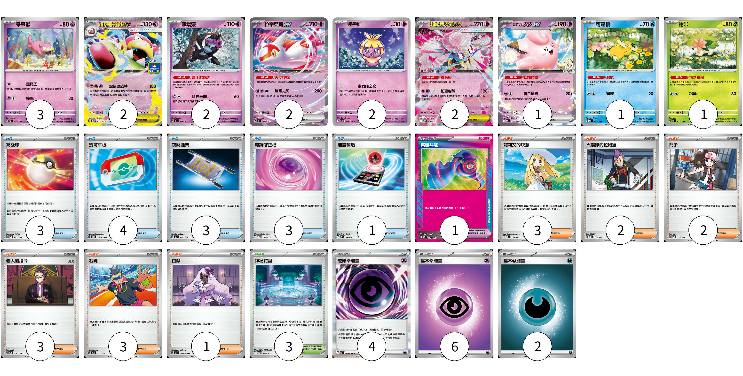 牌組構築方案 以此牌組為基礎新構築牌組 顯示卡面 顯示列表 寶可夢卡(16) 3 2 2 2 2 2 1 1 1 寶可夢道具(1) 1 物品卡(14) 3 4 3 3 1 支援者卡(14) 3 2 2 3 3 1 競技場卡(3) 3 能量卡(12) 4 6 2 寶可夢卡(16) 卡牌名稱 張數 卡牌名稱 張數 呆呆獸 SV7 038/102 03 超級呆殼獸ex M-P 077/M-P 02 願增猿 MC 358/742 02 拉帝亞斯ex MC 312/742 02 迷唇娃 SV7a 018/064 02 超級蒂安希ex MBD 006/022 02 <莉莉艾的>皮皮ex MC 287/742 01 可達鴨 M2a 032/193 01 謝米 M2a 012/193 01 寶可夢道具(1) 卡牌名稱 張數 卡牌名稱 張數 英雄斗篷 MC 687/742 01 物品卡(14) 卡牌名稱 張數 卡牌名稱 張數 高級球 MC 651/742 03 寶可平板 M3 070/080 04 夜間擔架 MC 670/742 03 奇跡修正檔 MBD 017/022 03 能量輸送 MC 639/742 01 支援者卡(14) 卡牌名稱 張數 卡牌名稱 張數 莉莉艾的決意 MC 729/742 03 火箭隊的拉姆達 MC 734/742 02 鬥子 MC 718/742 02 老大的指令 MC 724/742 03 裁判 MC 711/742 03 由紫 M3 076/080 01 競技場卡(3) 卡牌名稱 張數 卡牌名稱 張數 神秘花園 M2a 187/193 03 能量卡(12) 卡牌名稱 張數 卡牌名稱 張數 感應【超】能量 M3 079/080 04 基本【超】能量 MC PSY 06 基本【惡】能量 MC DAR 02 以此牌組為基礎新構築牌組 牌組編碼 yiixKu-QqINGe-bqSXrv copy 列印牌組單 牌組編碼已複製 分享至SNS